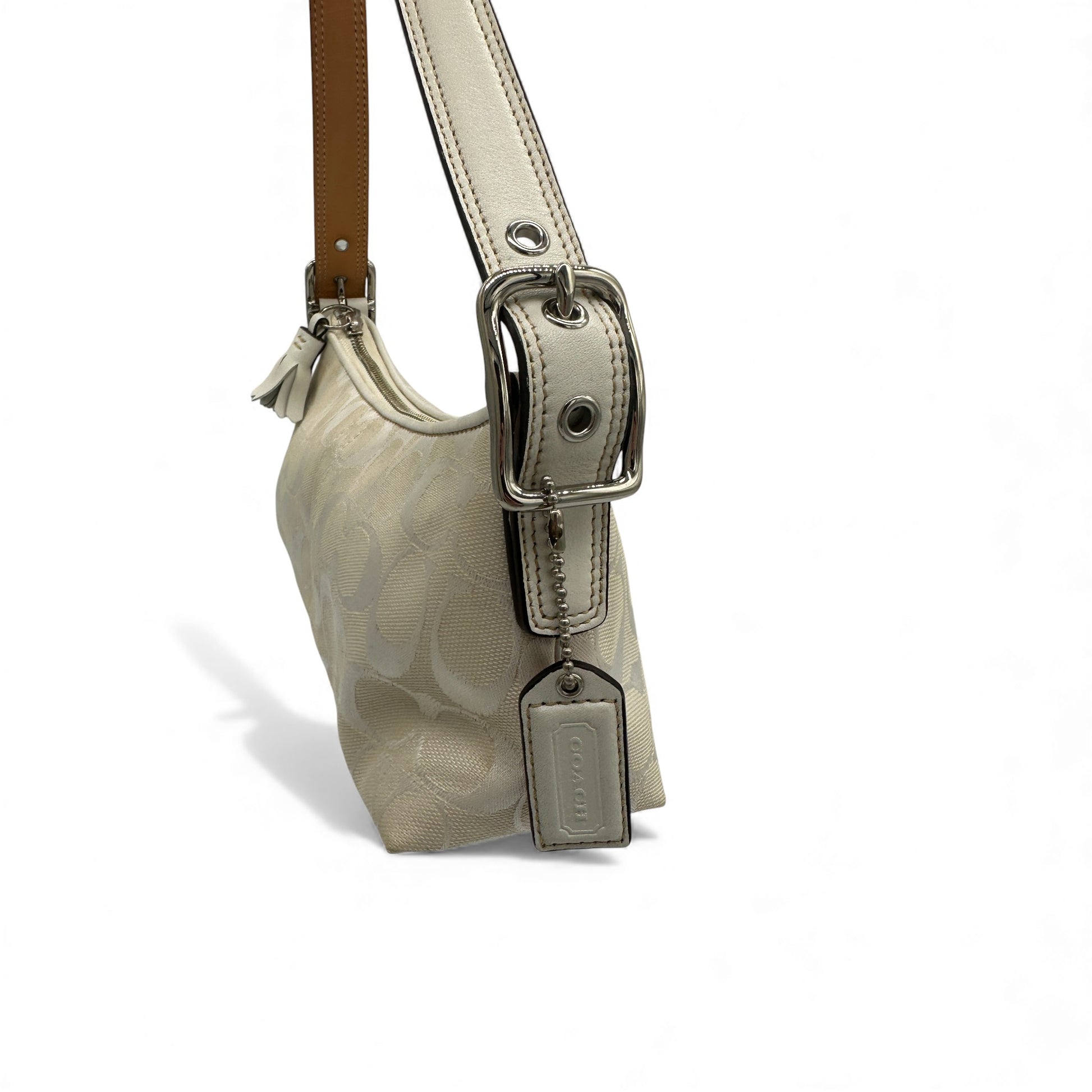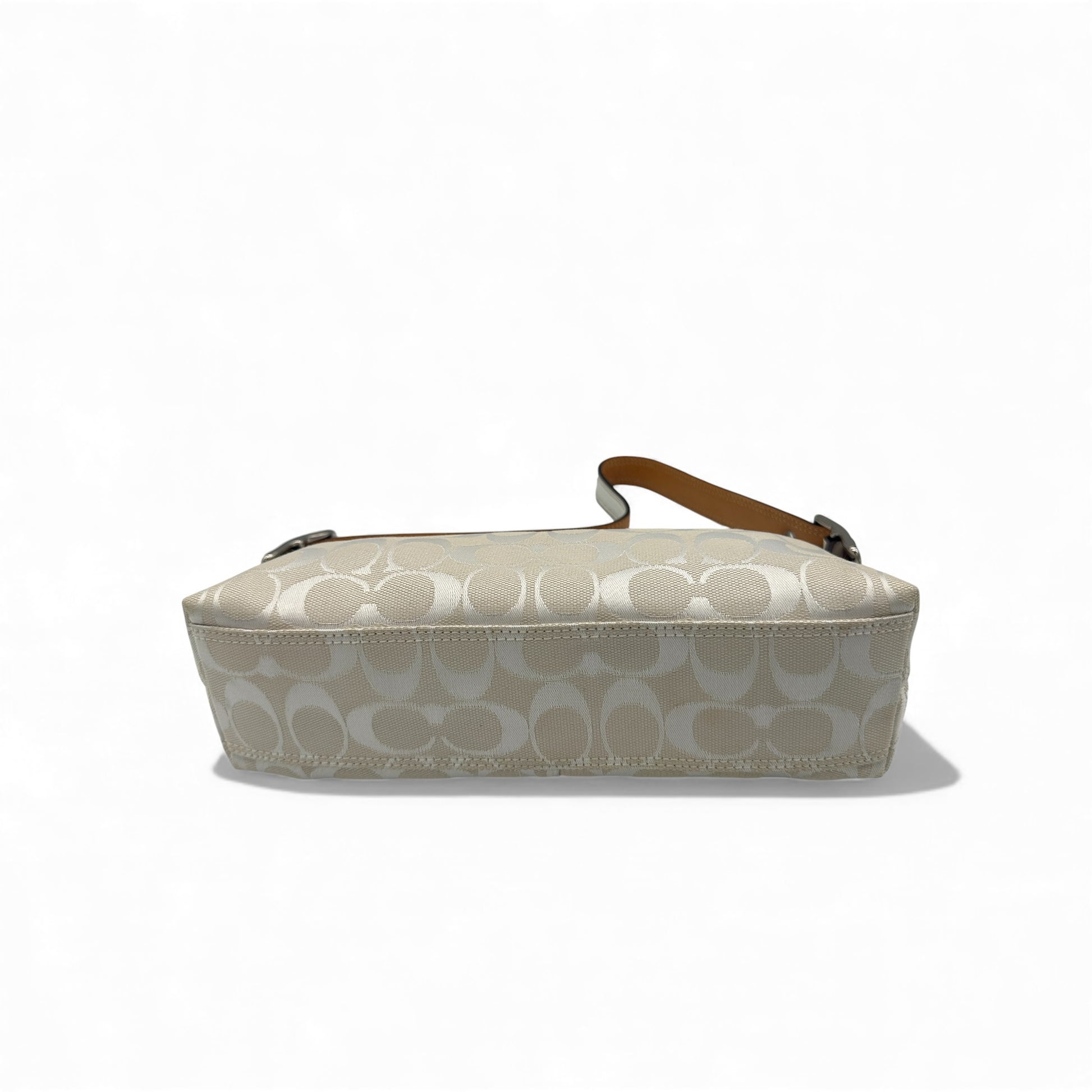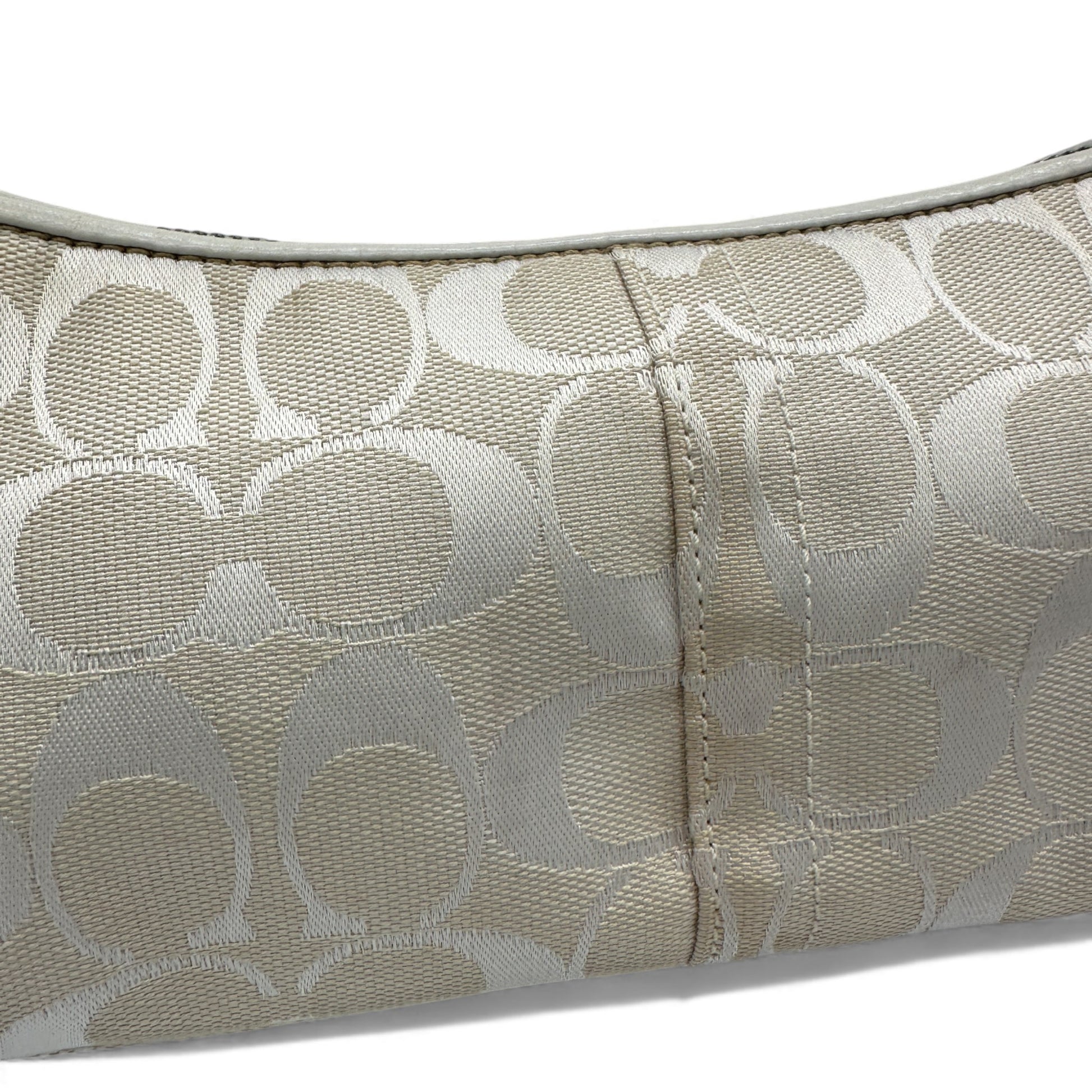 Model and style: Vintage Coach 8K01 East West Baguette Shoulder Bag. In rare white and silver signature monogram, trimmed with white leather and silver buckle hardware. A Y2K piece from 2005.