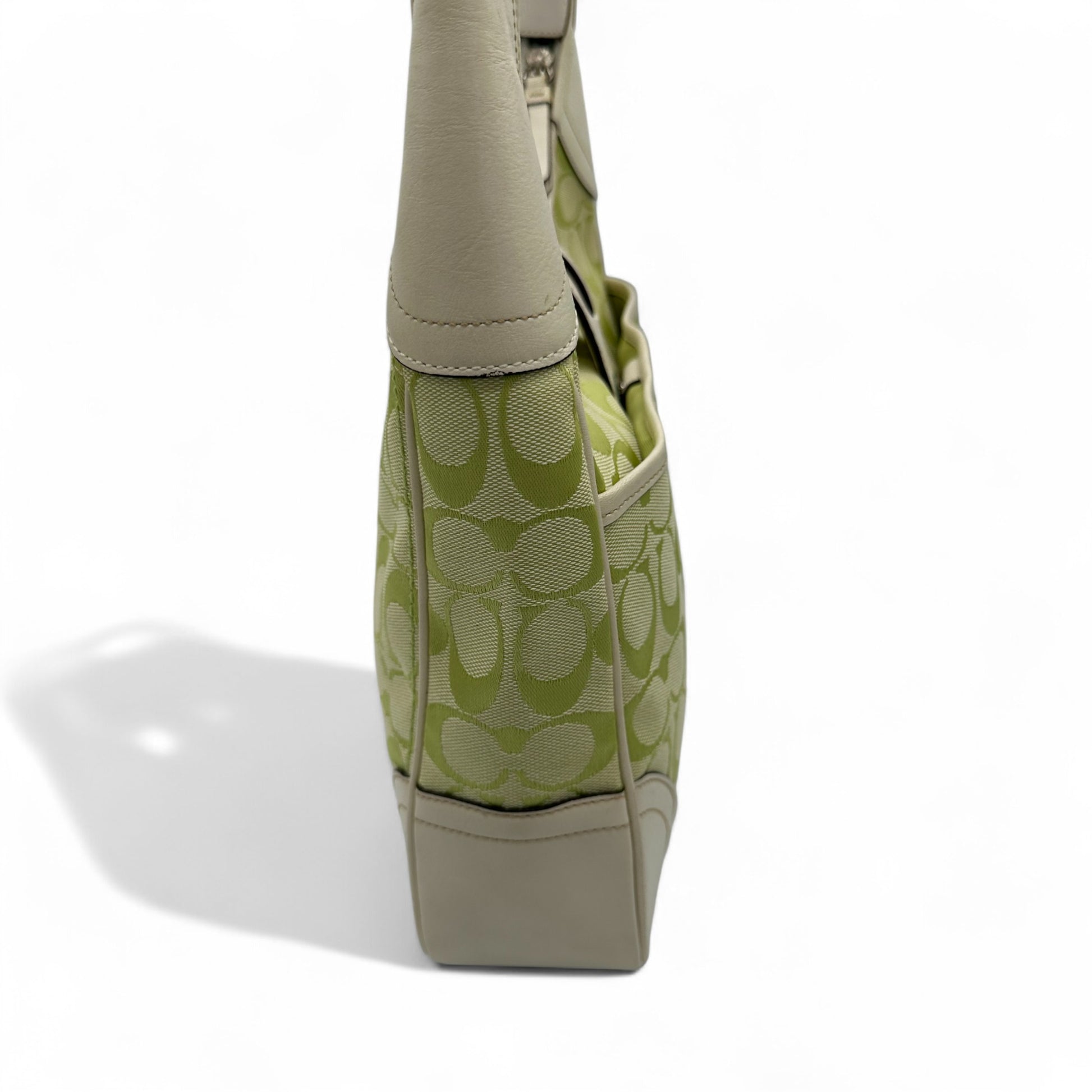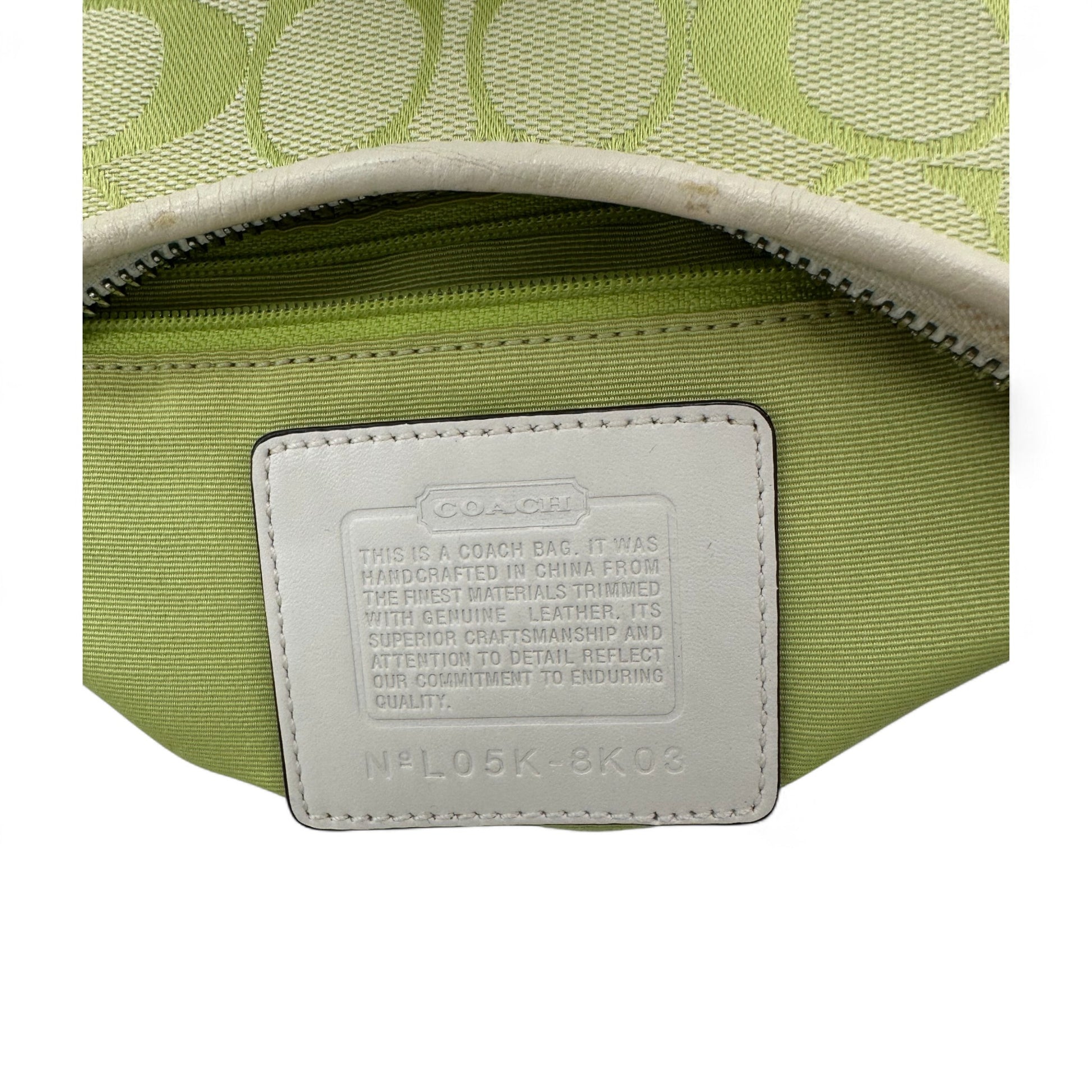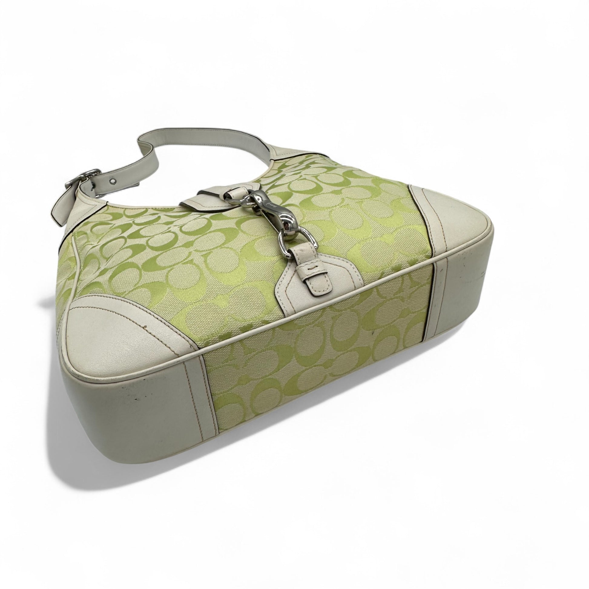 Model and style: Vintage Coach 8K03 Hampton Clip Shoulder Bag in rare lime green signature monogram with white leather trim and silver hardware.
