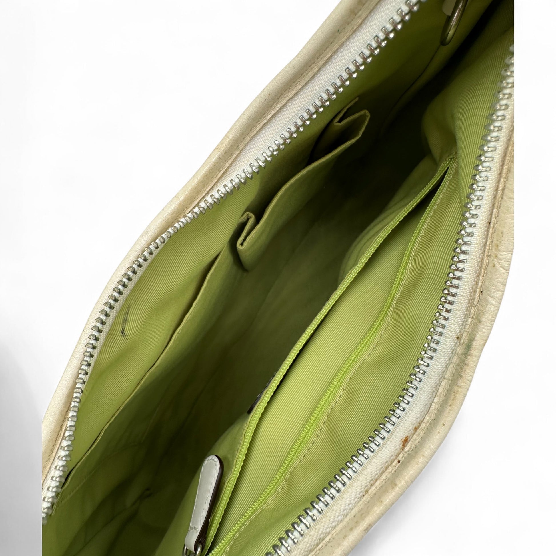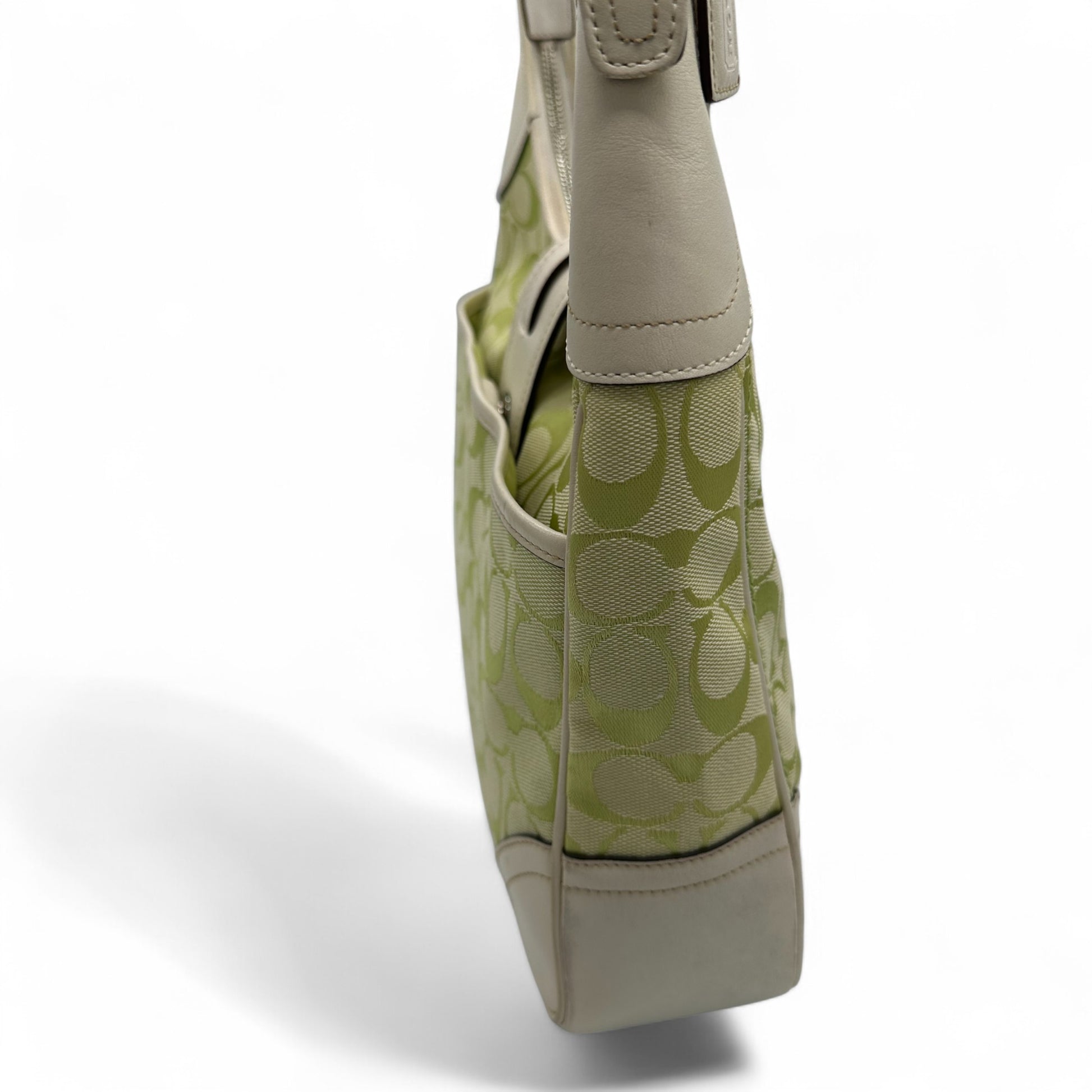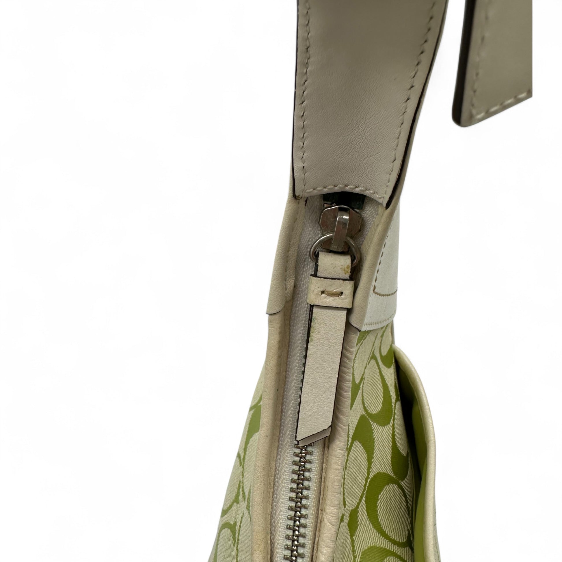 Model and style: Vintage Coach 8K03 Hampton Clip Shoulder Bag in rare lime green signature monogram with white leather trim and silver hardware.