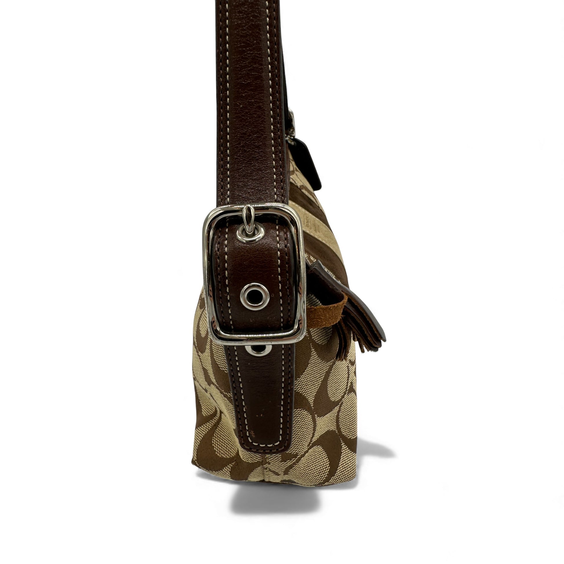 Vintage Coach 8K09 East West Baguette Shoulder Bag. In brown and beige signature monogram, with brown suede accents. A Y2K piece from 2005.