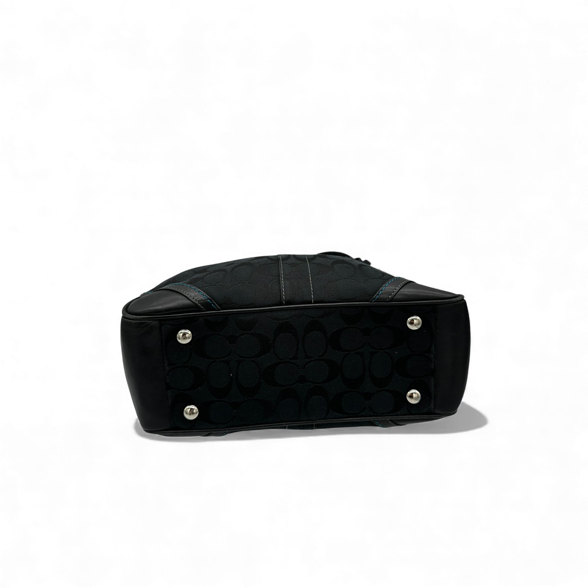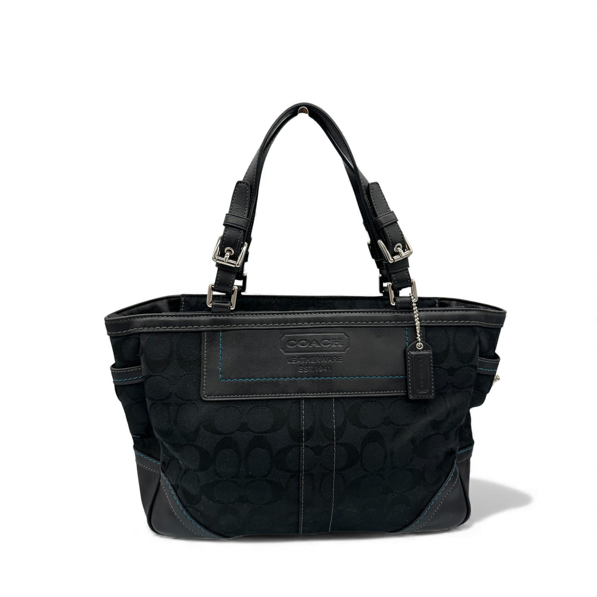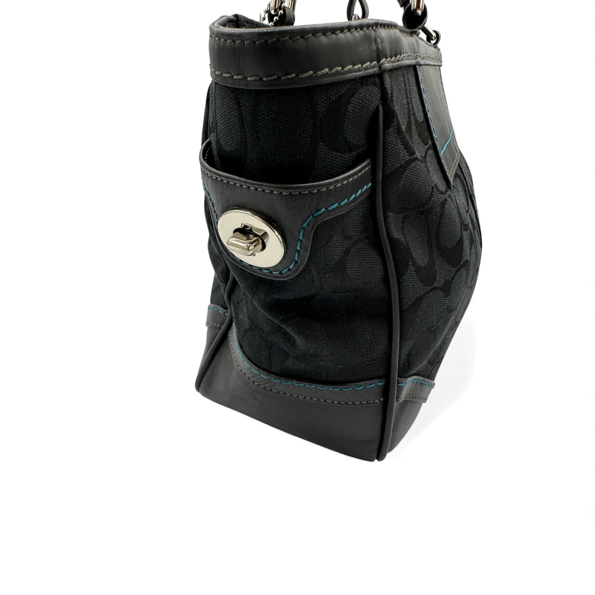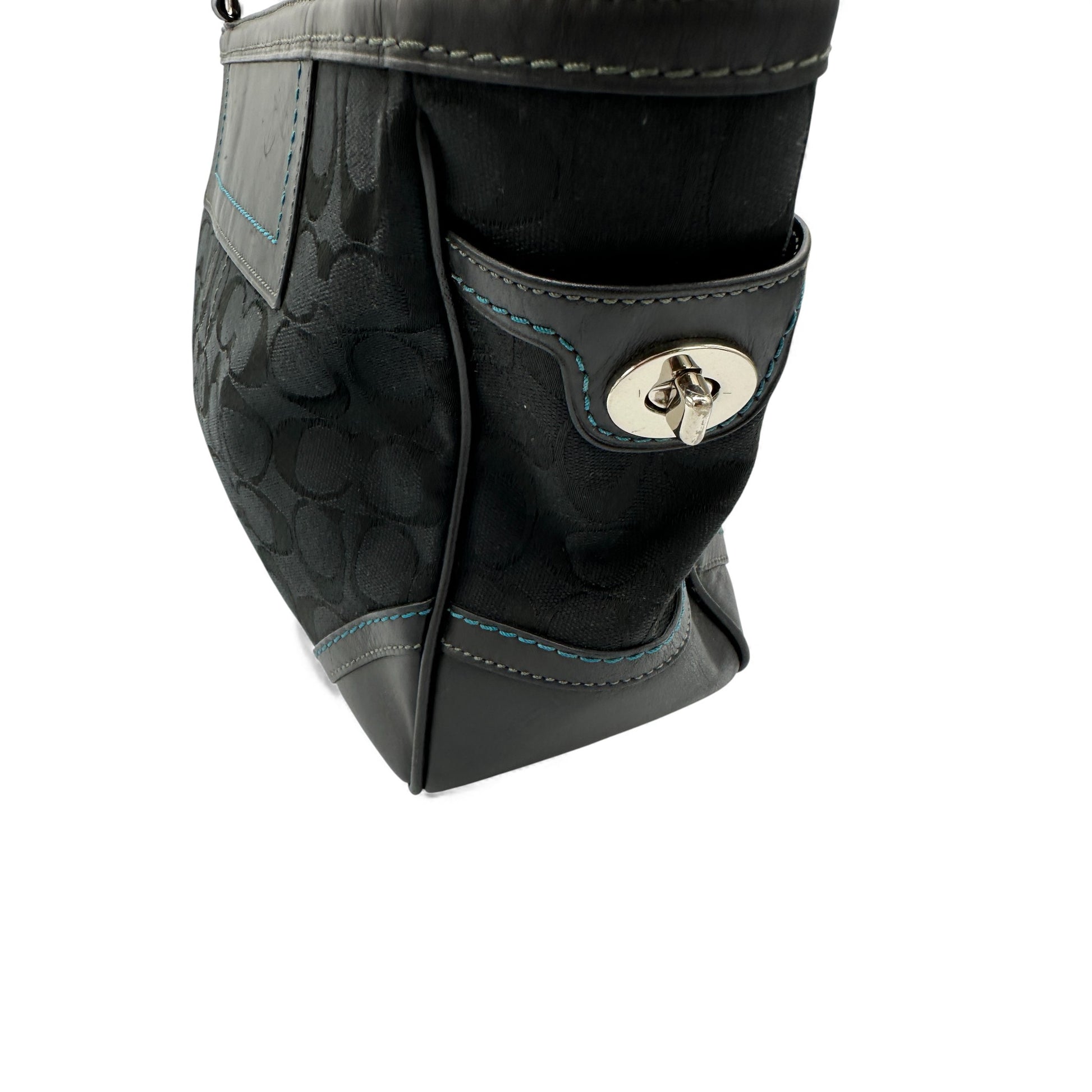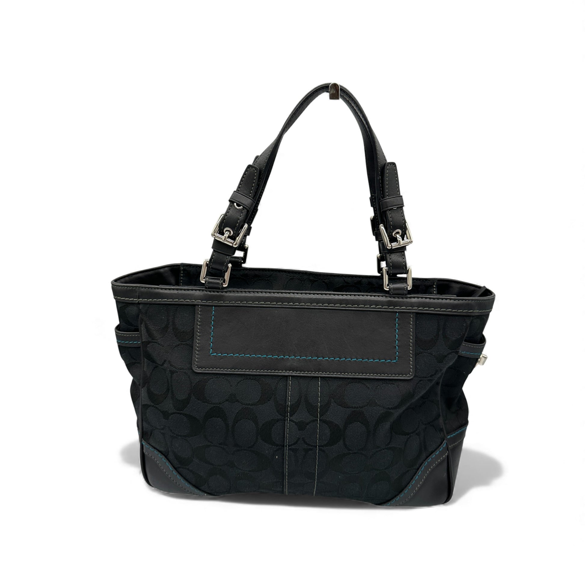Vintage Coach 8K49 Tote Handbag. In black signature monogram with black leather trim, silver-tone hardware and blue stitching detailing.