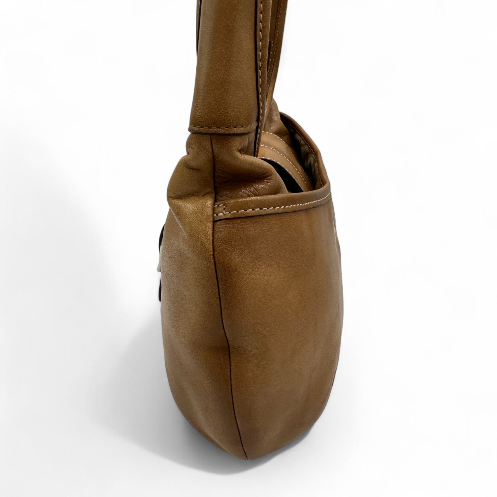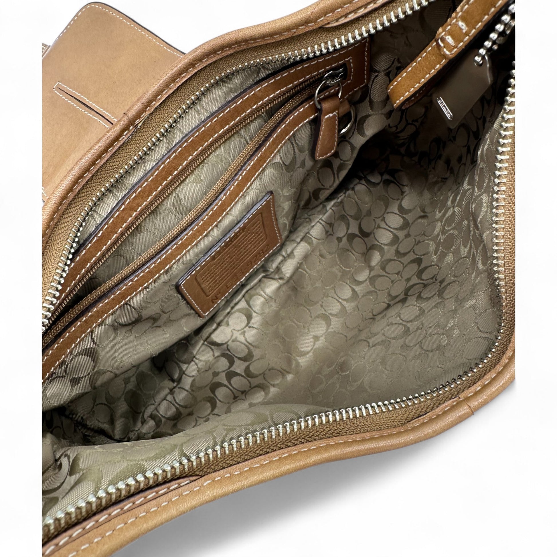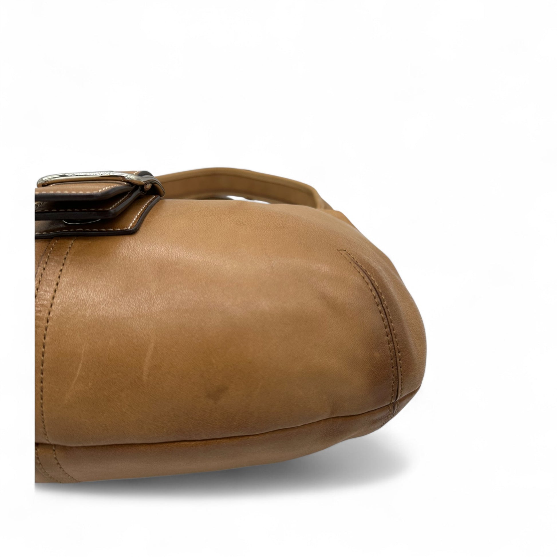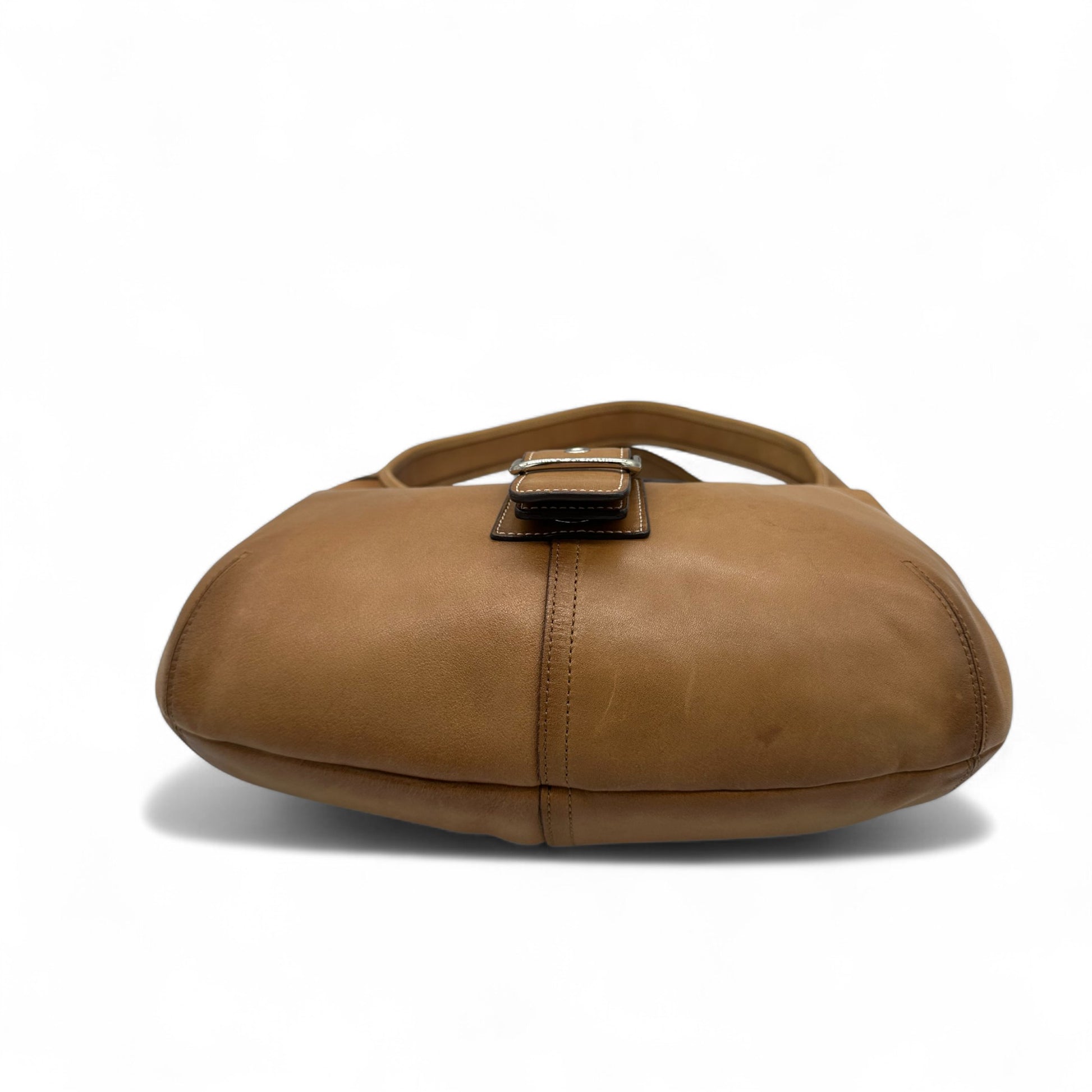 Model and style: Vintage Coach 9282 Soho Buckle Leather Shoulder Bag. In tan brown leather with silver buckle hardware.