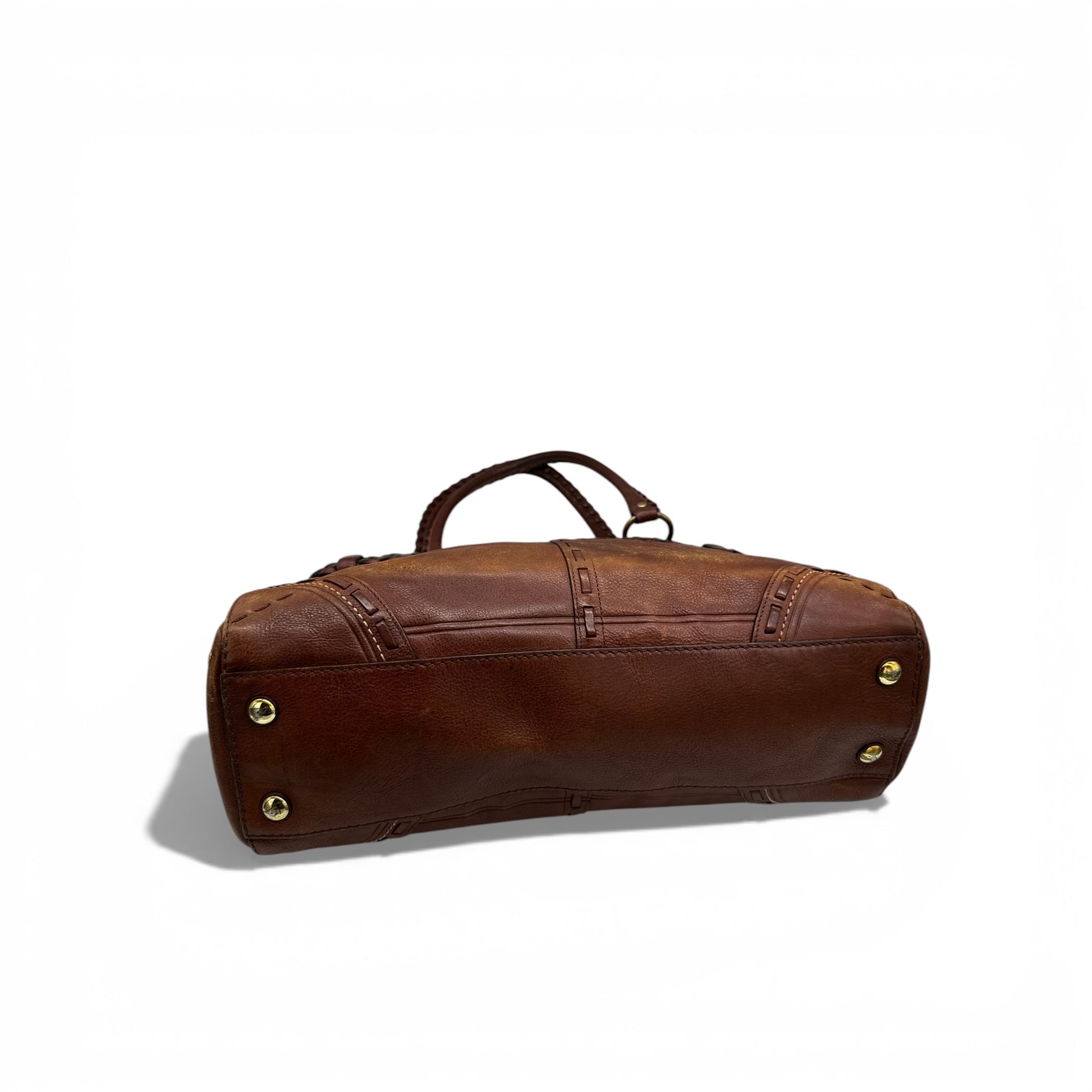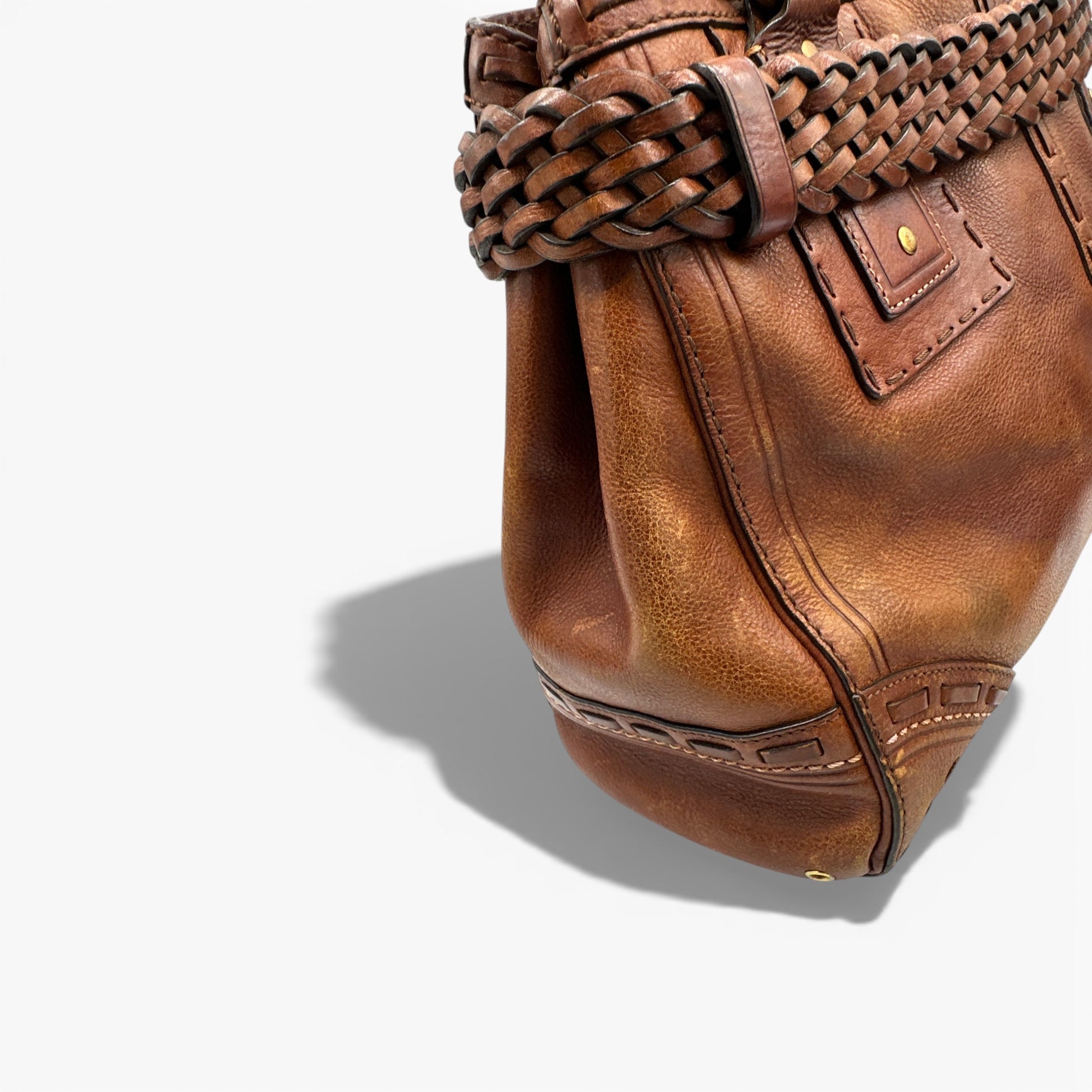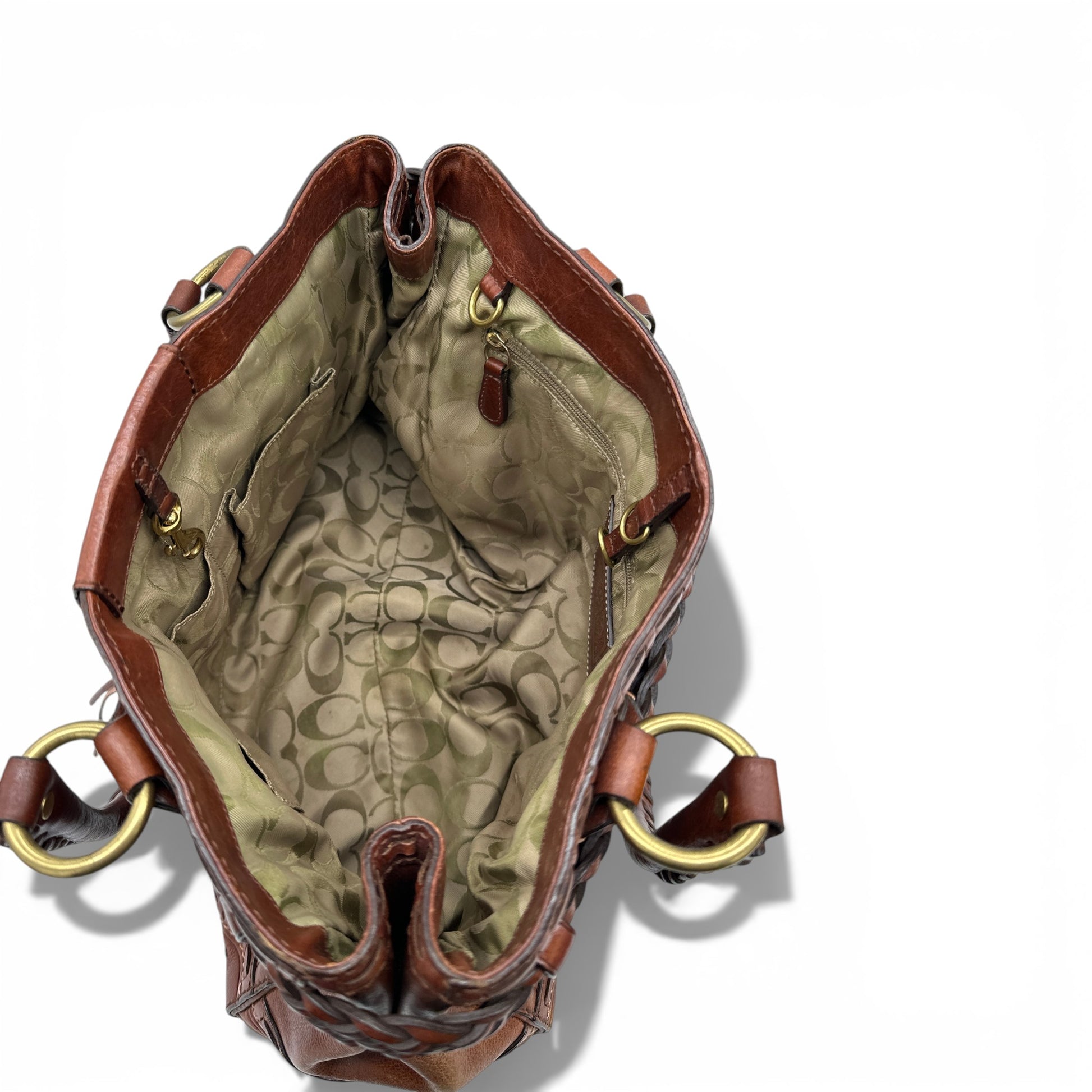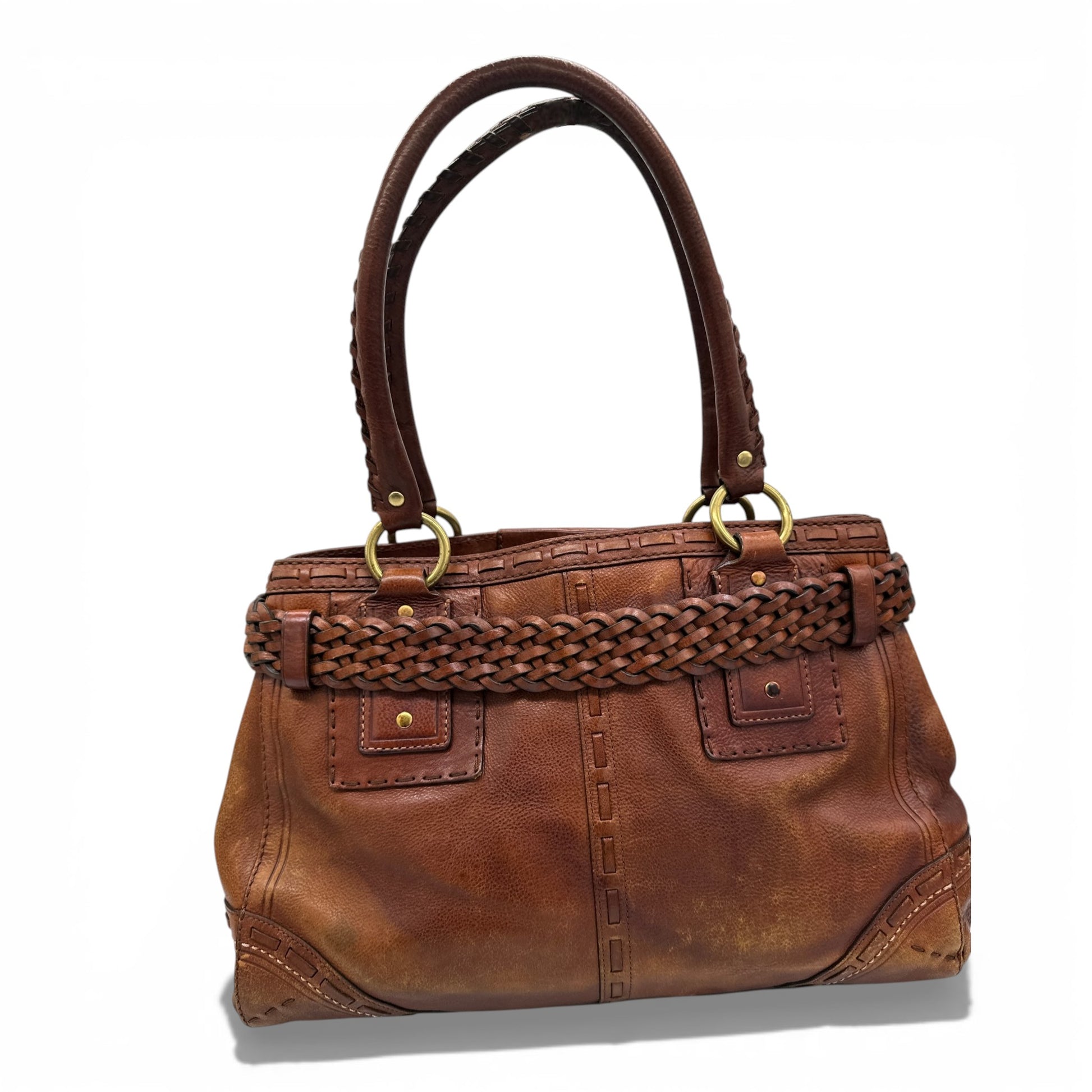 Vintage Coach 9290 Hamptons Clip Tote Handbag, an extremely rare Y2K piece from 2005. Made from rich brown natural full grain leather, with braided belt detail and brass Hampton clip hardware and clip fastening.