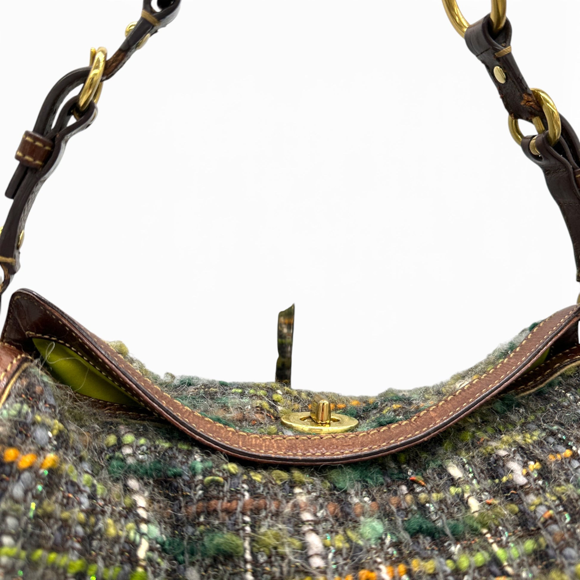 Vintage Coach 8F16 Legacy Tweed Shoulder Bag, in grey and green soft wool tweed, trimmed with brown leather and suede, with gold-tone brass hardware. A rare Y2K piece from 2005.