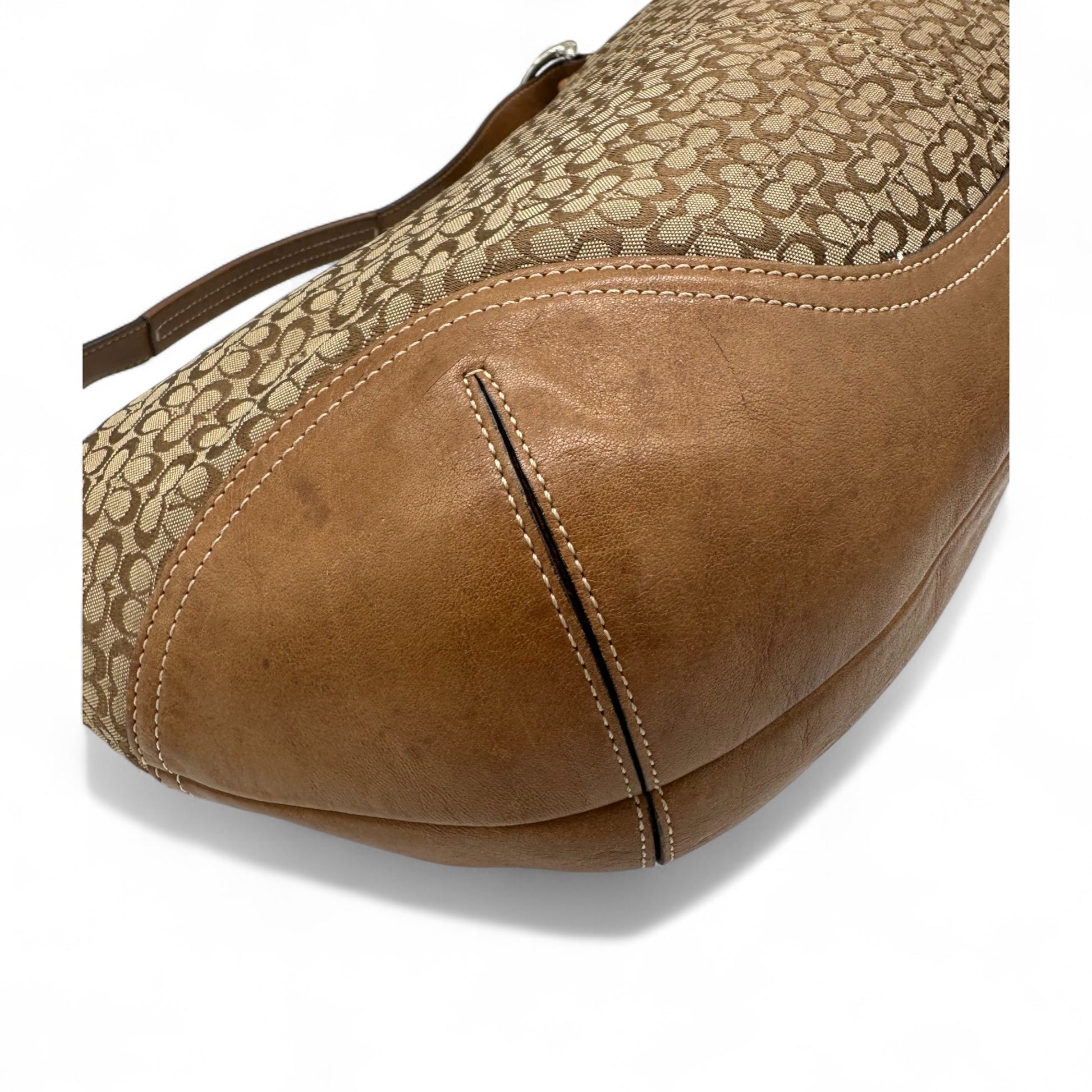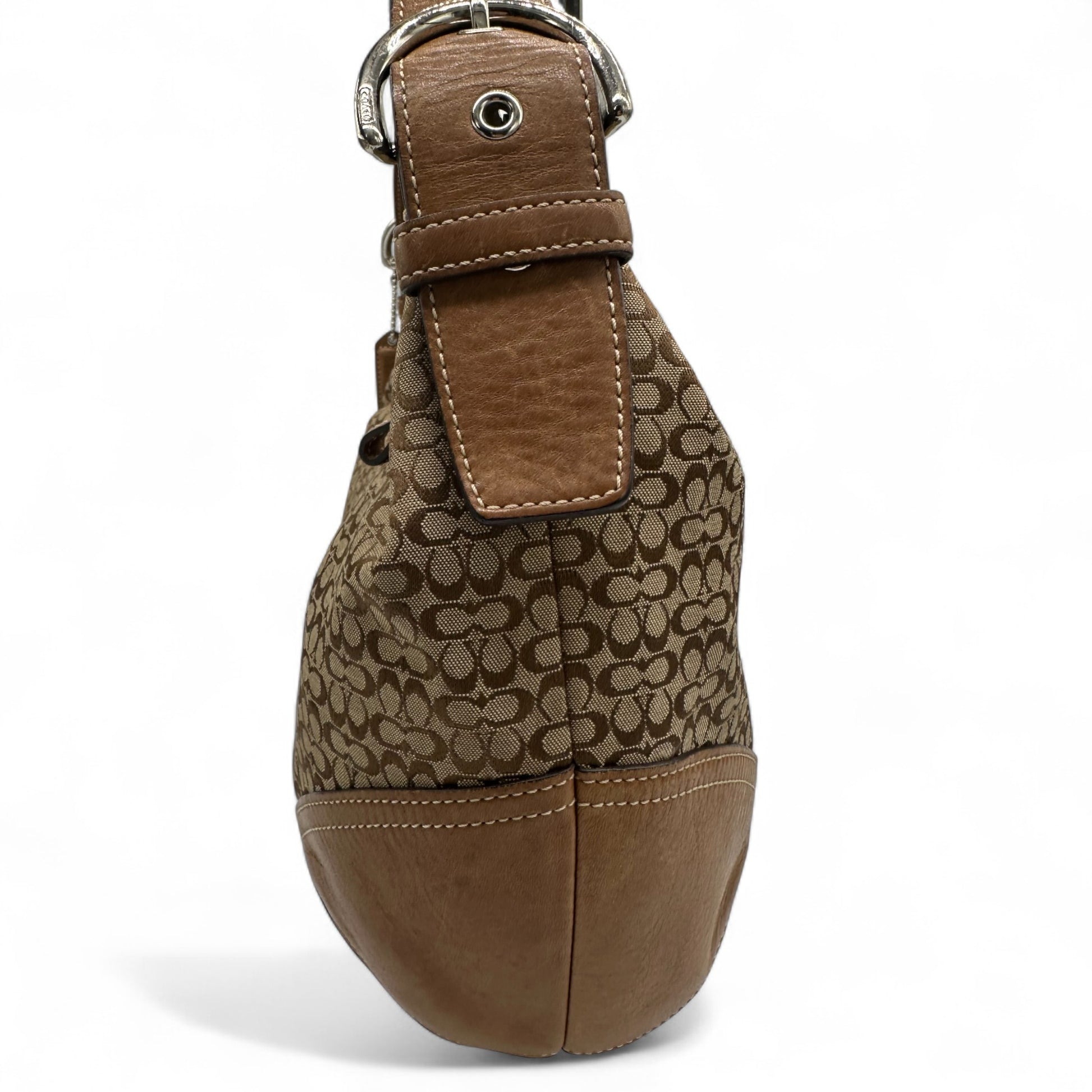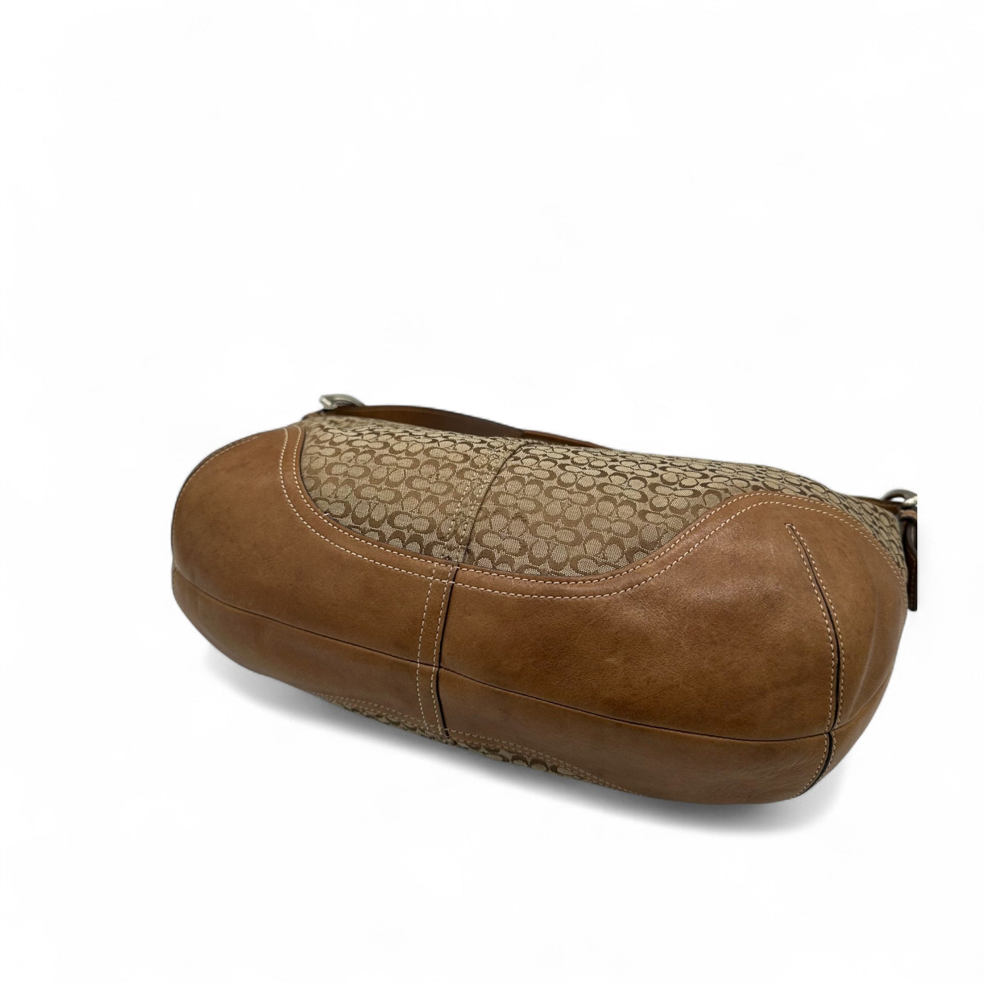 Model and style: Vintage Coach Croissant 6385 Slouchy Shoulder Bag. In brown and beige mini monogram, trimmed with tan brown leather. With silver Soho buckle detailing and slouchy design.