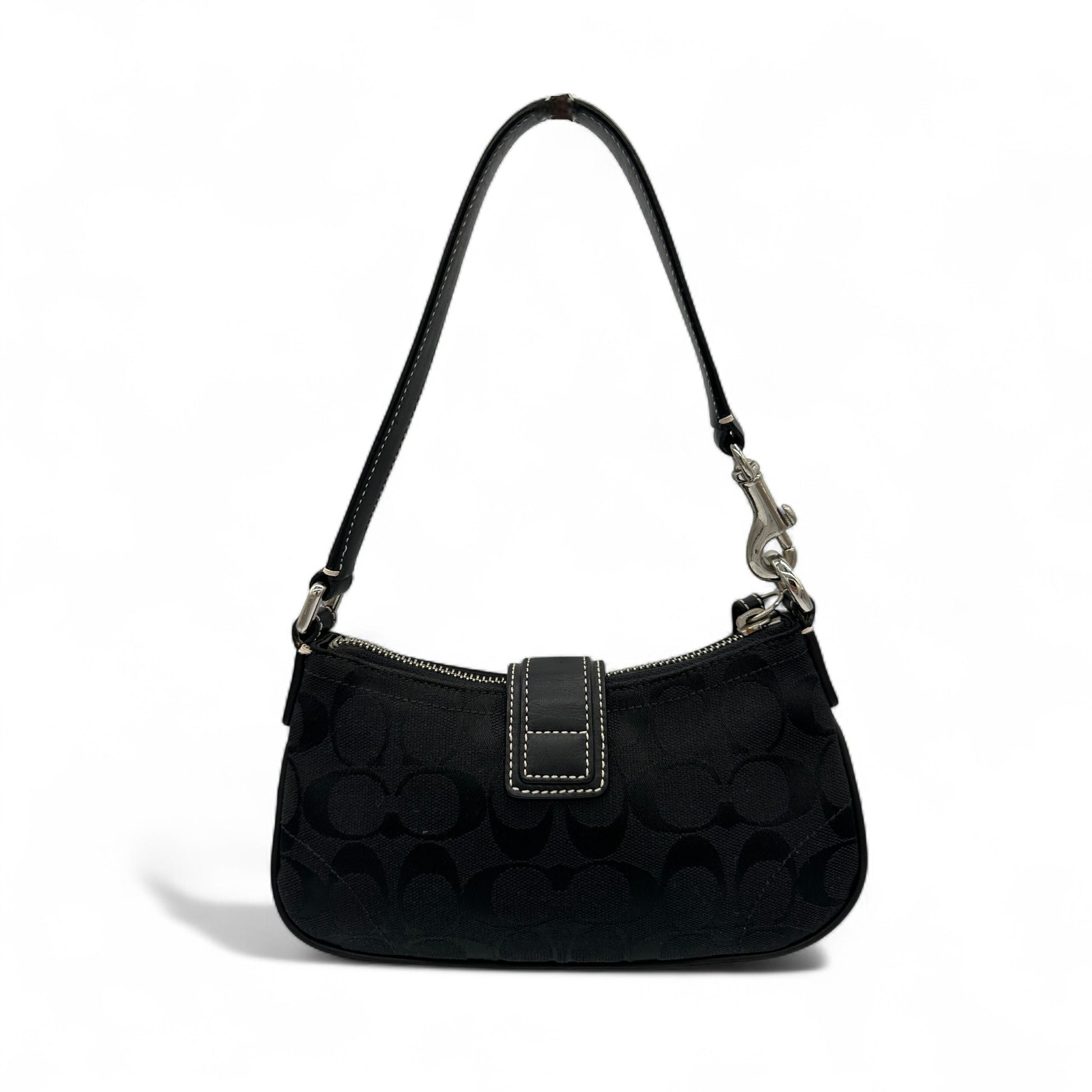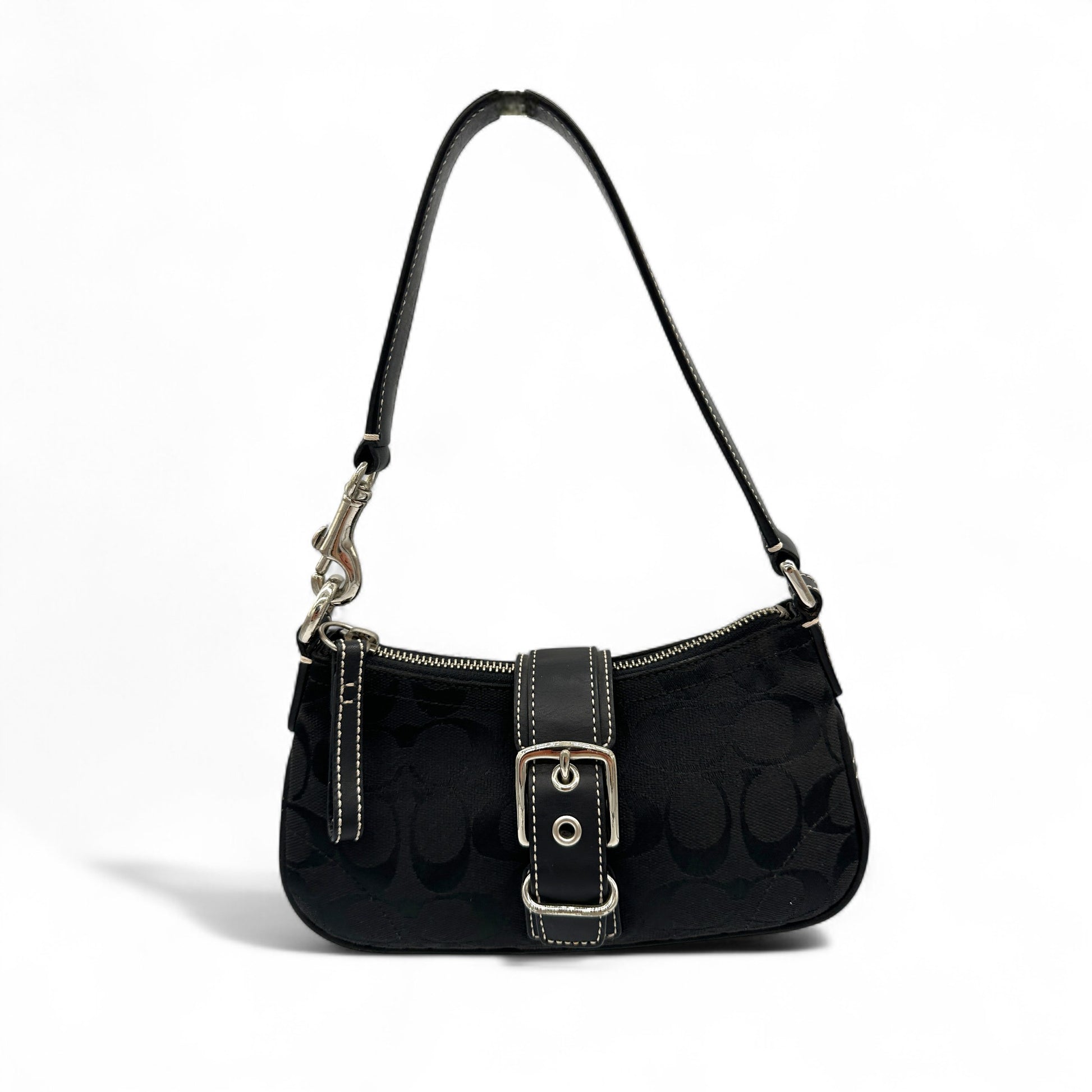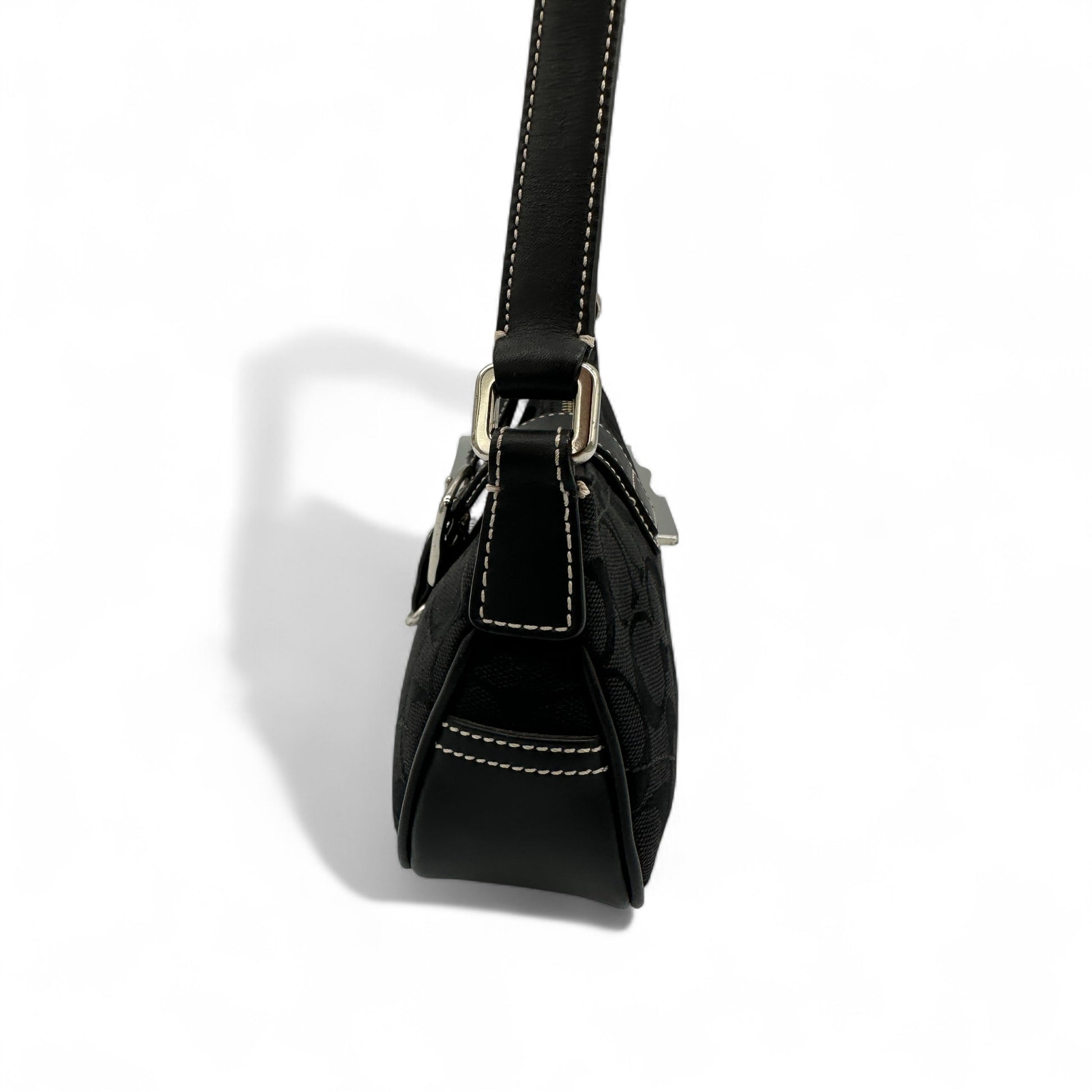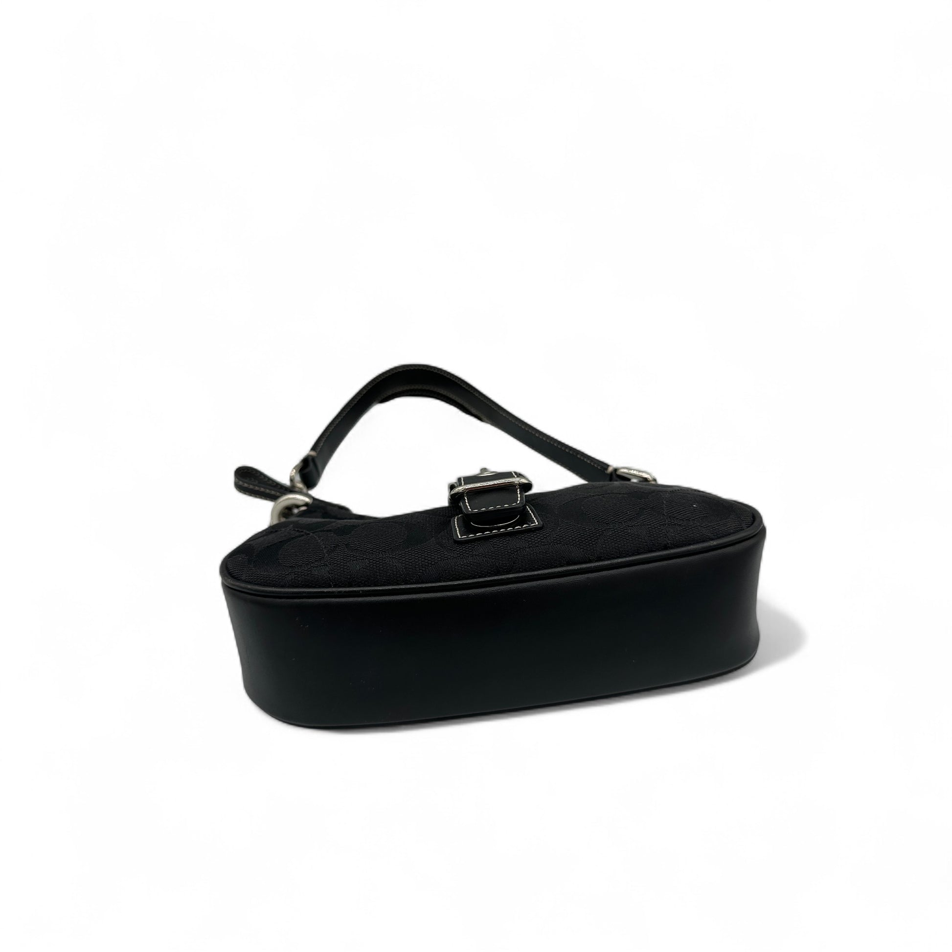 Vintage Coach Demi Soho 6362 Shoulder Bag. In black signature monogram, trimmed with black leather and silver Soho buckle hardware. A sought after Coach Soho mini bag from 2004.
