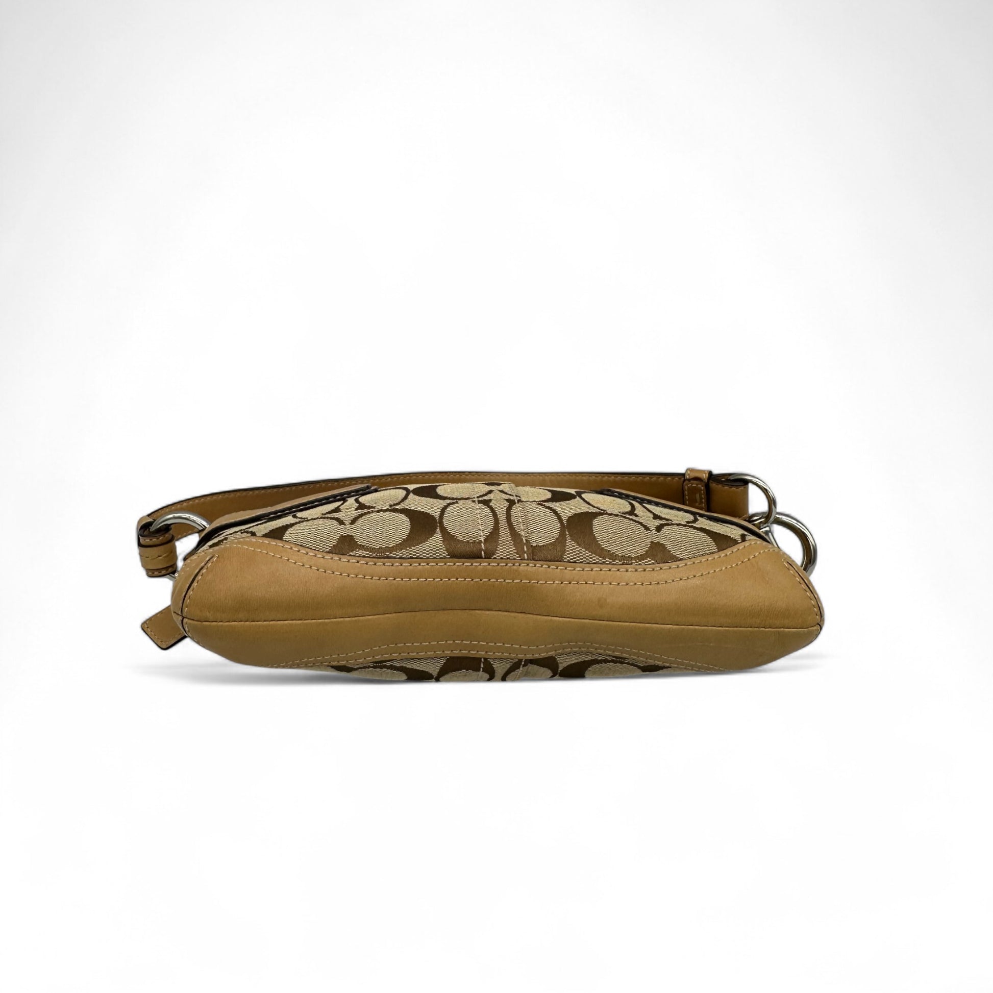 Model and style: Vintage Coach 5107 Demi Soho Shoulder Bag. In brown and tan signature monogram, trimmed with tan leather and silver buckle hardware.