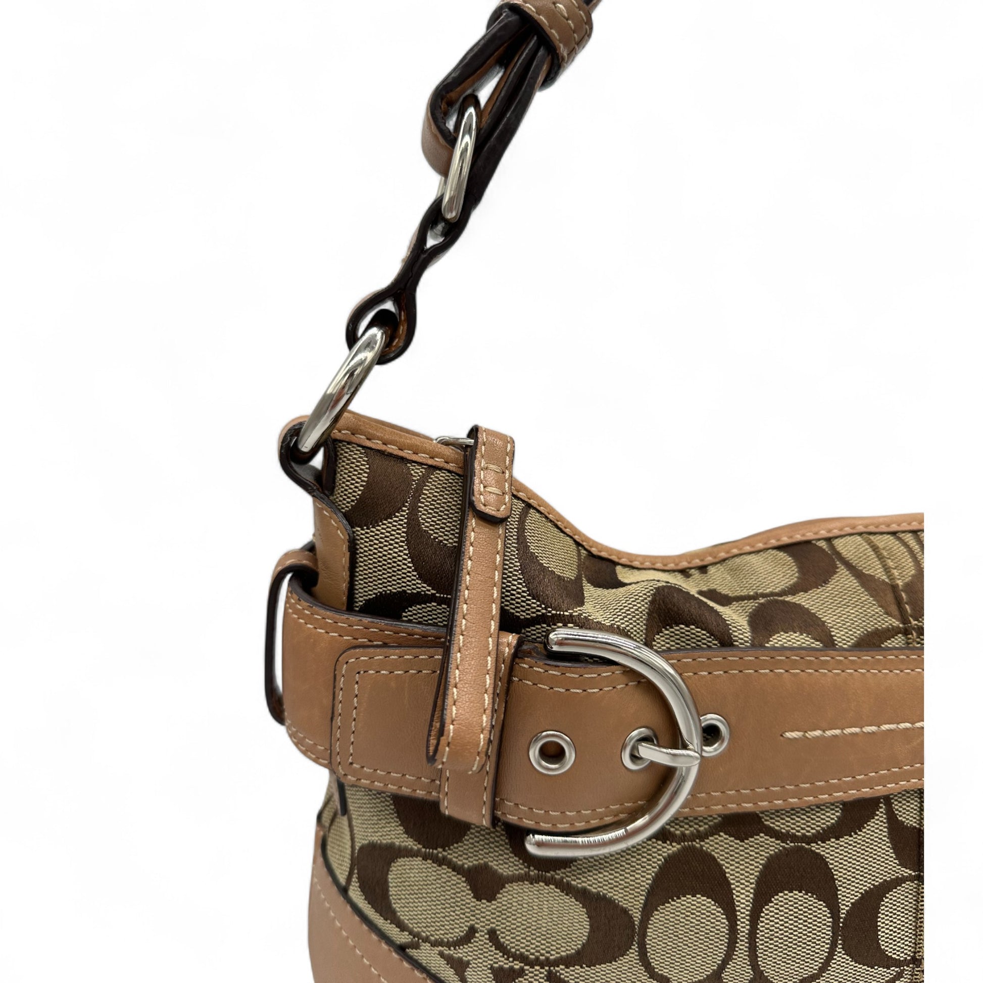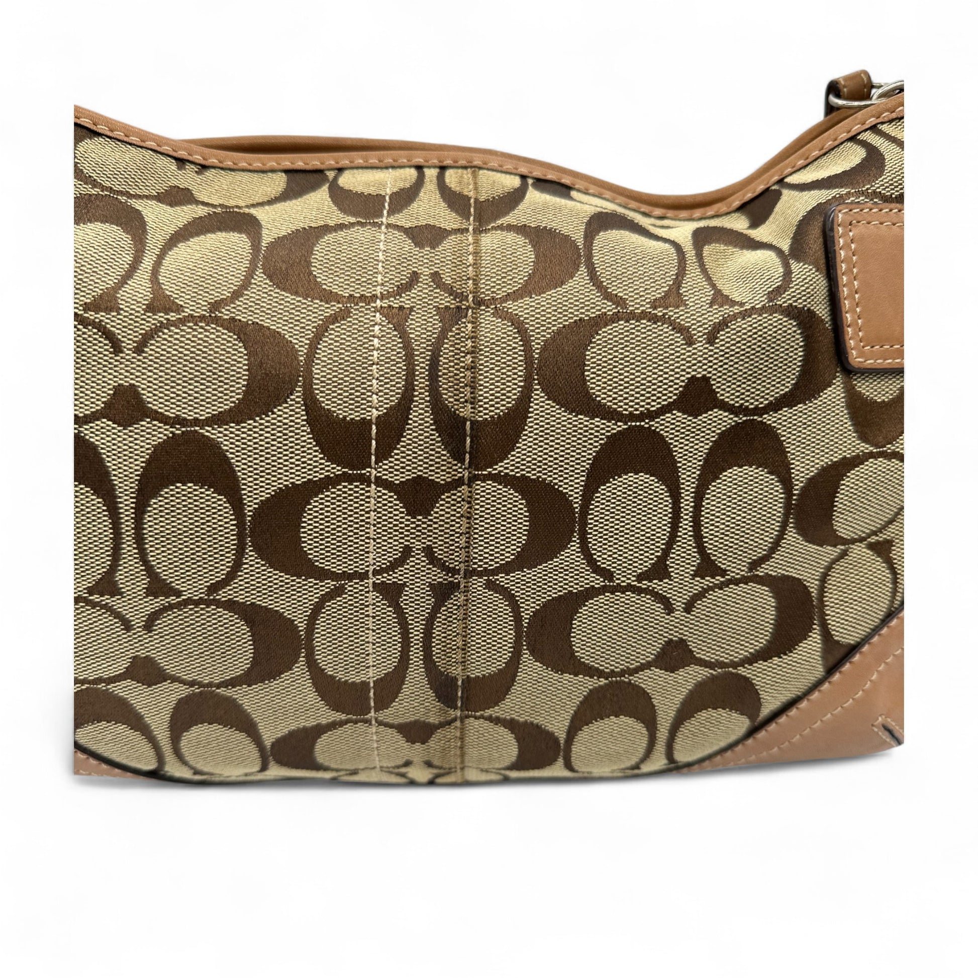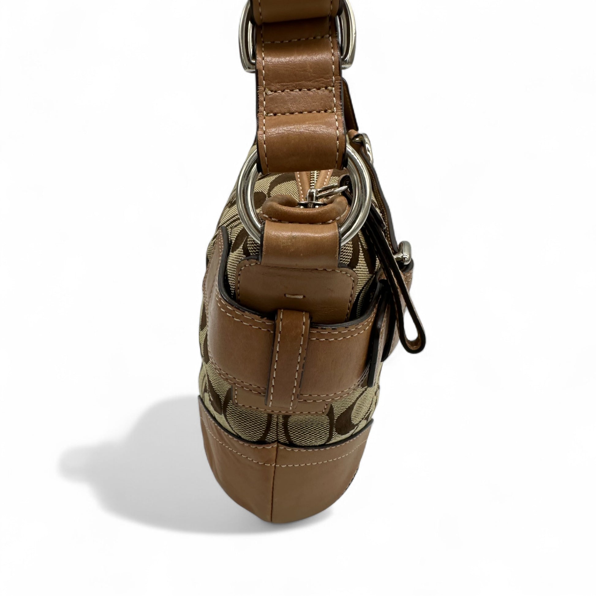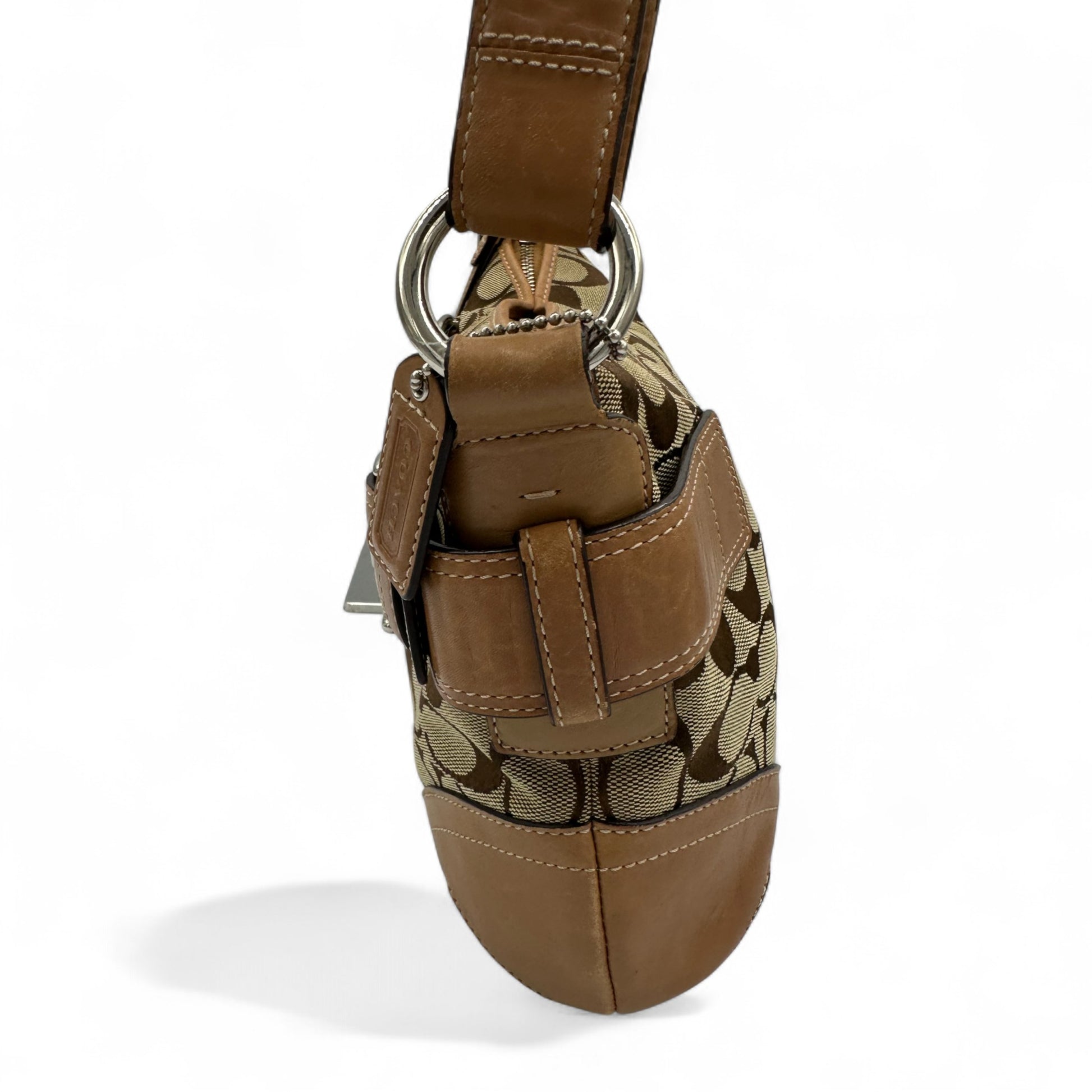 Model and style: Vintage Coach F07077 Shoulder Bag in signature monogram with tan leather trim, Y2K piece from 2009