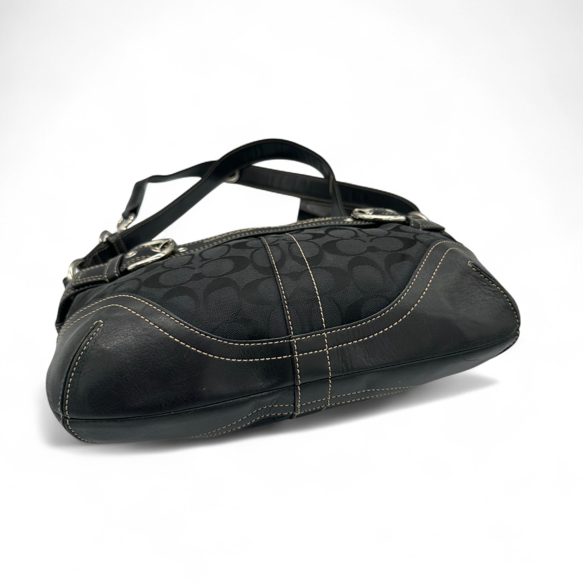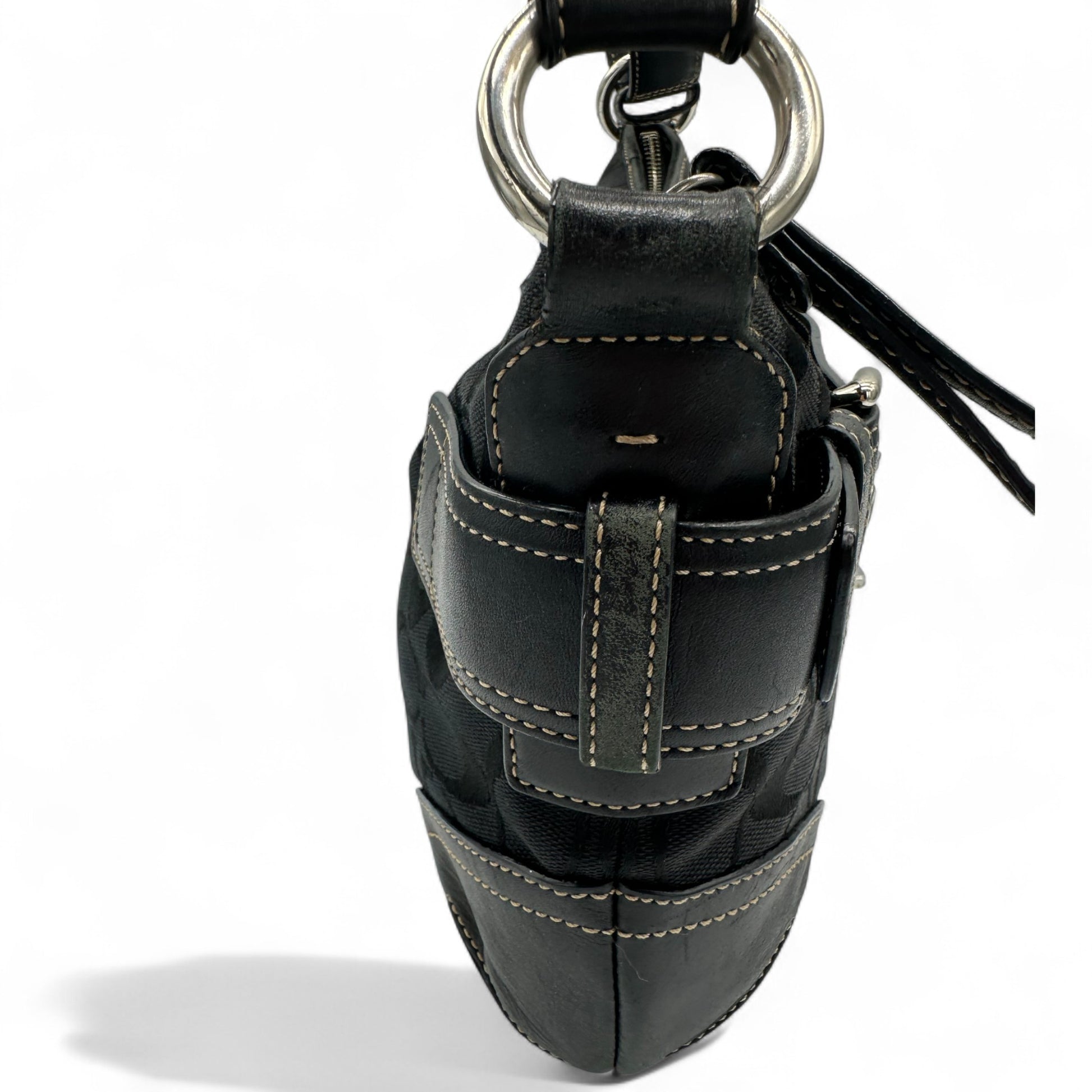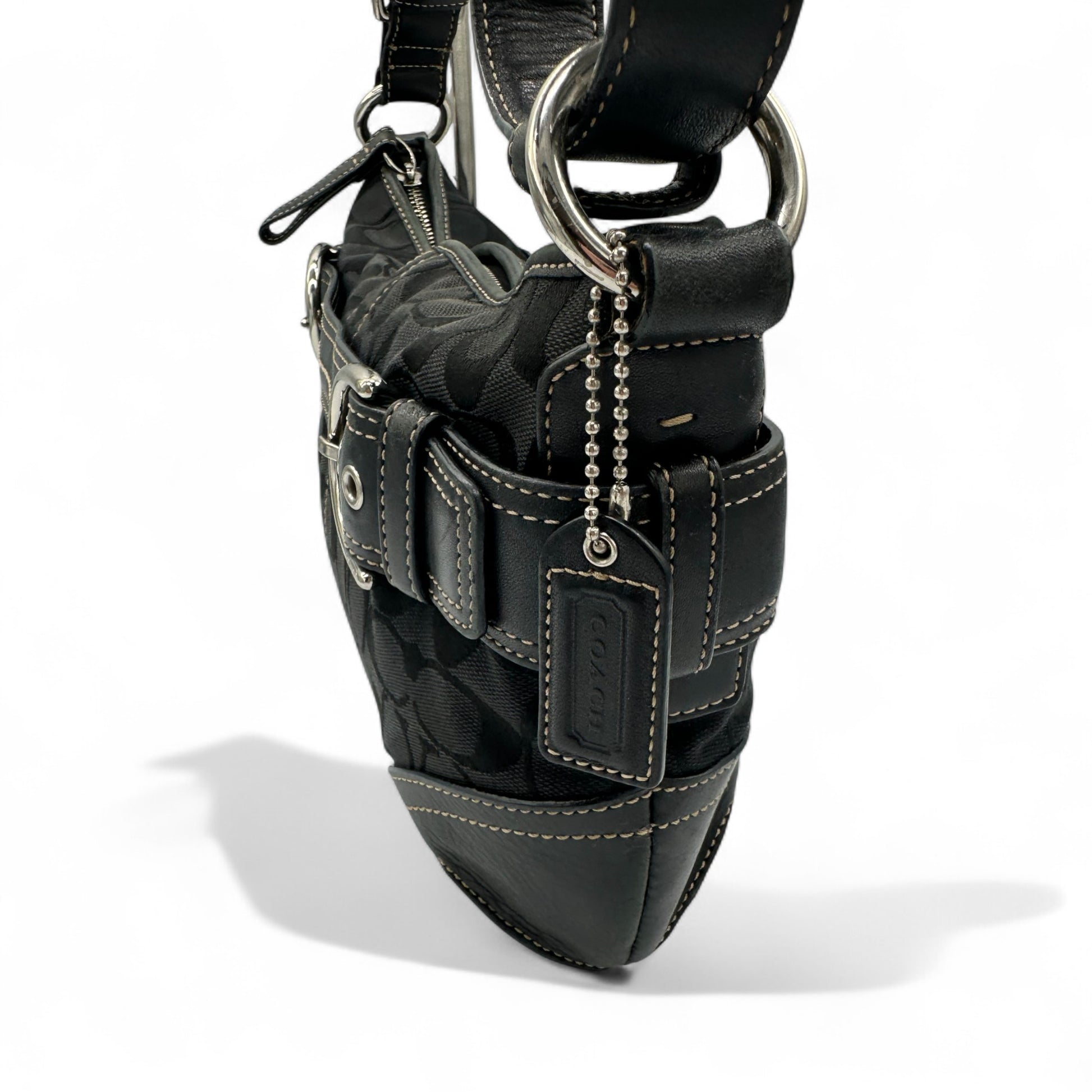 Model and style: Vintage Coach F07077 Soho Double Buckle Shoulder Bag. In black signature monogram, trimmed with black leather and silver buckle hardware detailing. Includes adjustable strap that can be worn as a shoulder bag or crossbody bag.