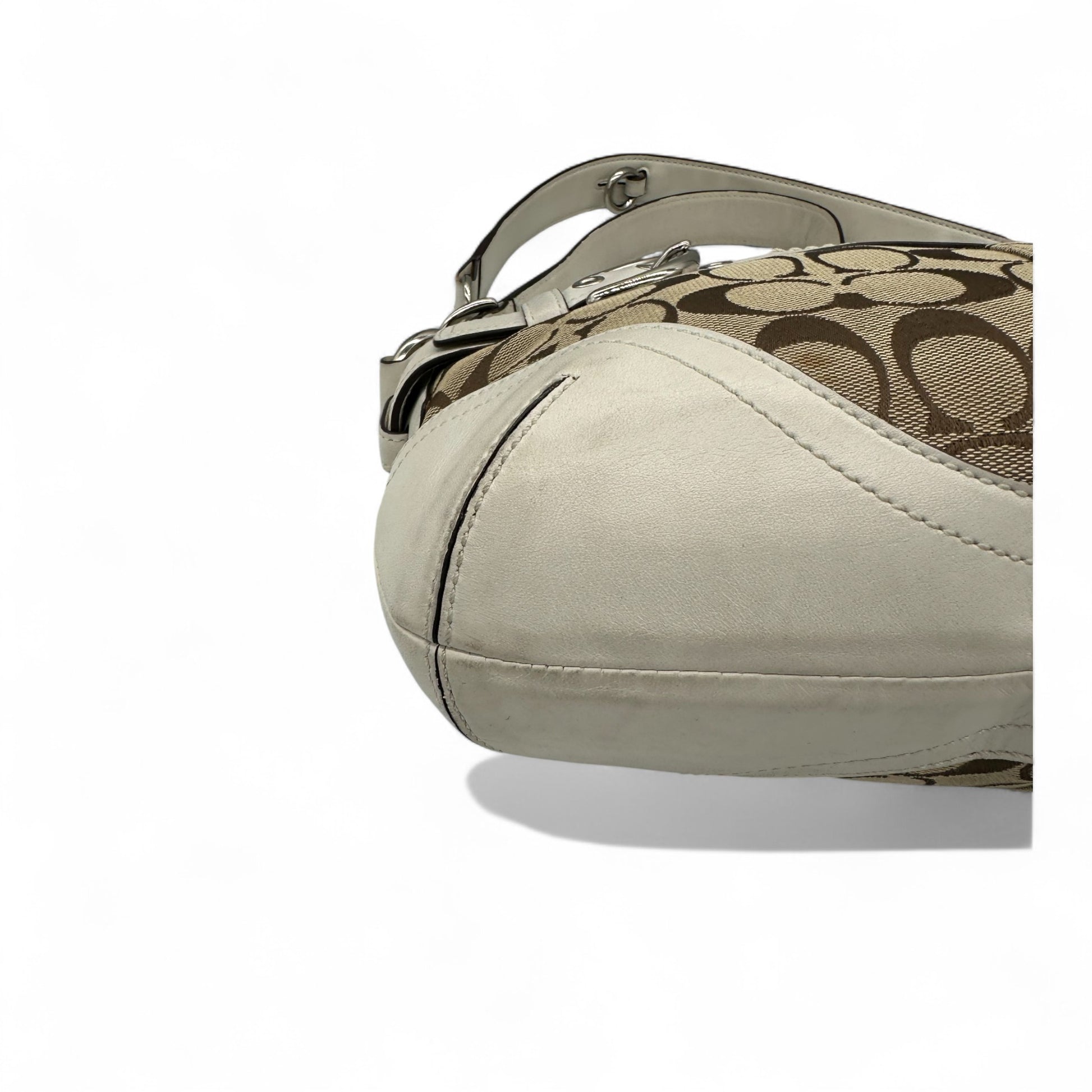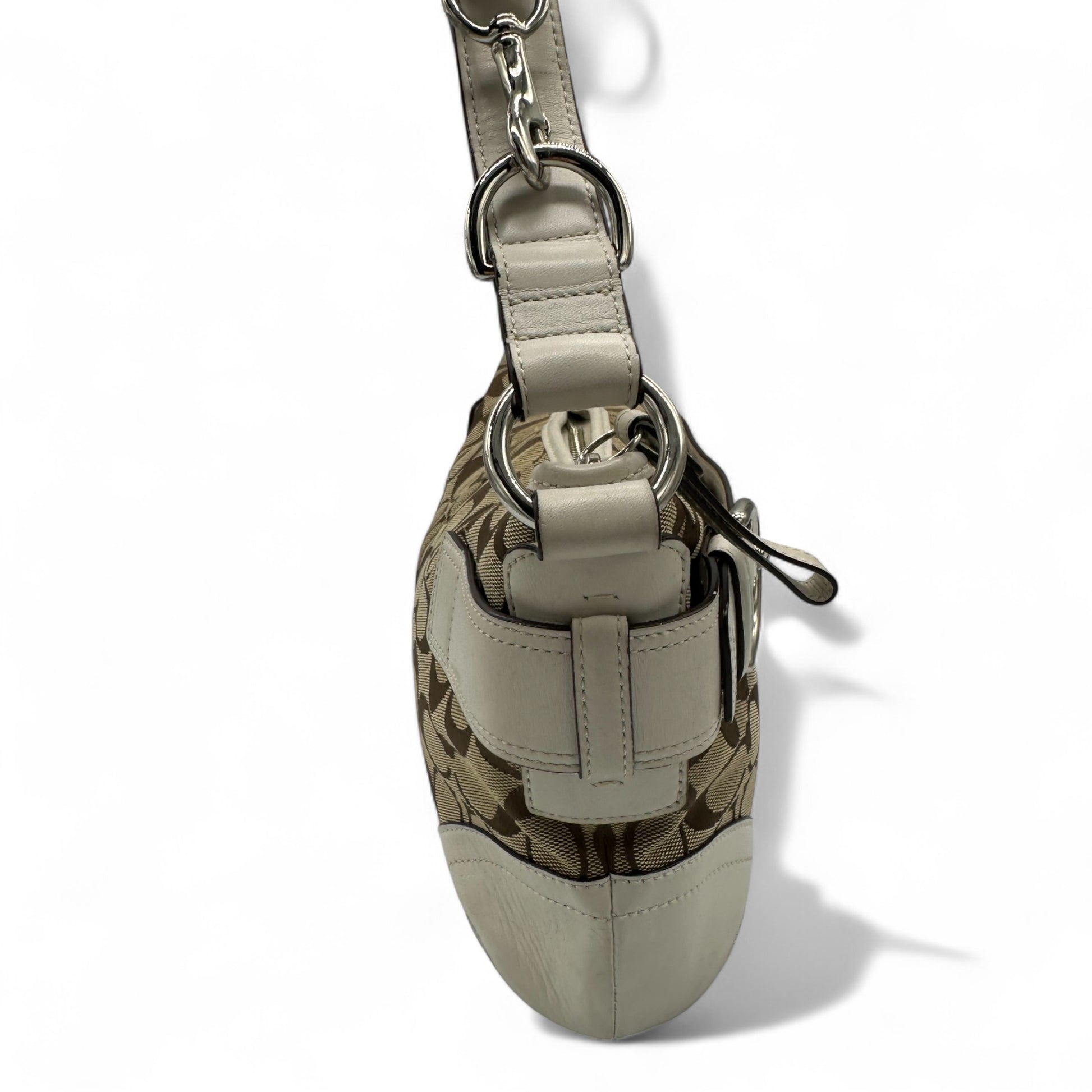 Model and style: Vintage Coach F07077 Soho Double Buckle Shoulder Bag. In brown and beige signature monogram, trimmed with white leather and silver buckle hardware. The leather strap is adjustable and can conveniently be worn as a shoulder bag or crossbody bag.