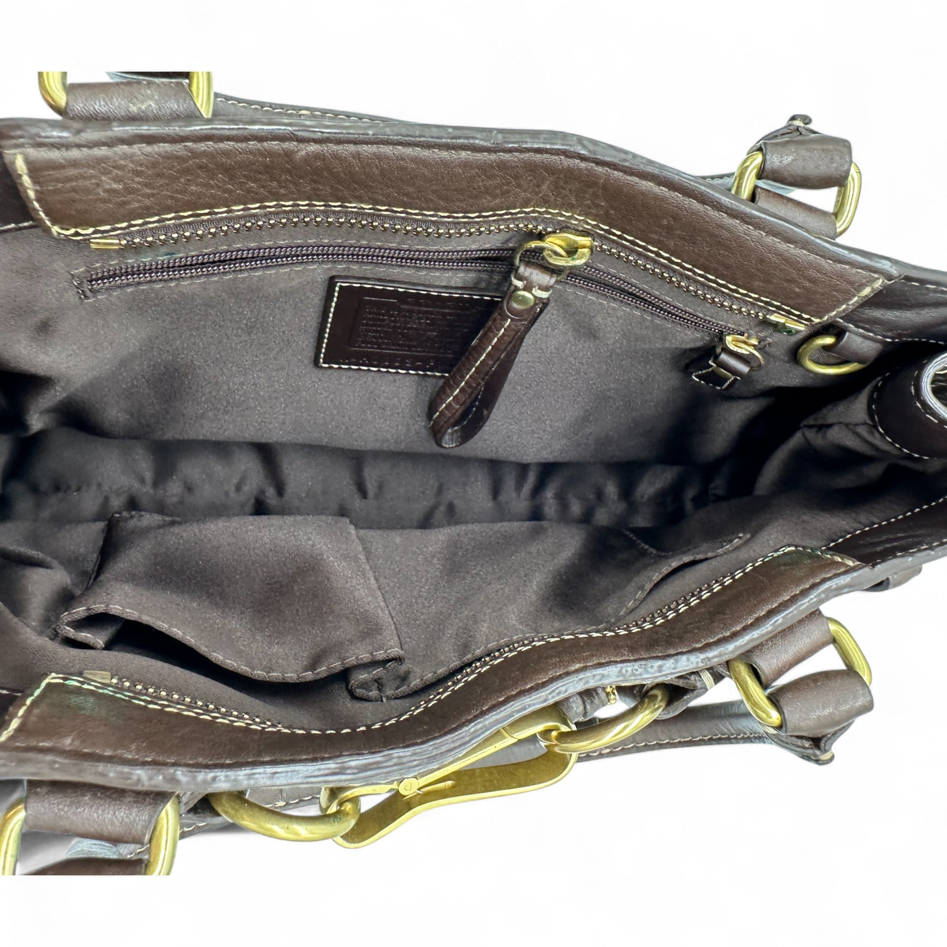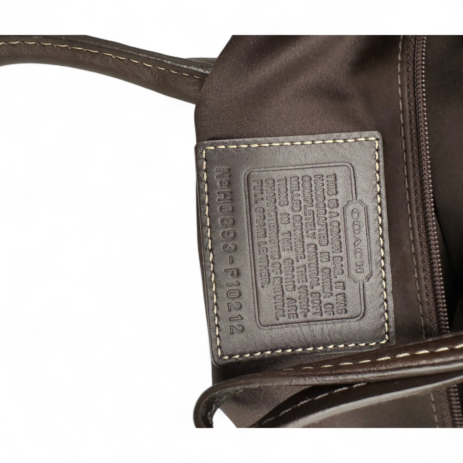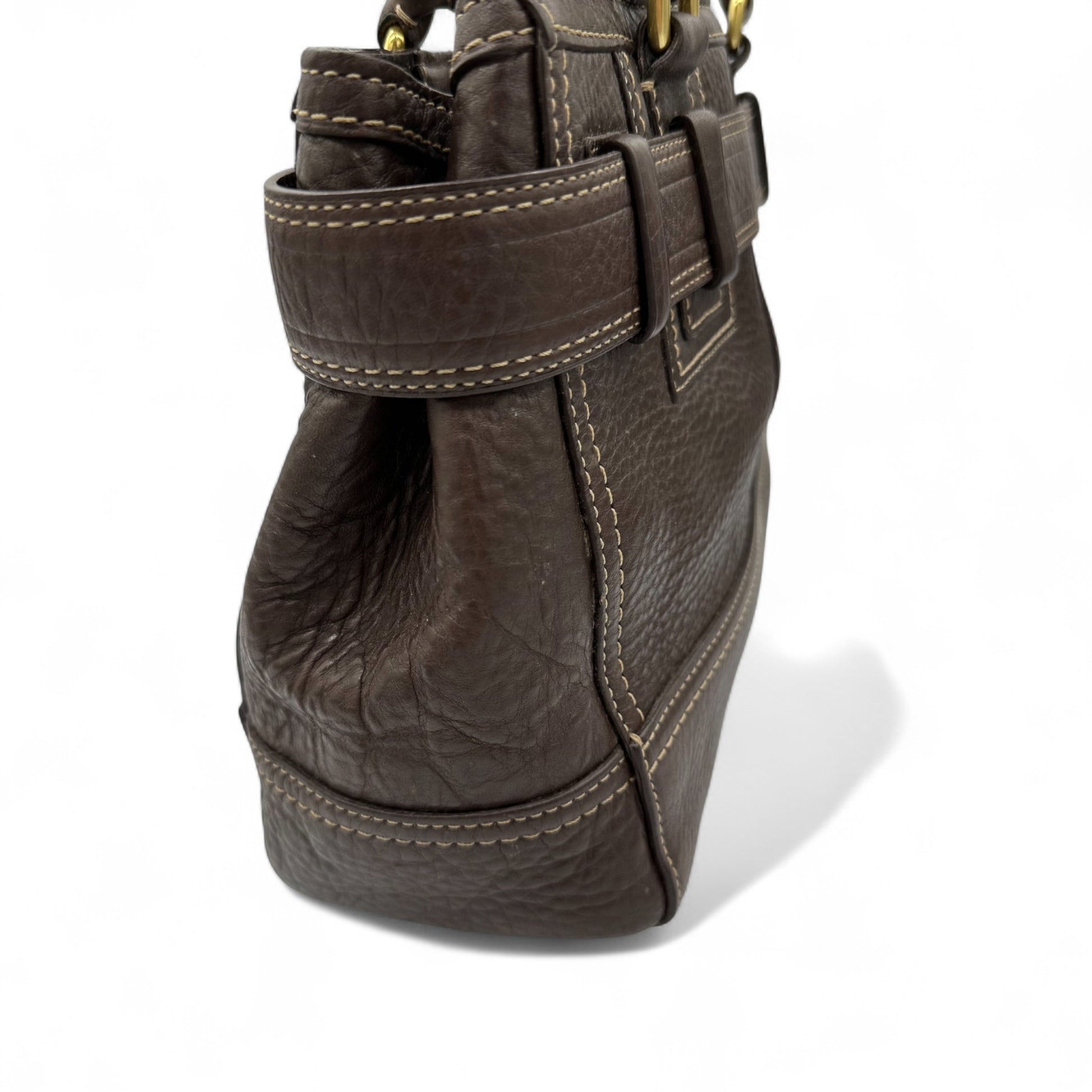 Vintage Coach F10212 Hamptons Handbag. In chocolate brown soft milled pebbled leather, with brass horsebit clip hardware. Can be used as a handbag or comfortably worn as a shoulder bag.