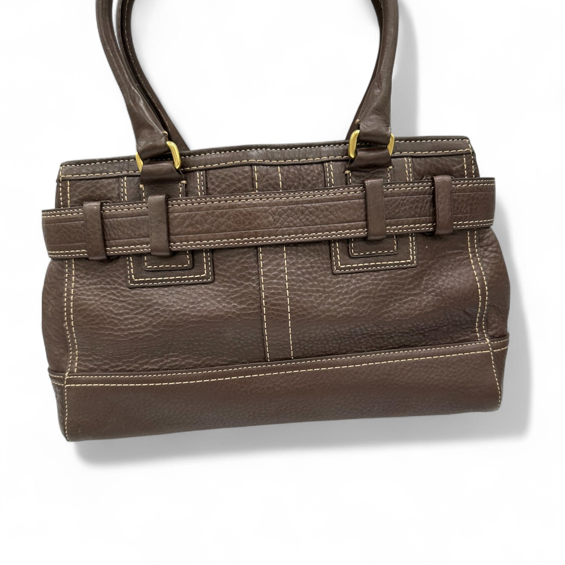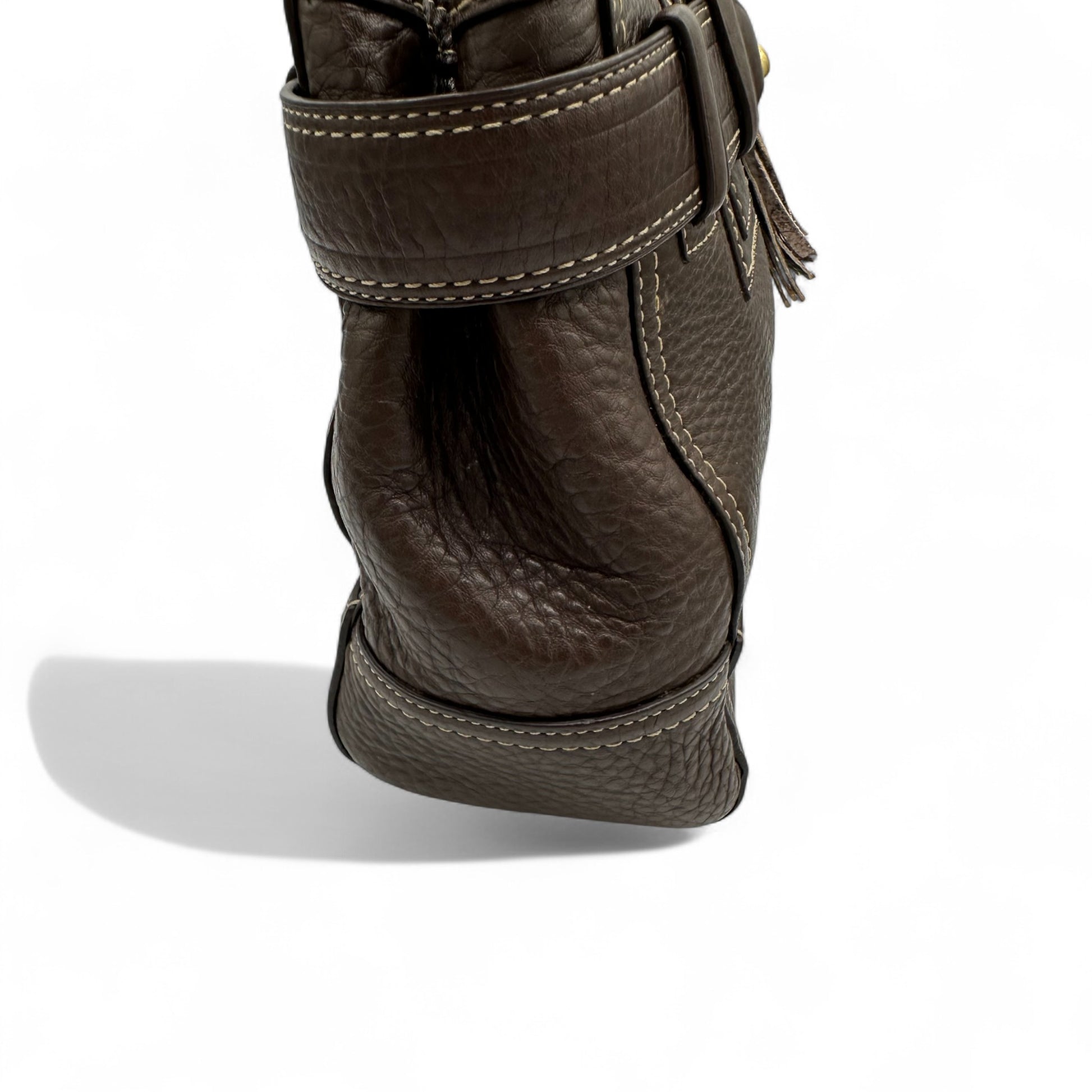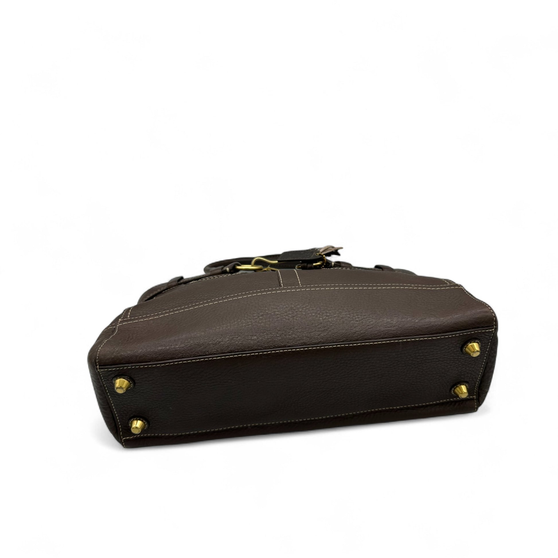 Vintage Coach F10212 Hamptons Handbag. In chocolate brown soft milled pebbled leather, with brass horsebit clip hardware. Can be used as a handbag or comfortably worn as a shoulder bag.