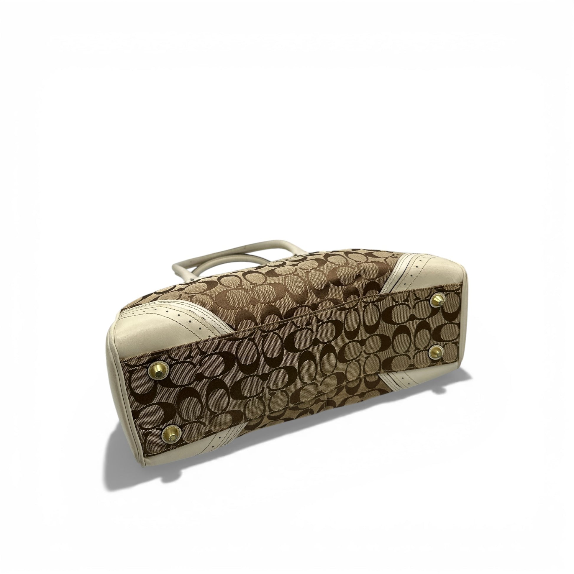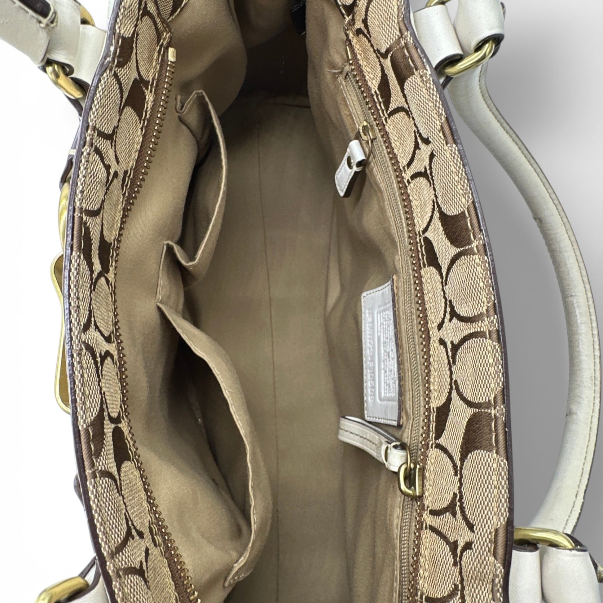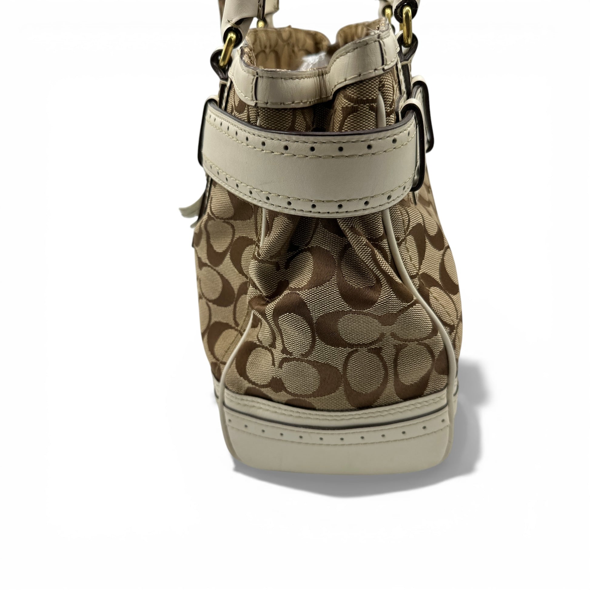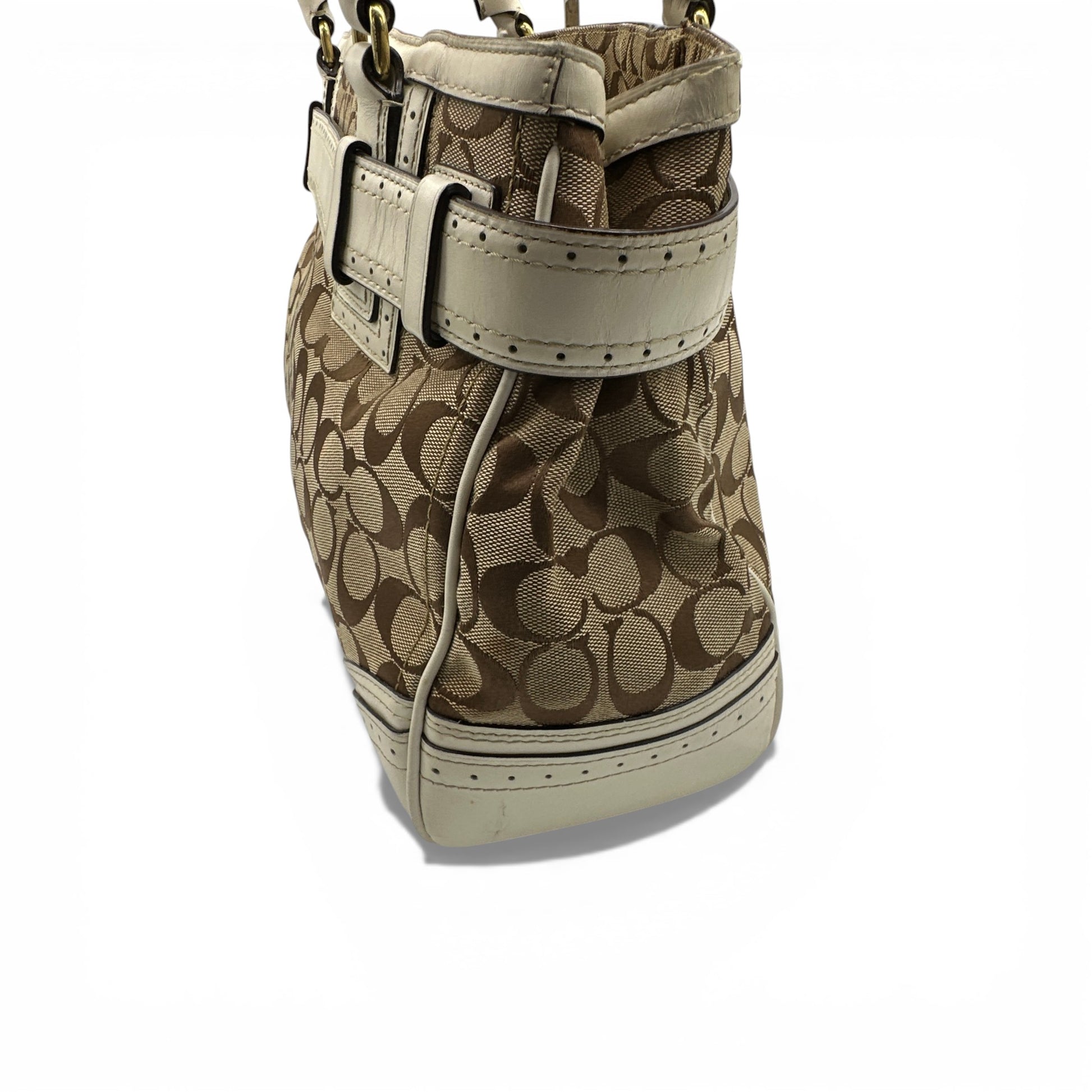 Vintage Coach F10508 Hamptons Horsebit Tote Handbag. In brown and beige signature monogram, with white leather trim. With brass gold-tone horsebit clip hardware and leather tassel accent. Made in 2011.