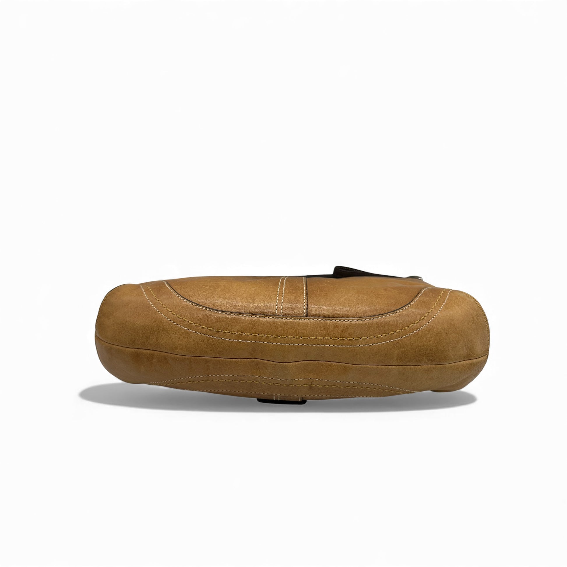 Vintage Coach F10910 Soho Shoulder Bag. In tan cowhide leather, trimmed with dark brown leather and silver-tone Soho buckle hardware and a magnetic button closure. A Y2K piece from 2007.