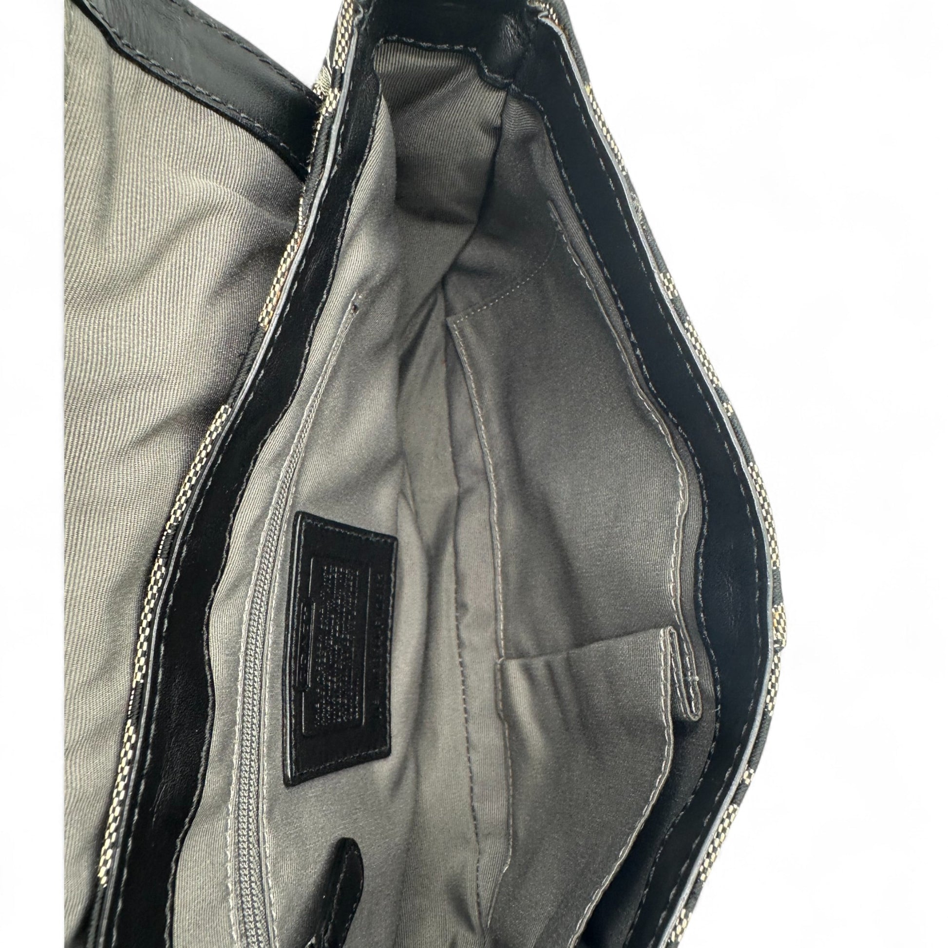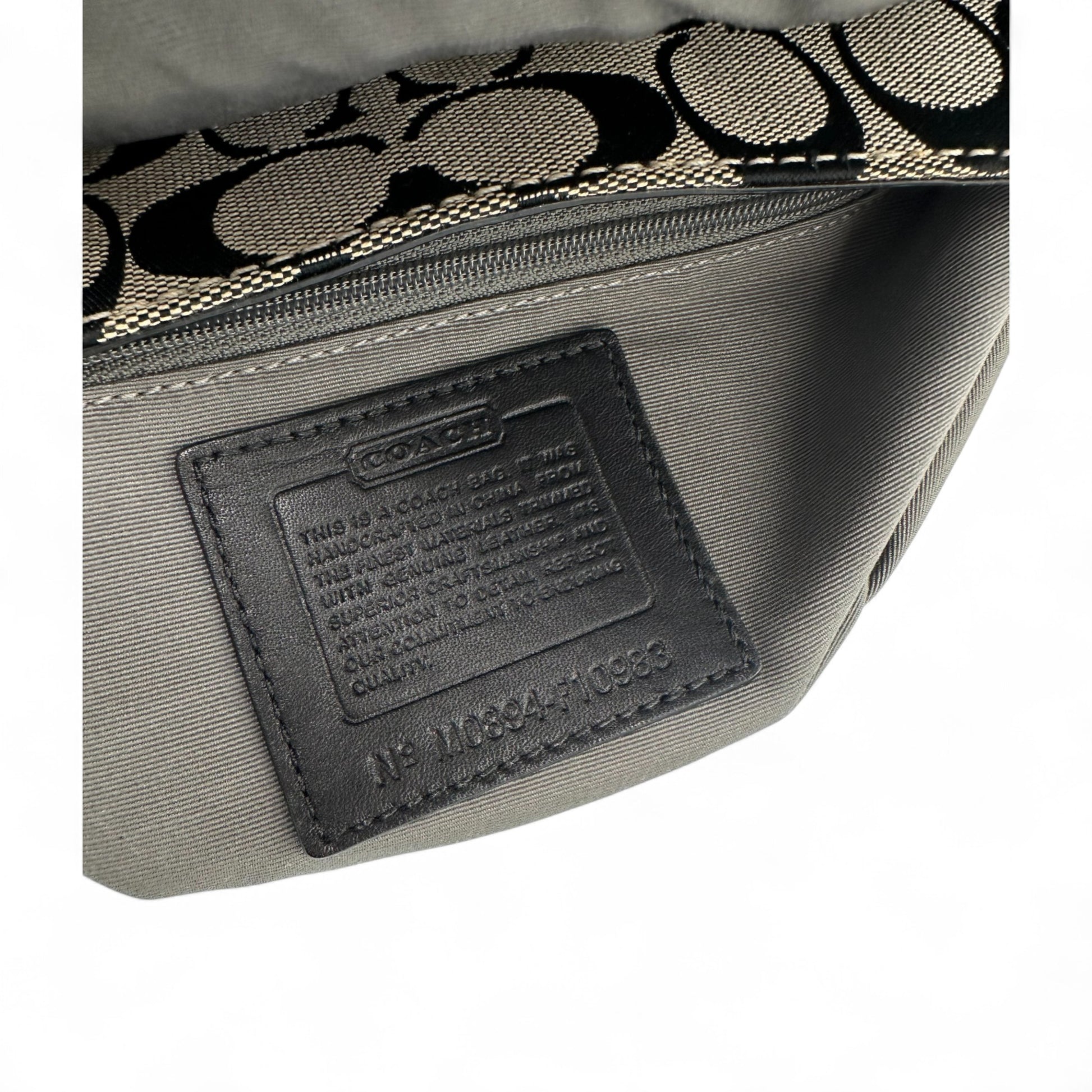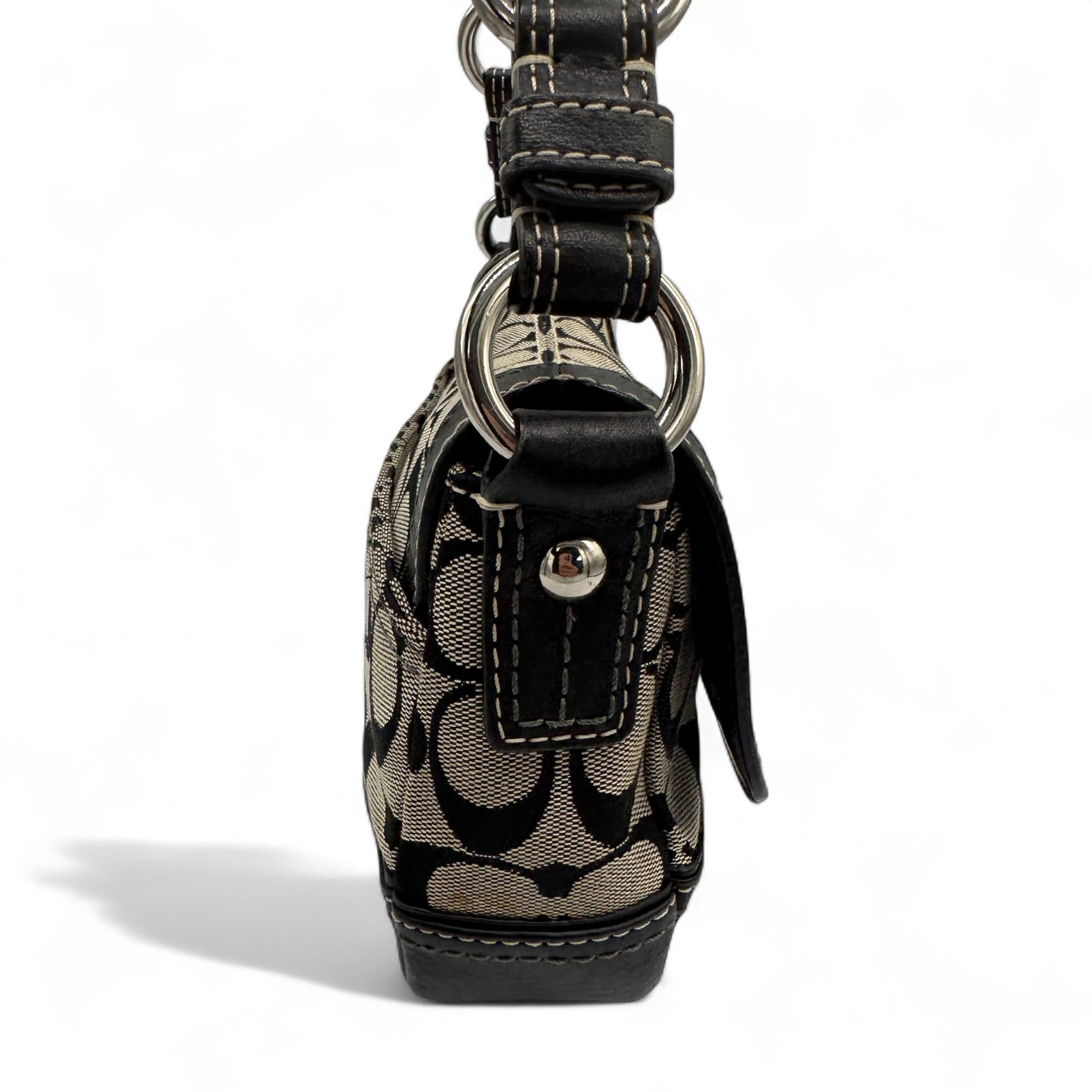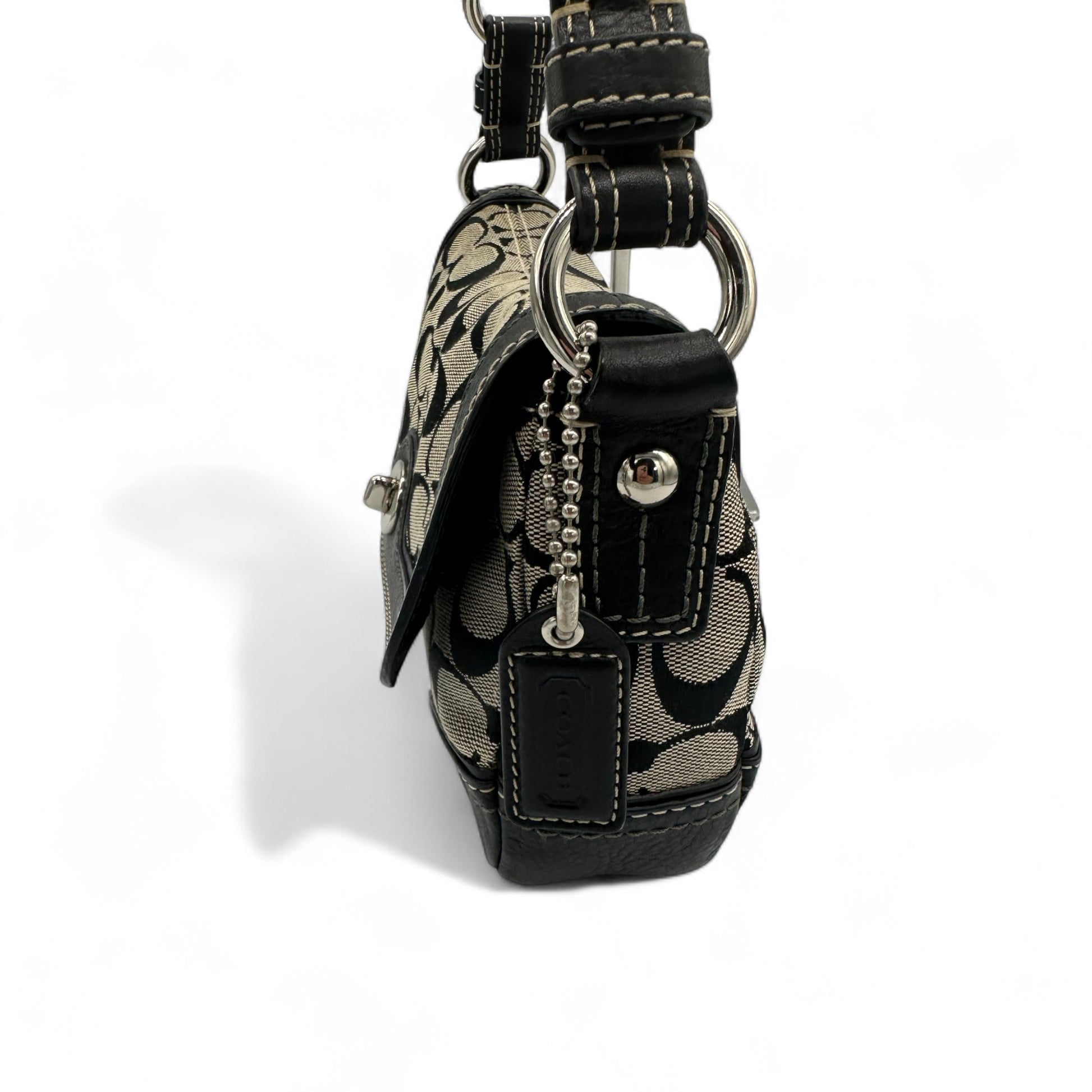 Model and style: Vintage Coach Chelsea 10983 Turnlock Shoulder Bag. In black and beige signature monogram, trimmed with black leather. With flap and turnlock closure, with silver hardware.