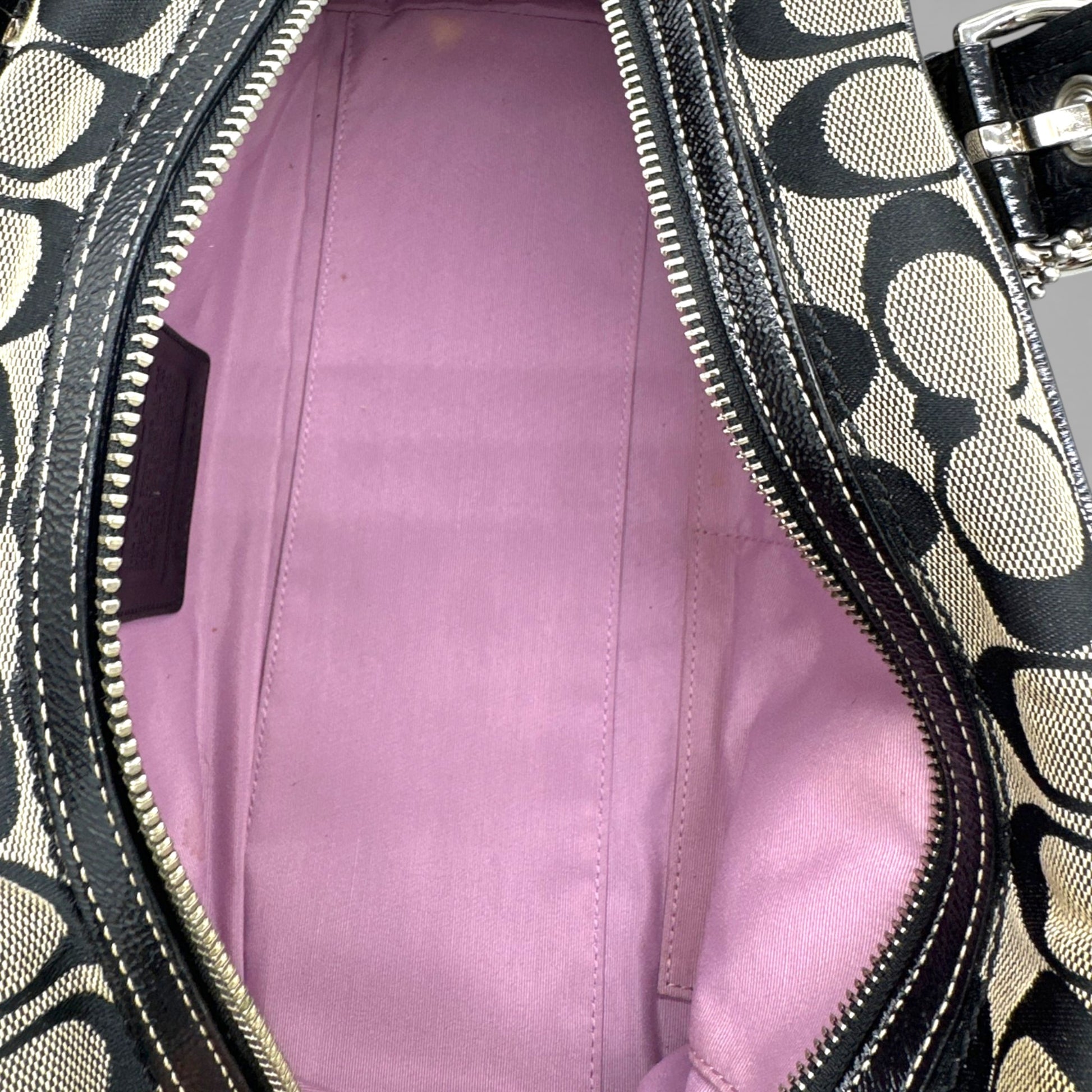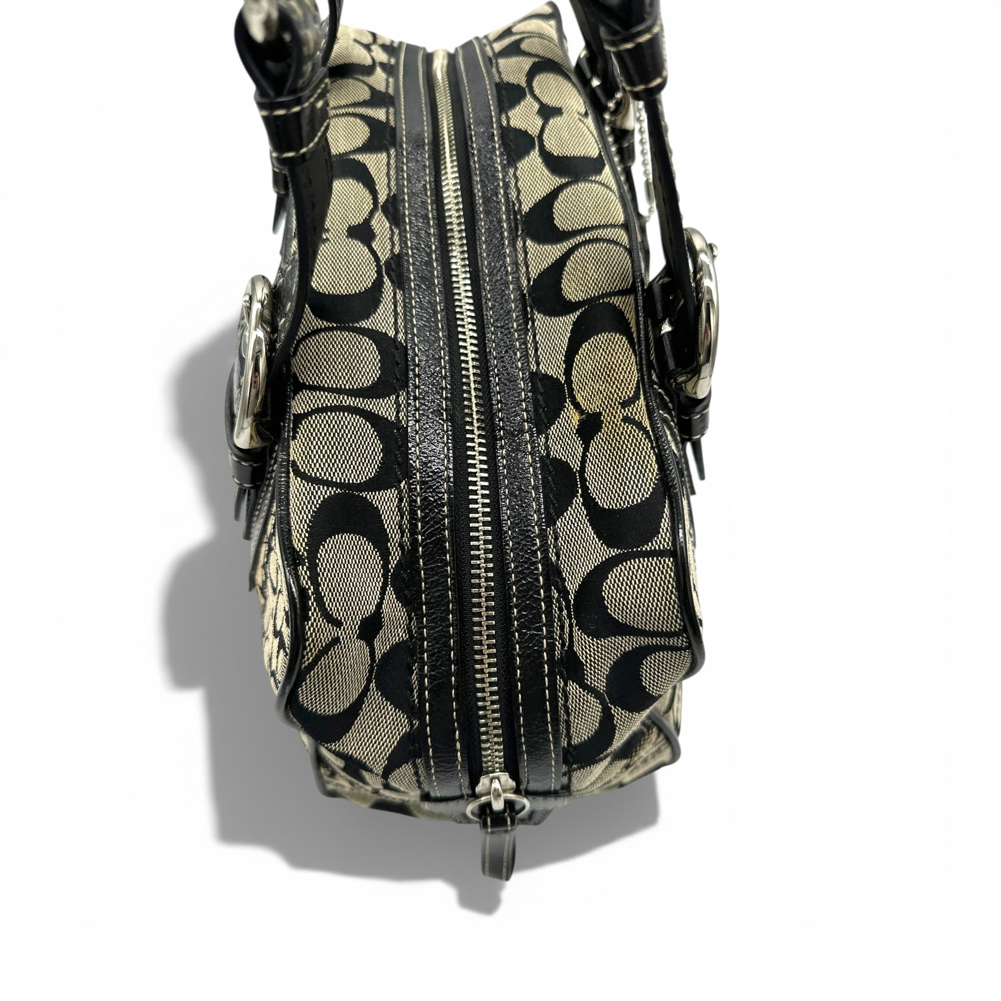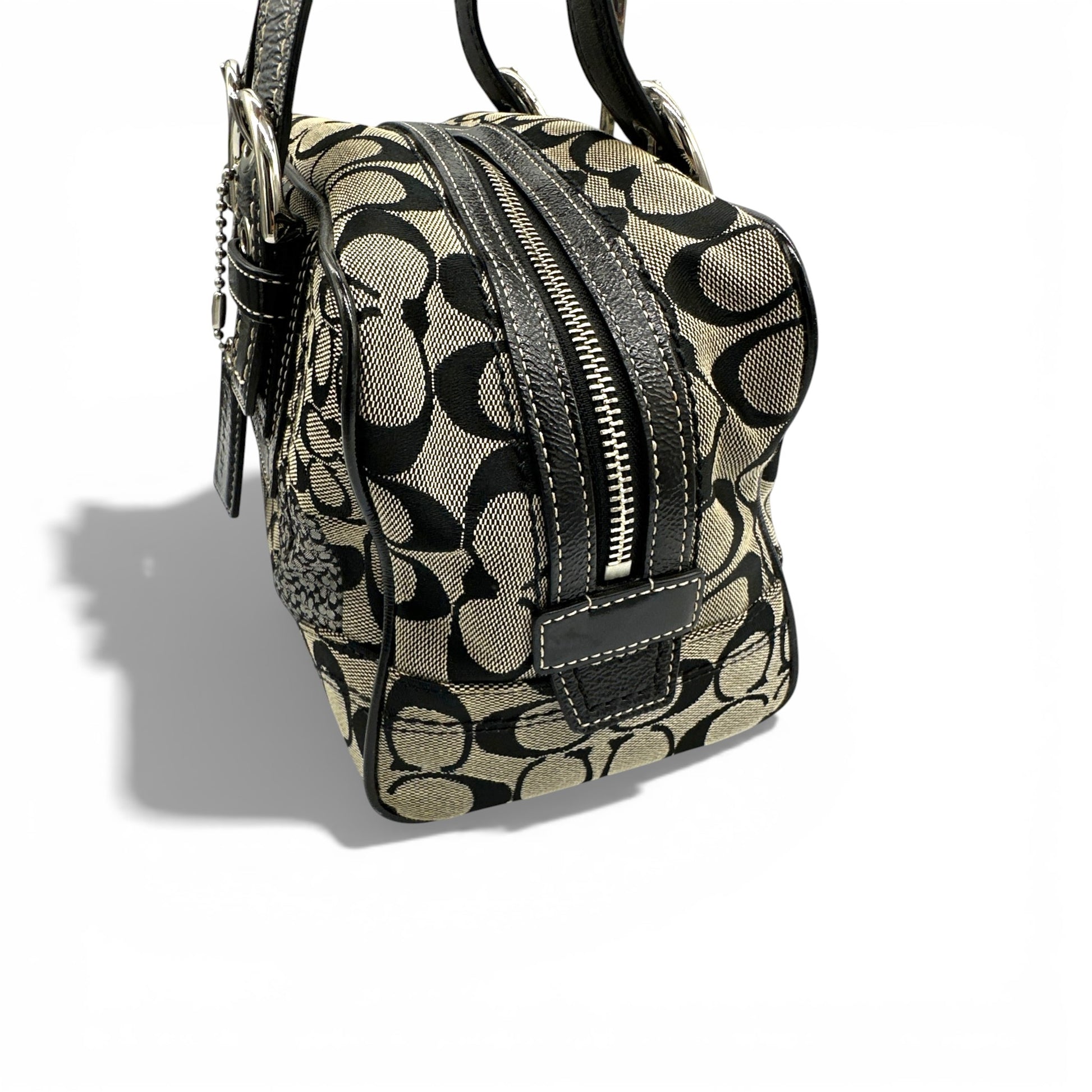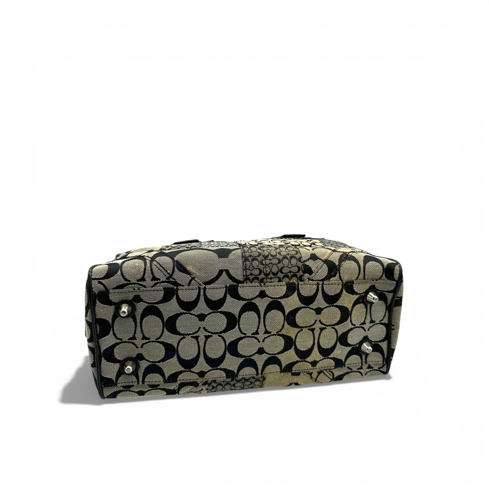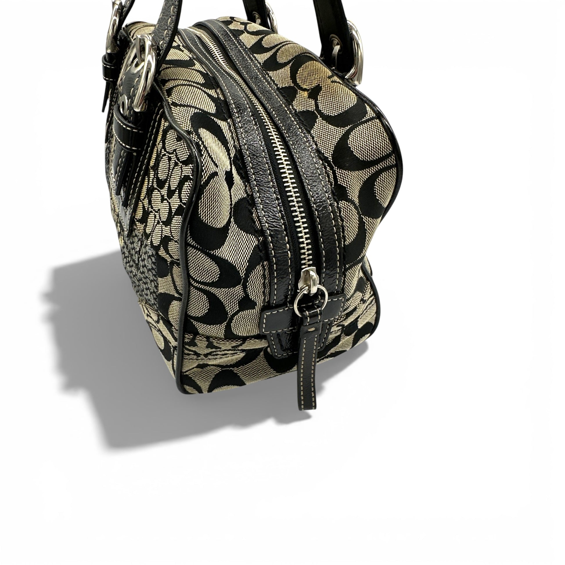 Vintage Coach F12317 Boston Patchwork Shoulder Bag in black patchwork monogram with patent black leather trim and silver-toned Soho buckle hardware. A Y2K piece from 2008.