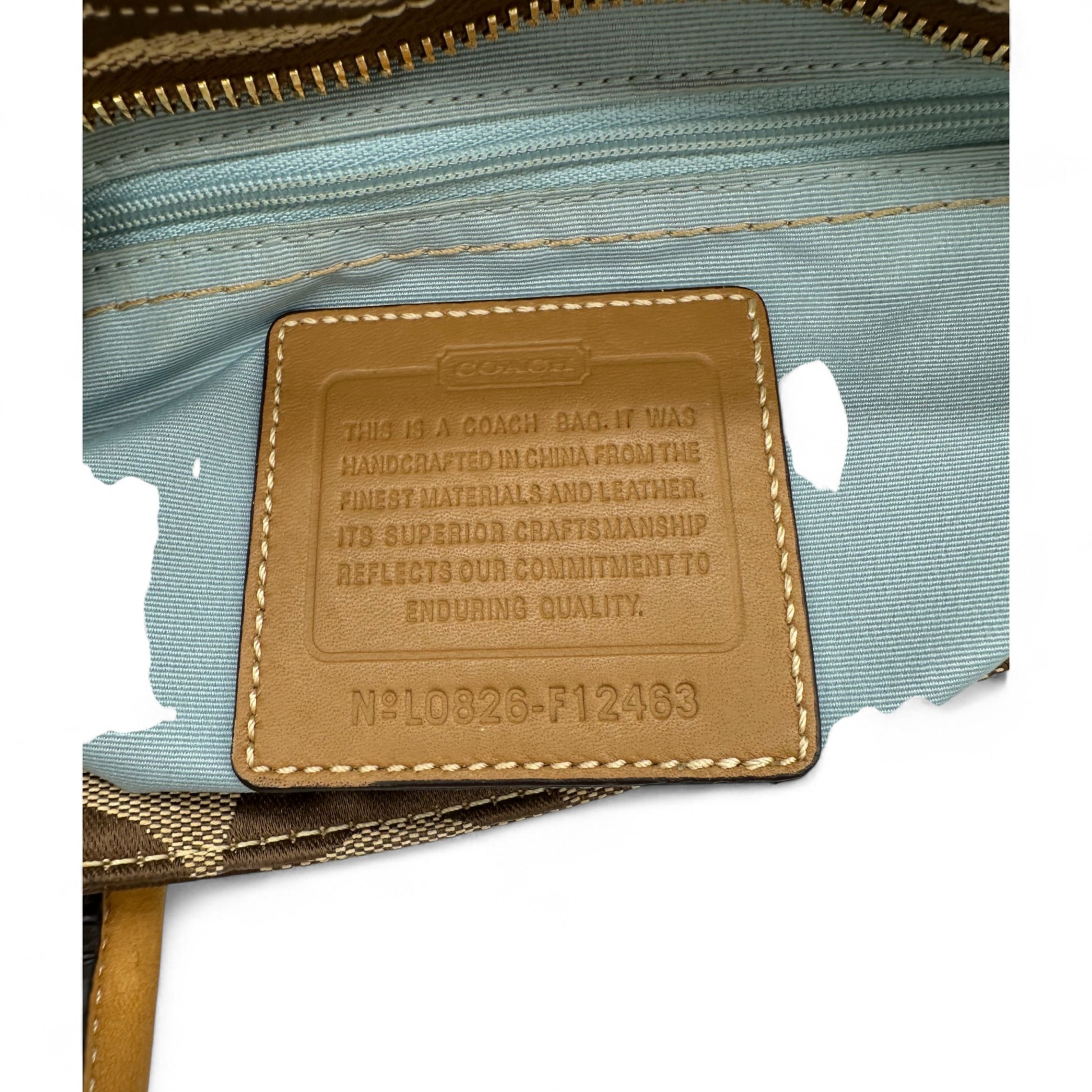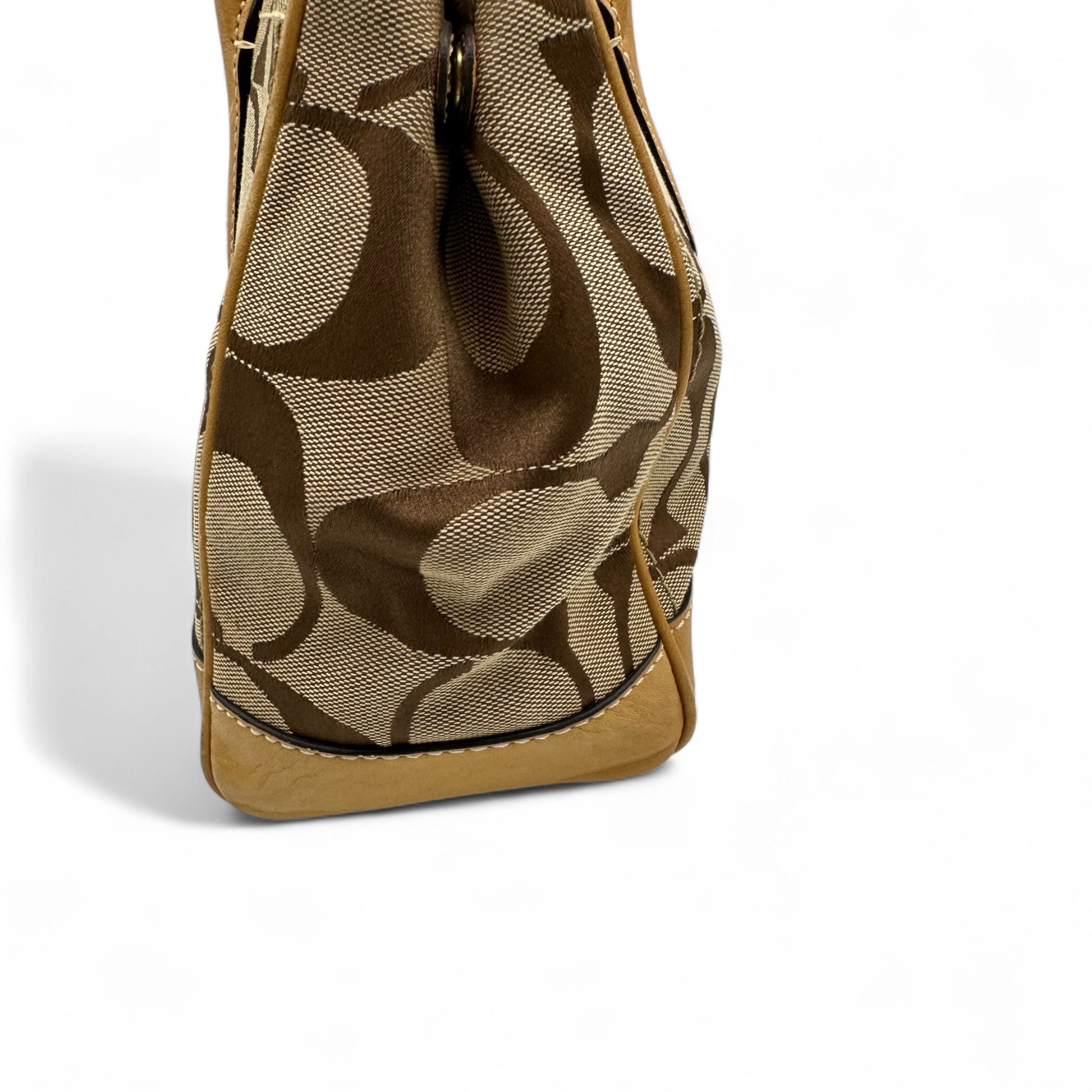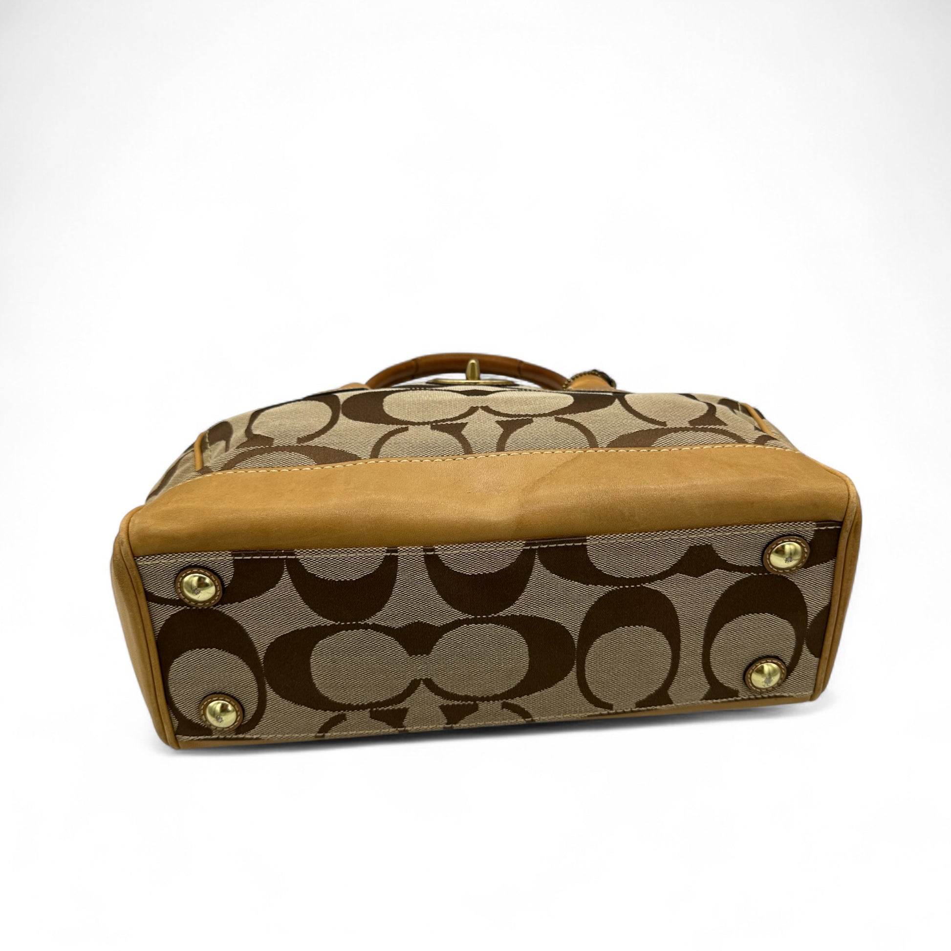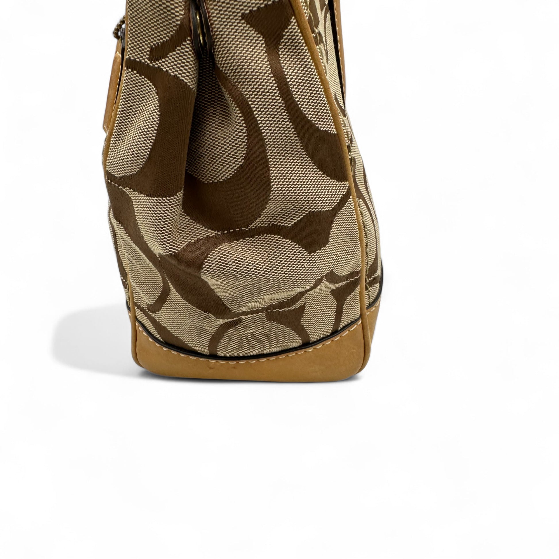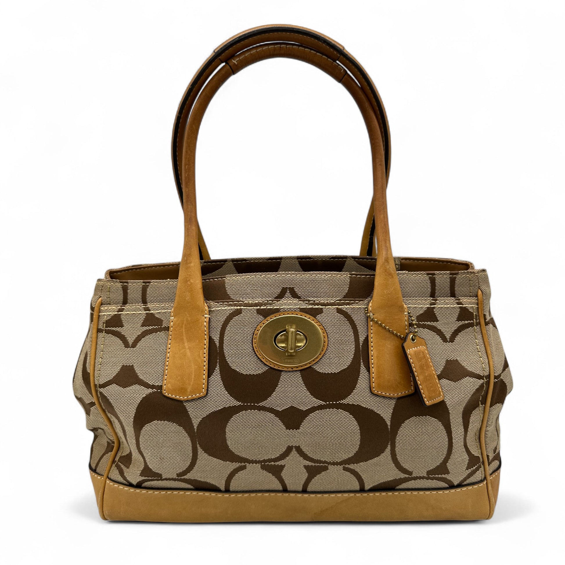 Model and style: Vintage Coach F12463 Turnlock Handbag. In brown and tan signature monogram, trimmed with tan leather and brass turnlock hardware.
