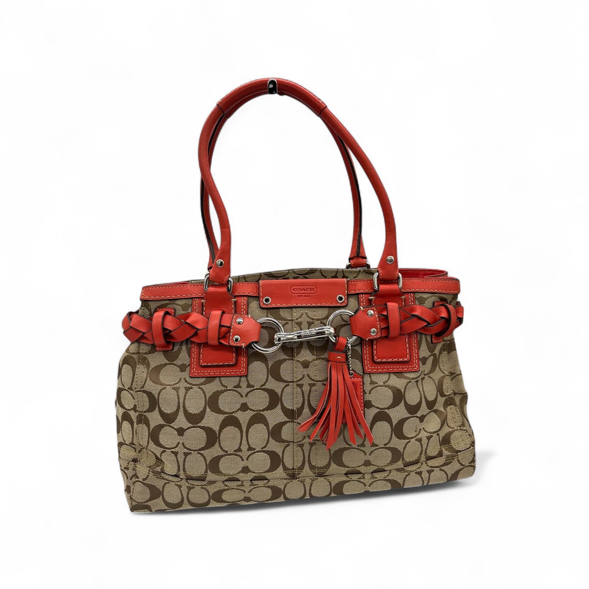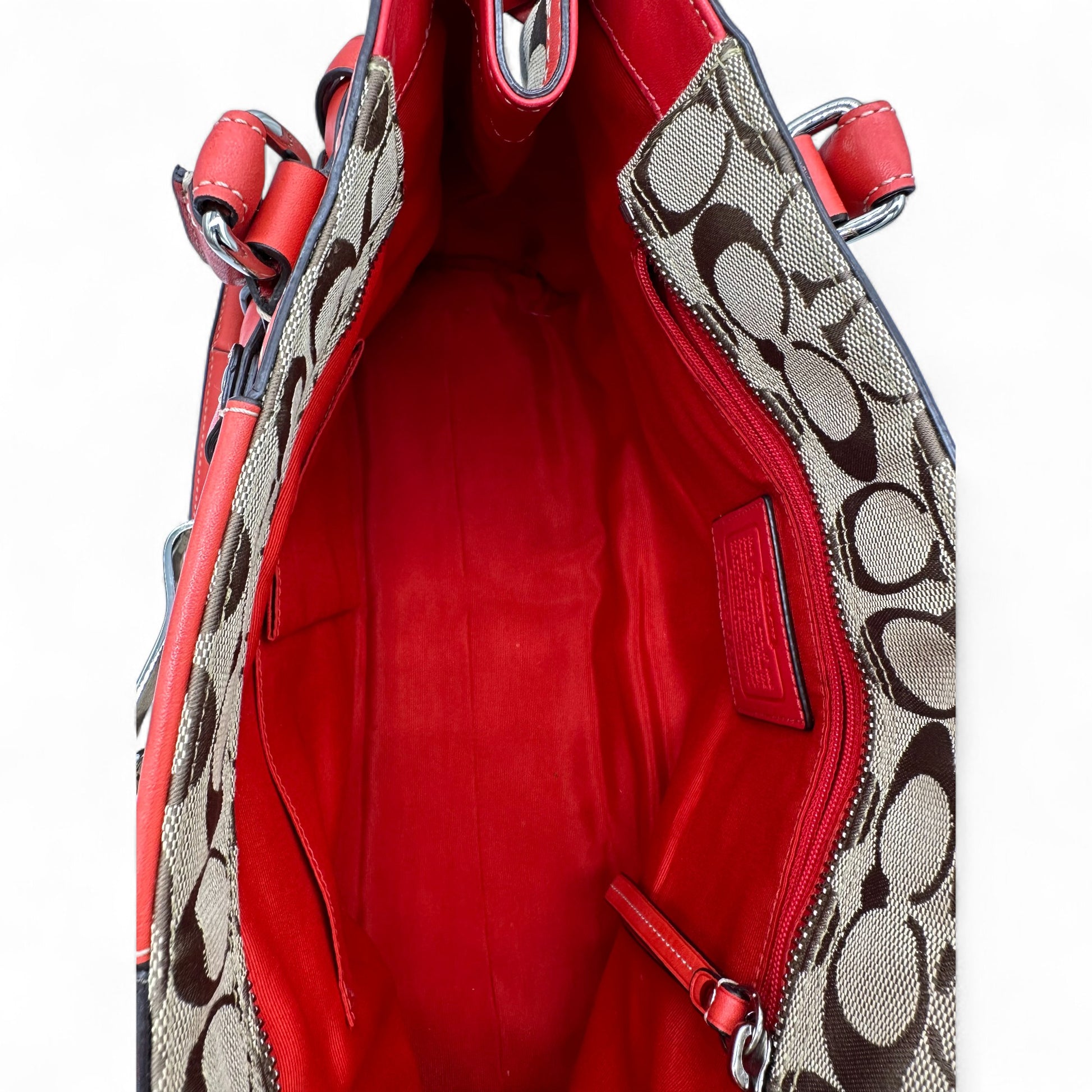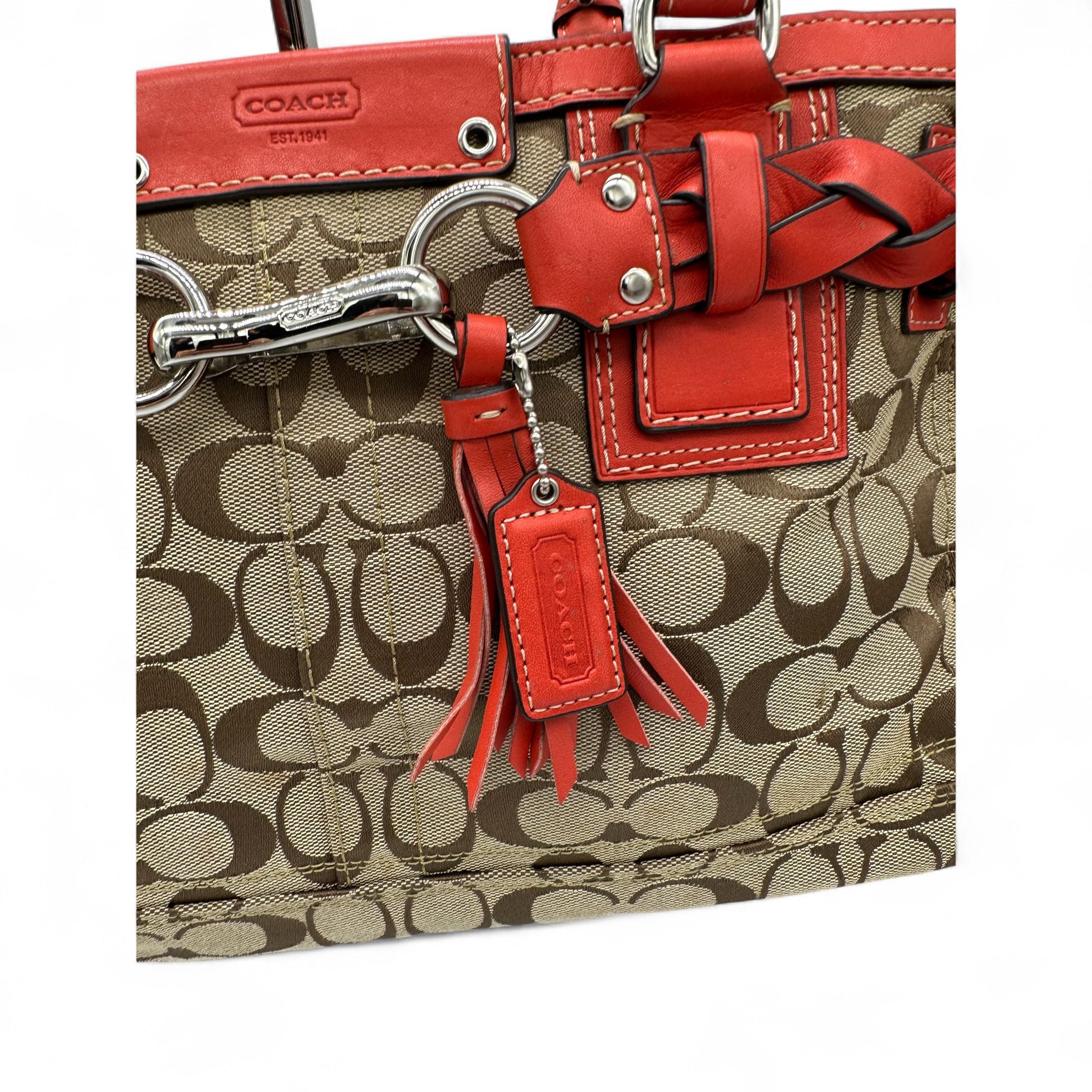 Model and style: Vintage Coach F13065 Hampton Clip Handbag in beige signature monogram with red leather trim and silver hardware. A Y2K piece from 2009.