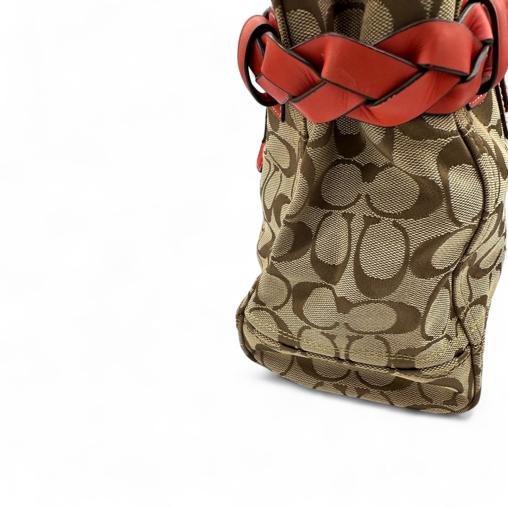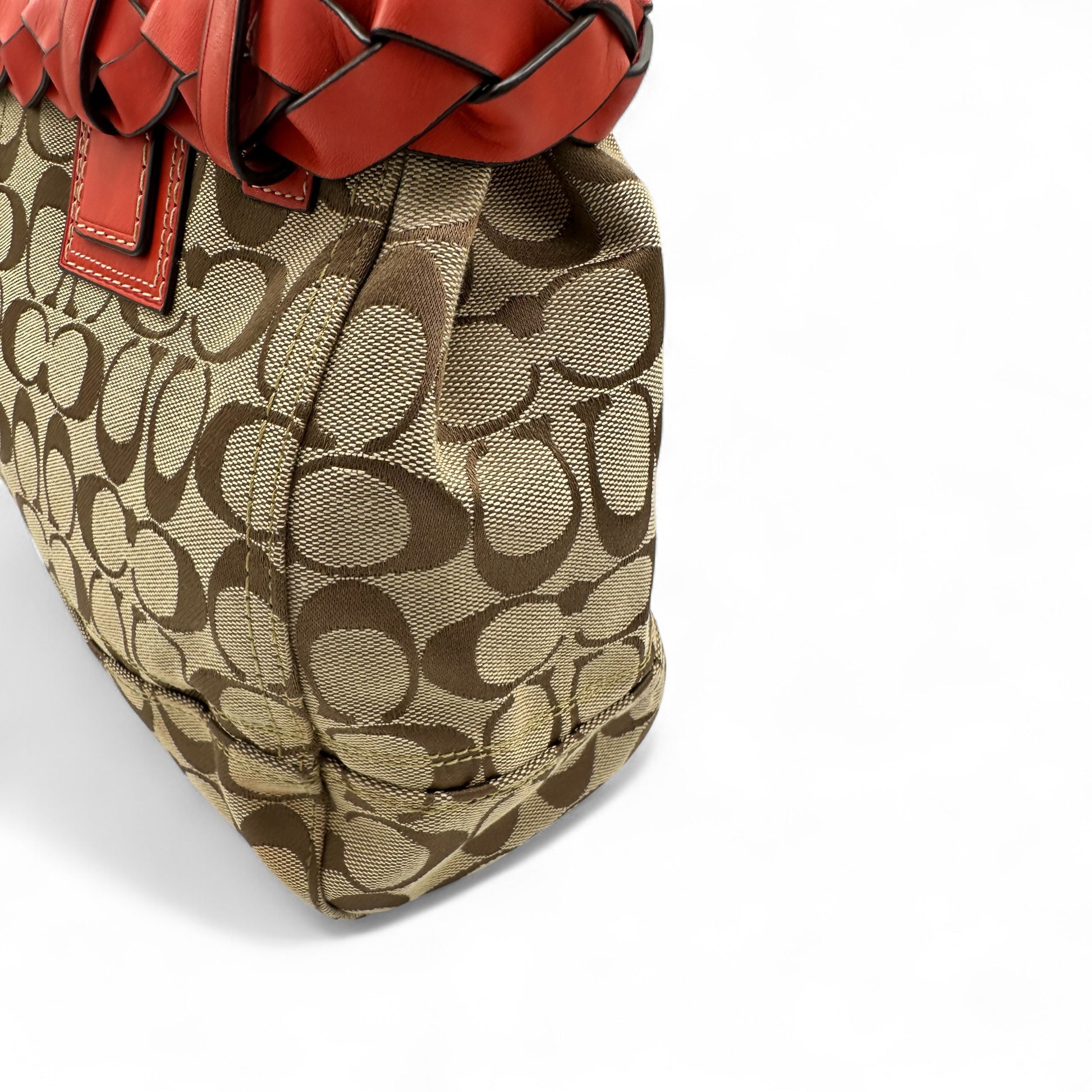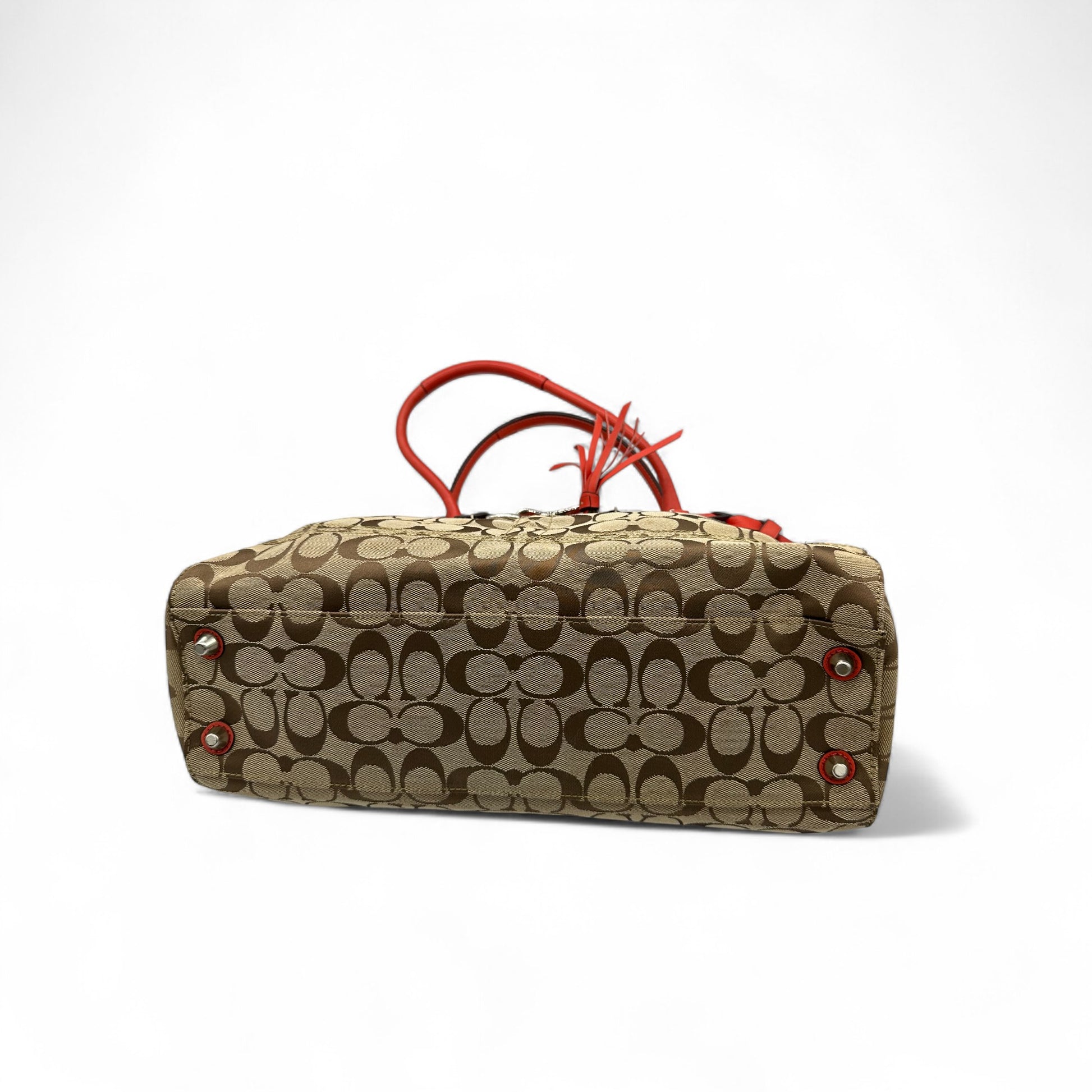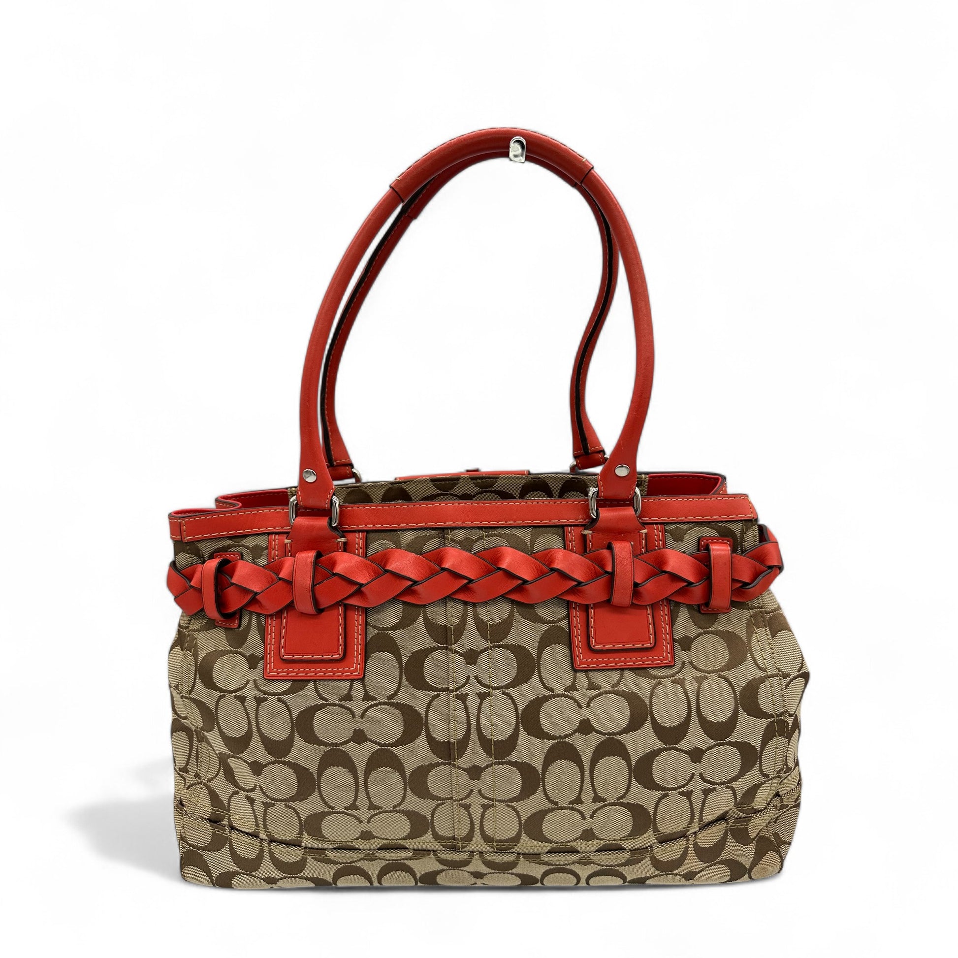 Model and style: Vintage Coach F13065 Hampton Clip Handbag in beige signature monogram with red leather trim and silver hardware. A Y2K piece from 2009.