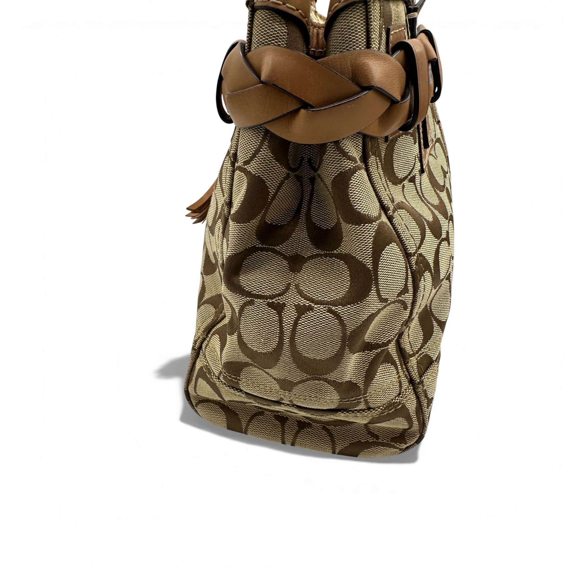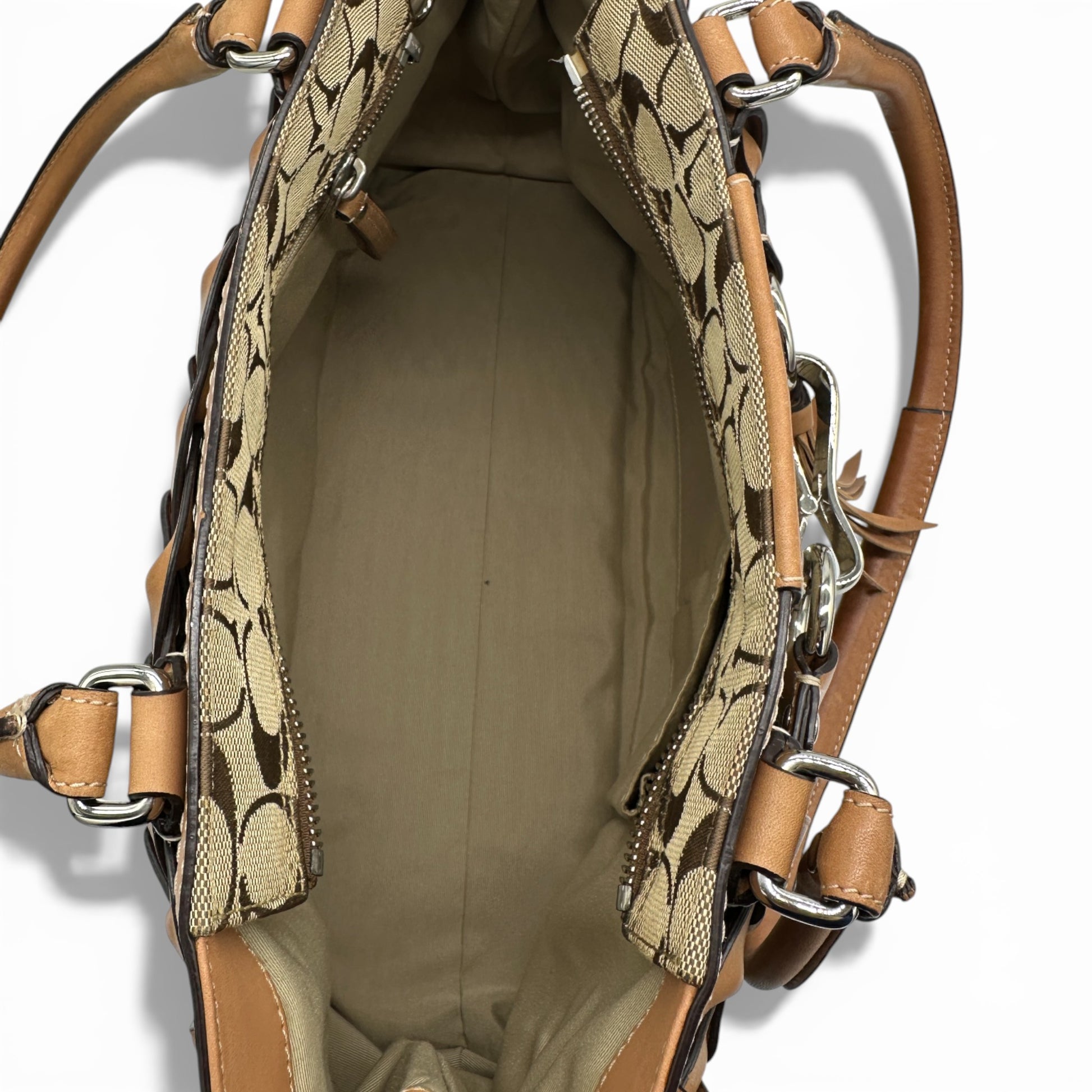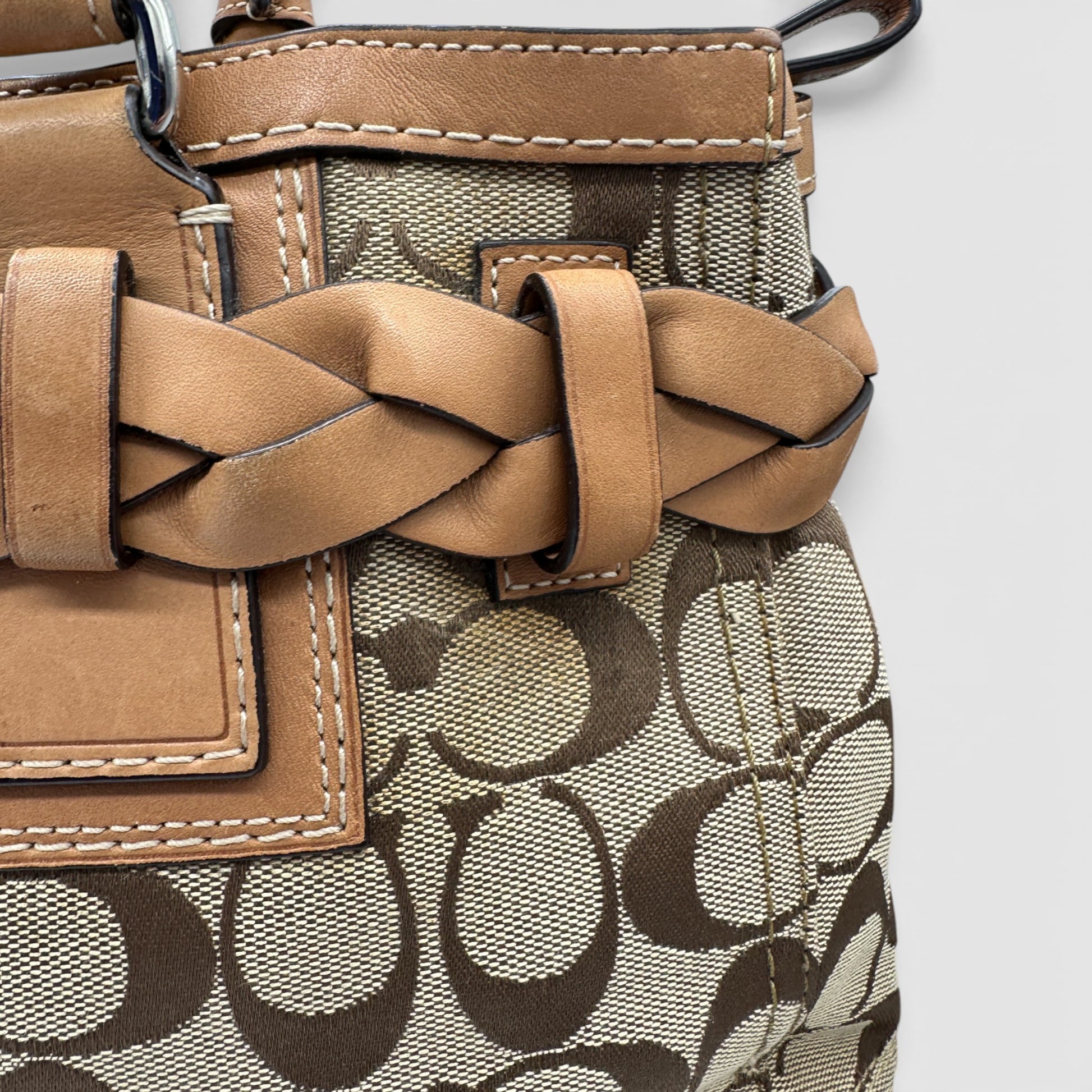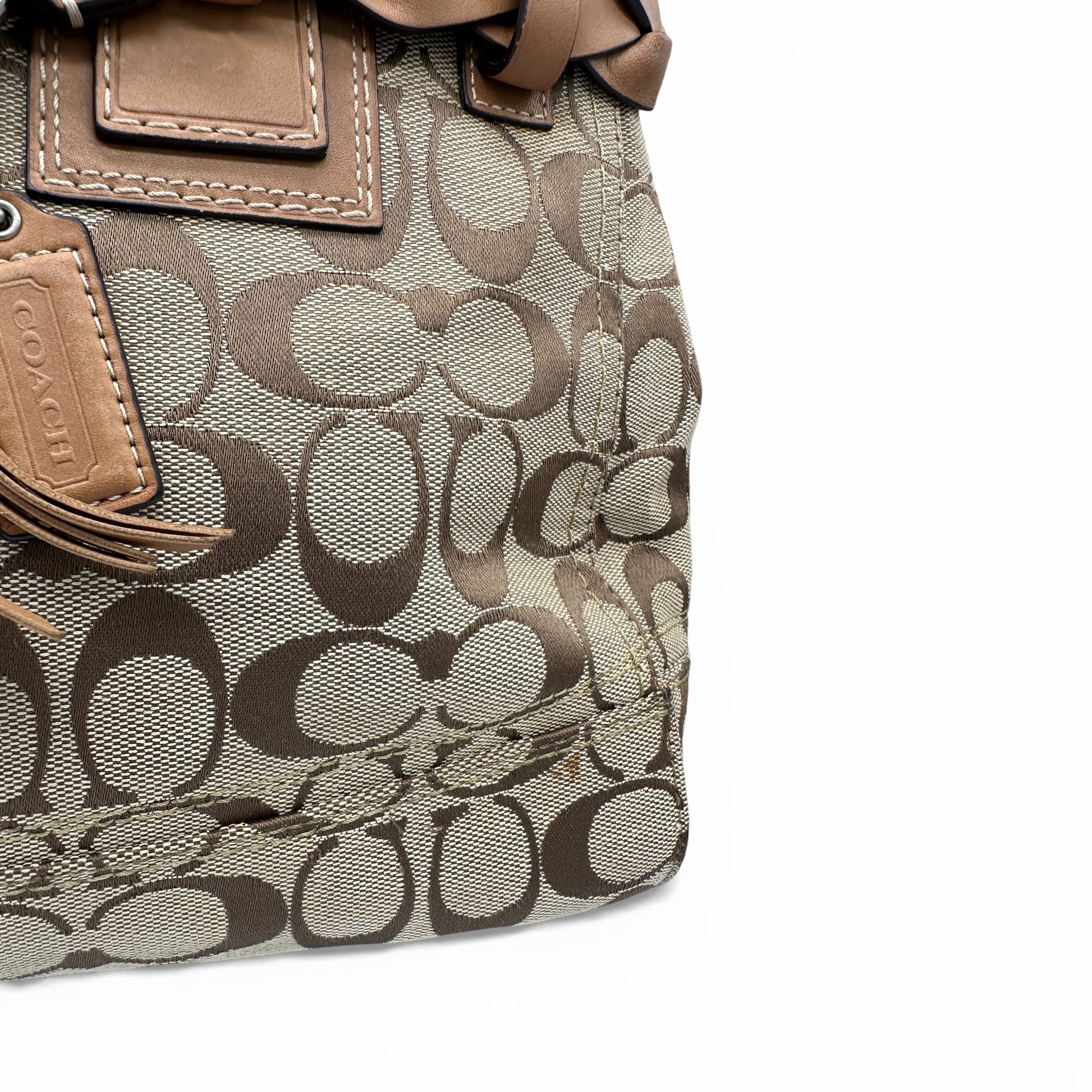 Vintage Coach F13068 Hampton Clip Handbag in signature monogram with tan leather trim and silver coloured hardware. A Y2K piece from 2008.