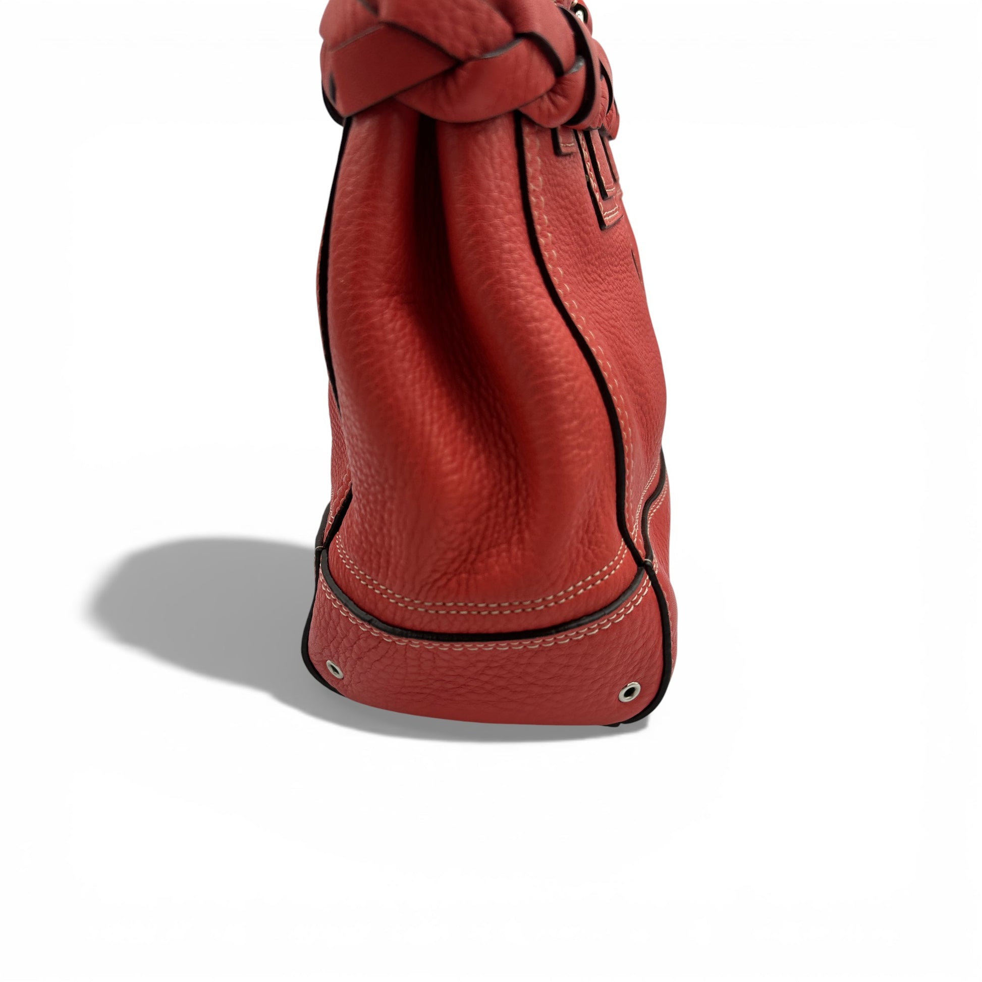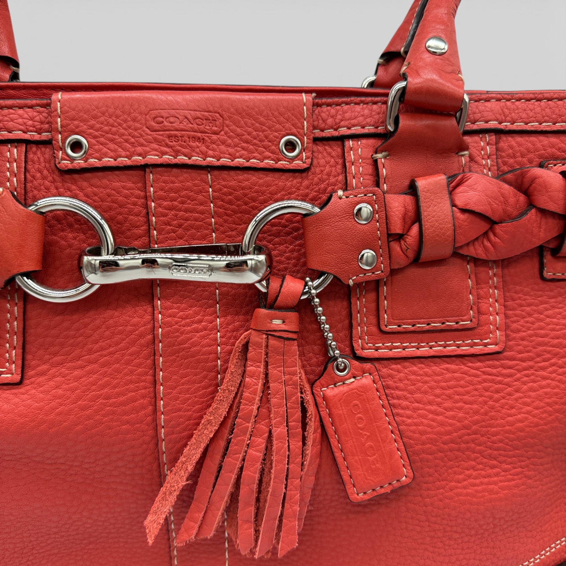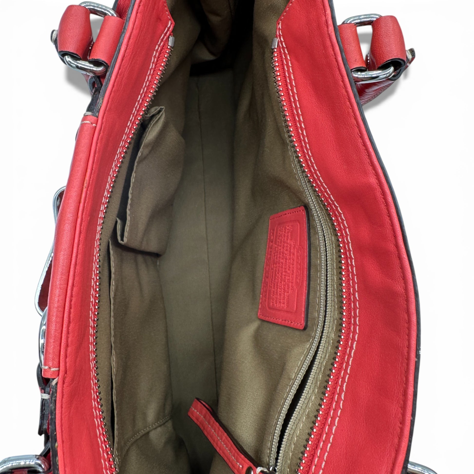 Vintage Coach F13087 Hampton Clip Handbag. In red soft pebbled cowhide leather, with silver horsebit buckle hardware and braided accents. A Y2K piece from 2009.