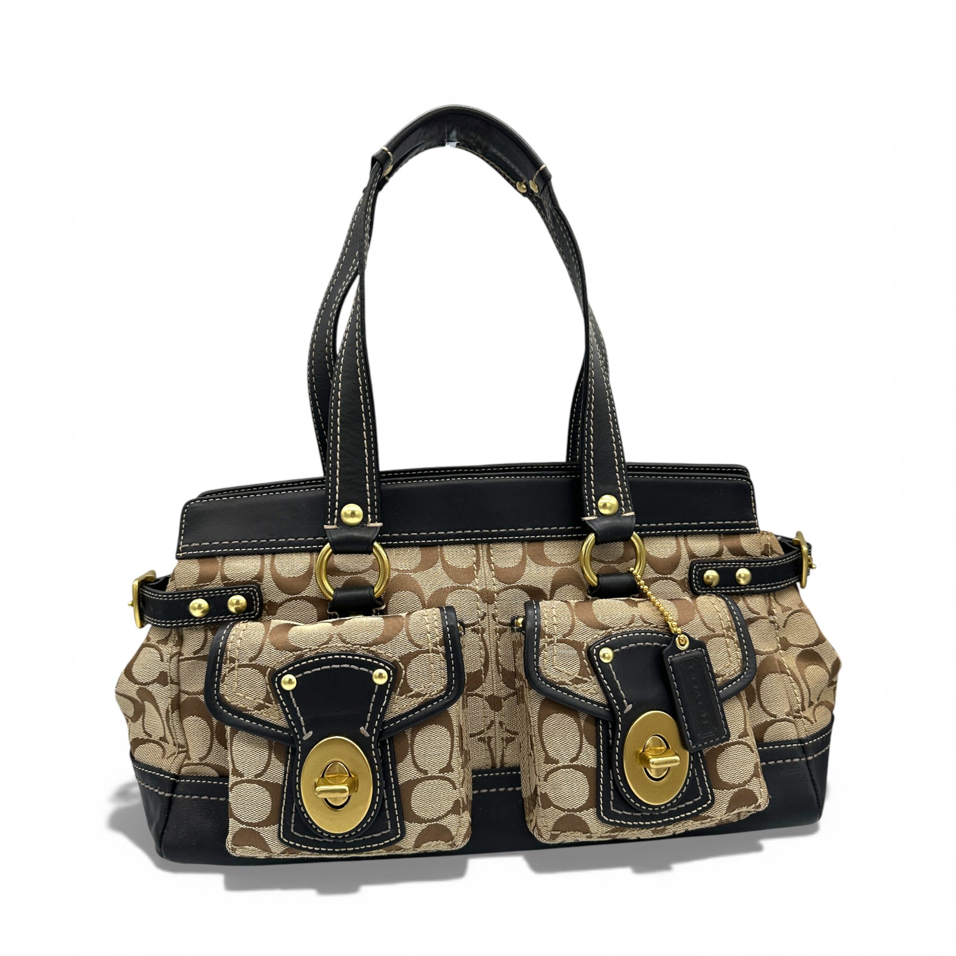 Vintage Coach F13131 Legacy Shoulder Bag. In brown and beige signature monogram, trimmed with black leather and brass gold-tone turnlock hardware. A rare Coach Legacy bag from 2008.