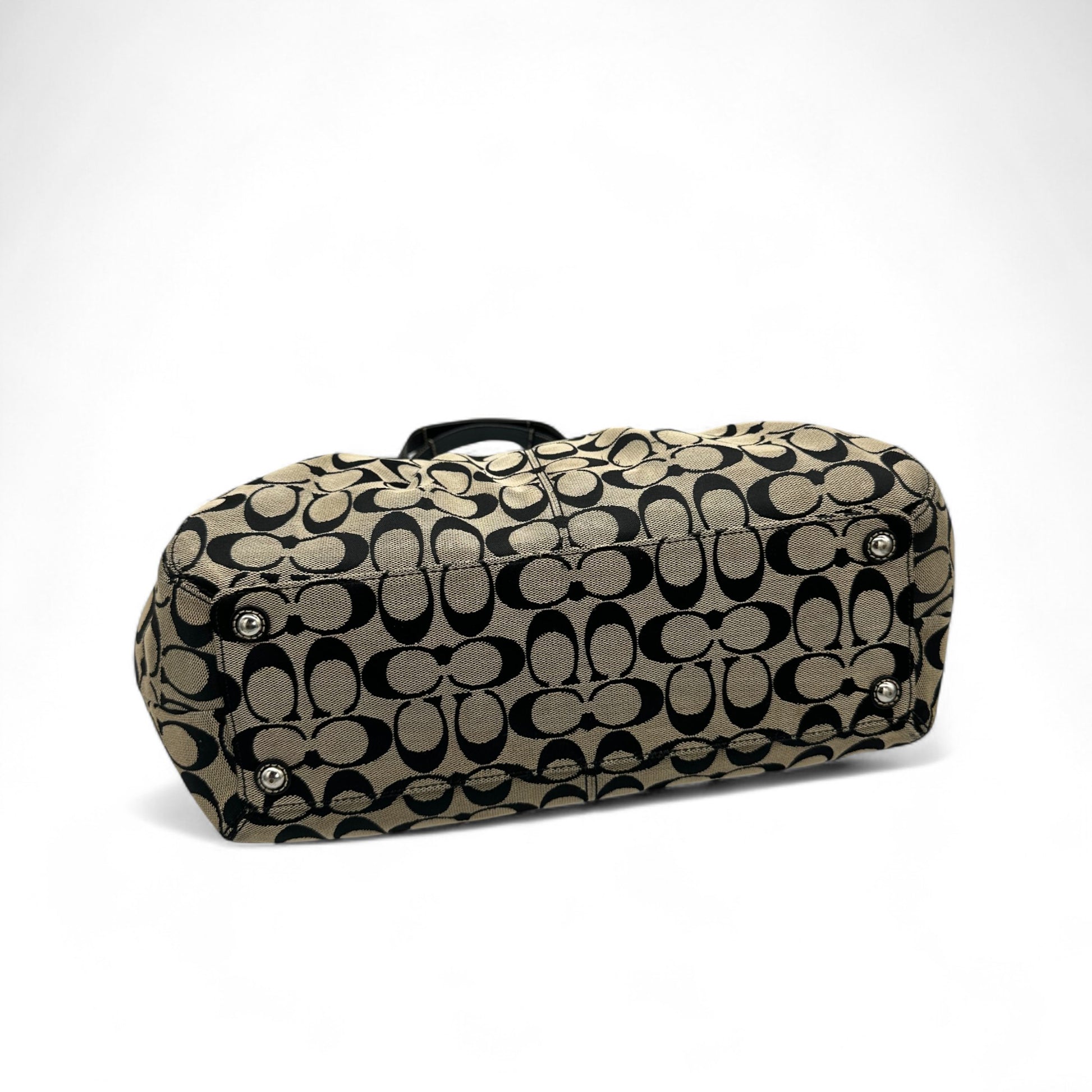 Model and style: Vintage Coach F13742 Soho Tote Shoulder Bag. In black and beige signature monogram, trimmed with black patent leather trim and silver buckle hardware detailing. A spacious bag which can be used comfortably as a handbag or shoulder bag.