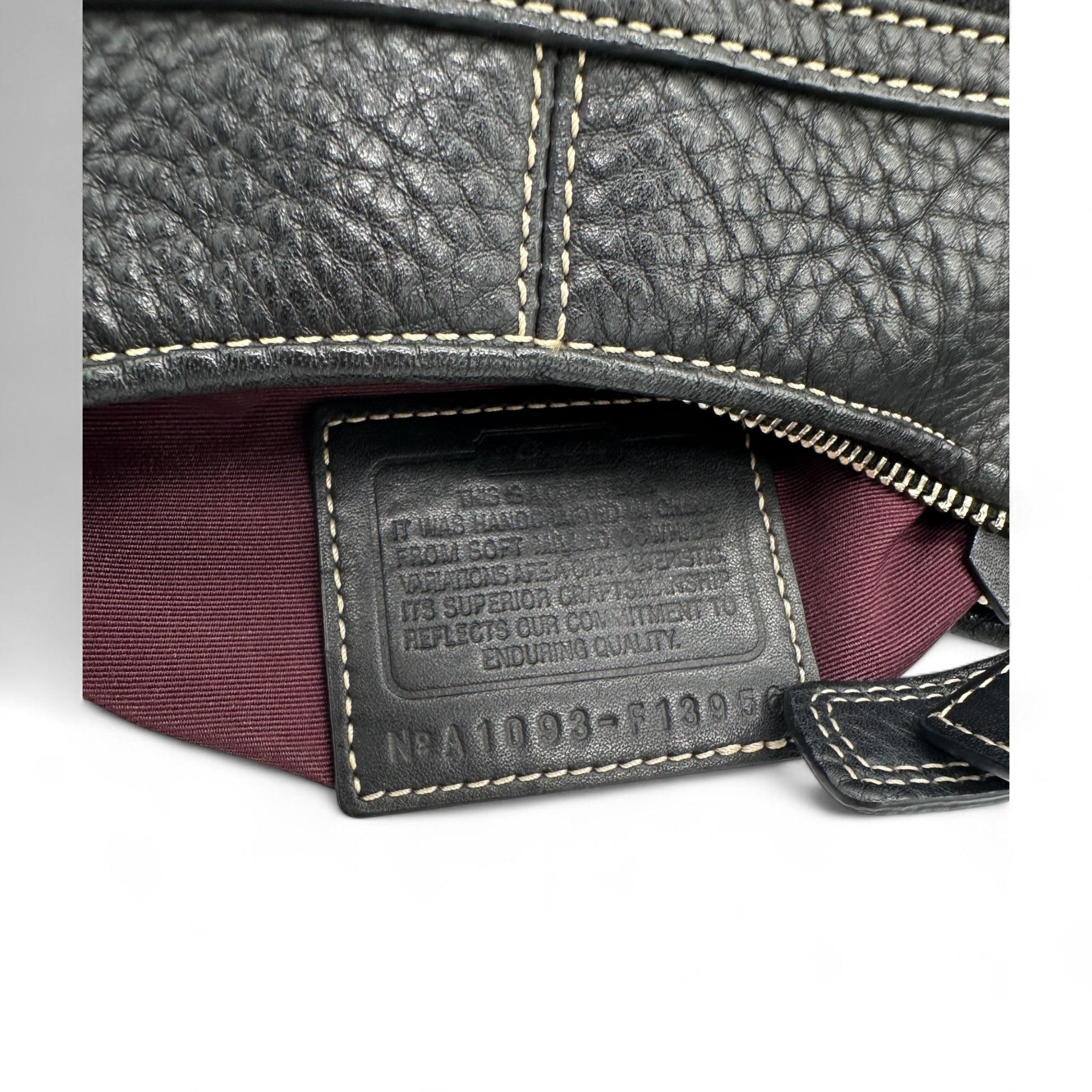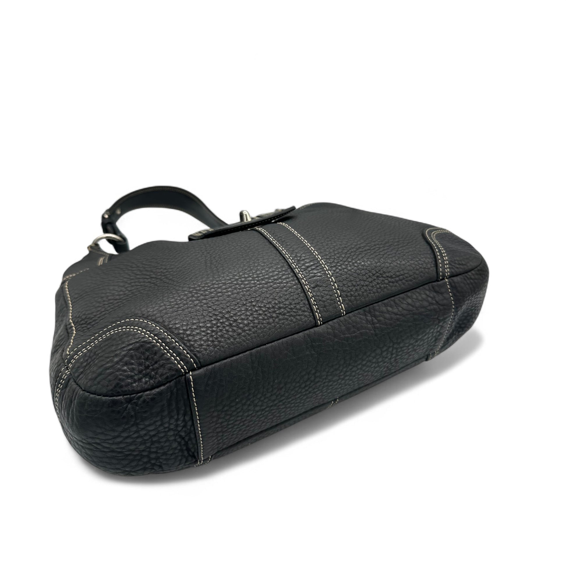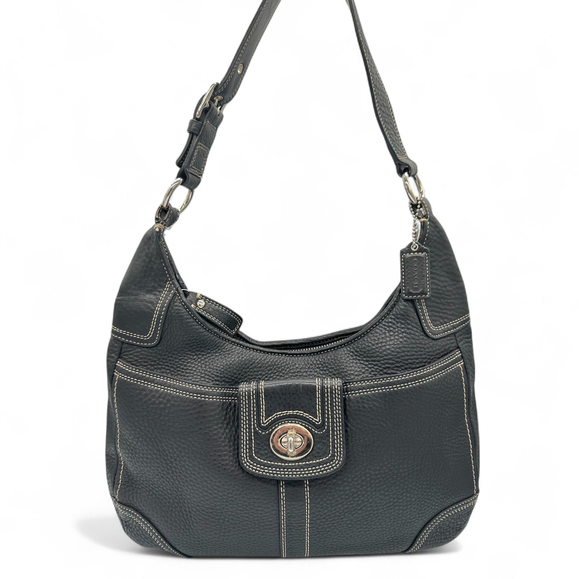 Model and style: Vintage Coach F13956 Hamilton Turnlock Shoulder Bag. In black soft milled pebbled cowhide leather with silver turnlock hardware and zip closure.