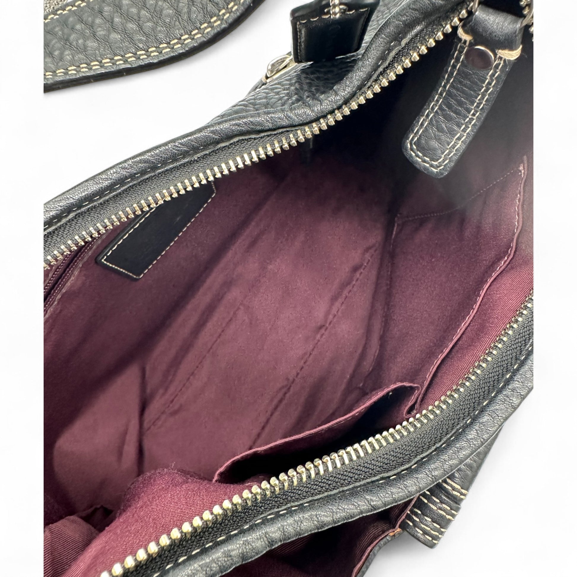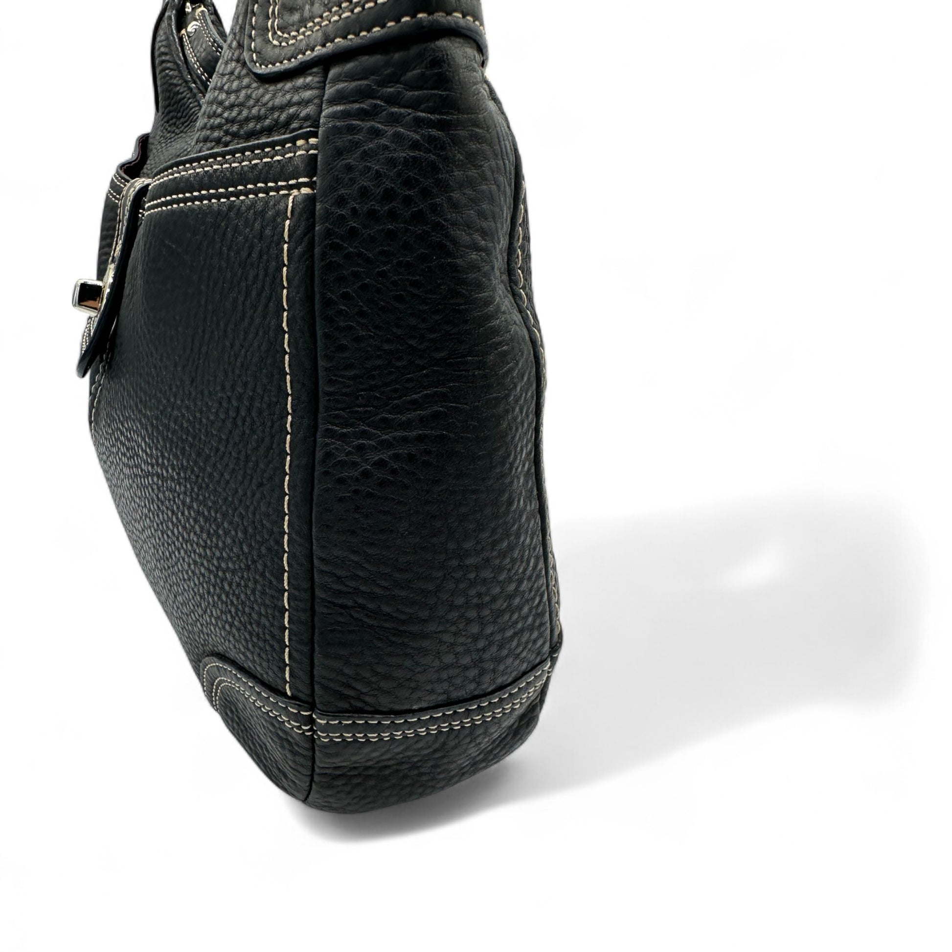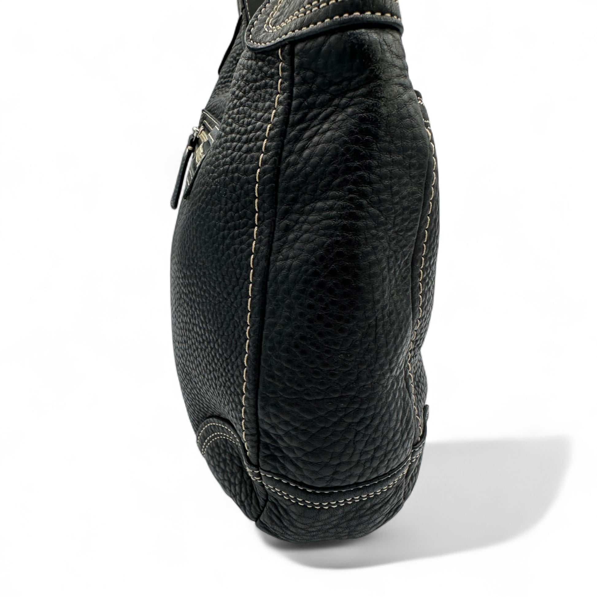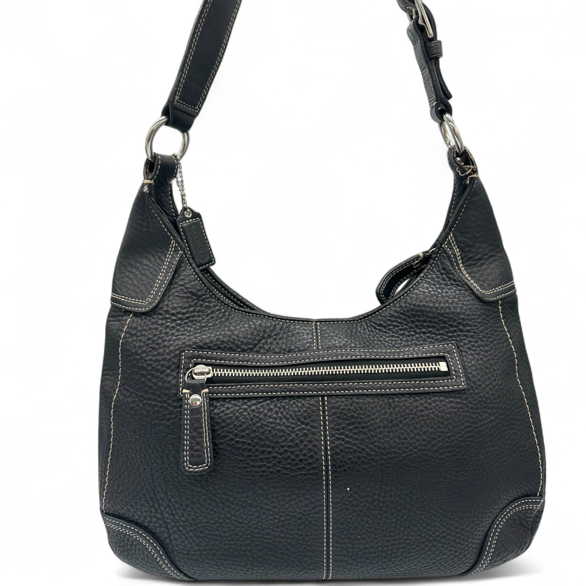 Model and style: Vintage Coach F13956 Hamilton Turnlock Shoulder Bag. In black soft milled pebbled cowhide leather with silver turnlock hardware and zip closure.