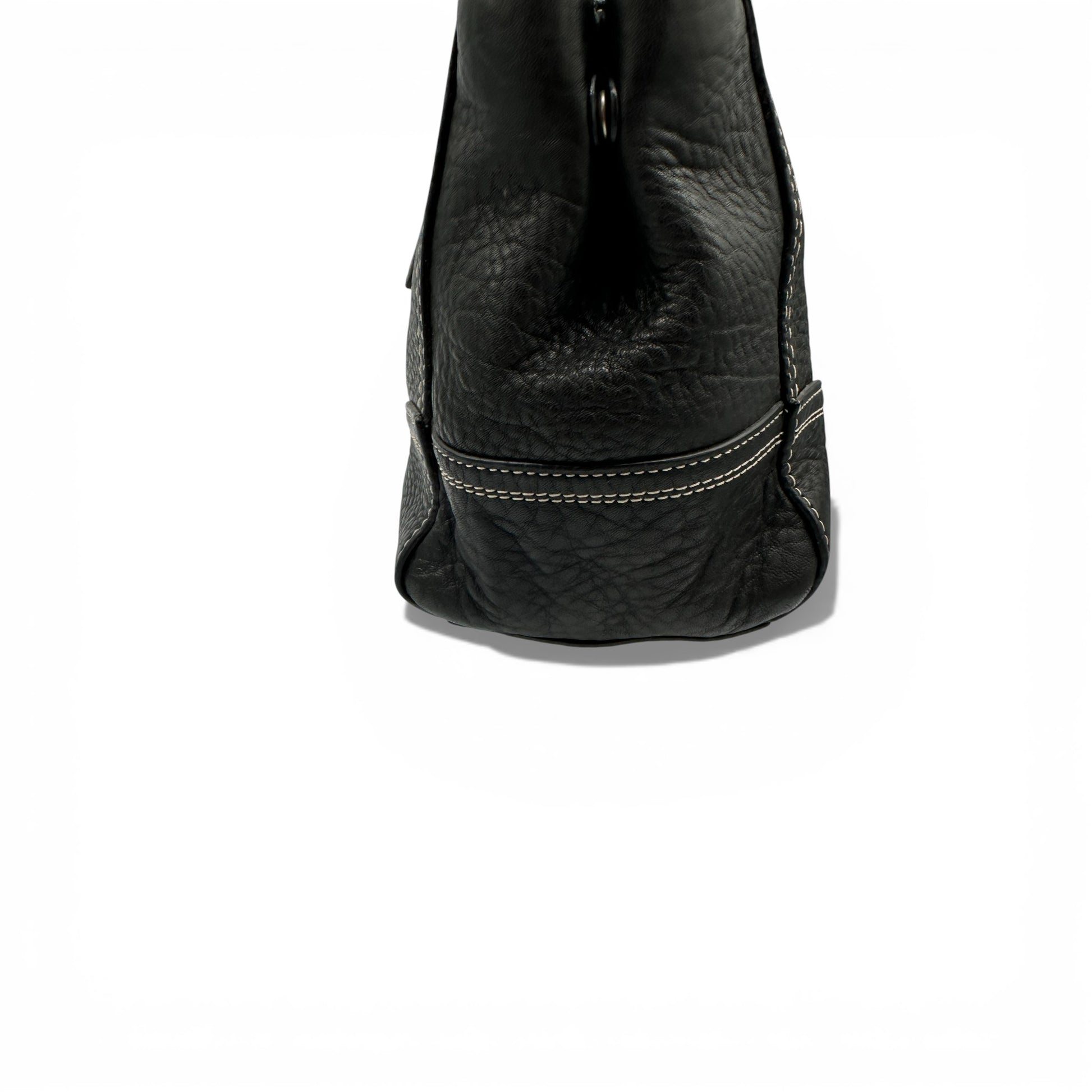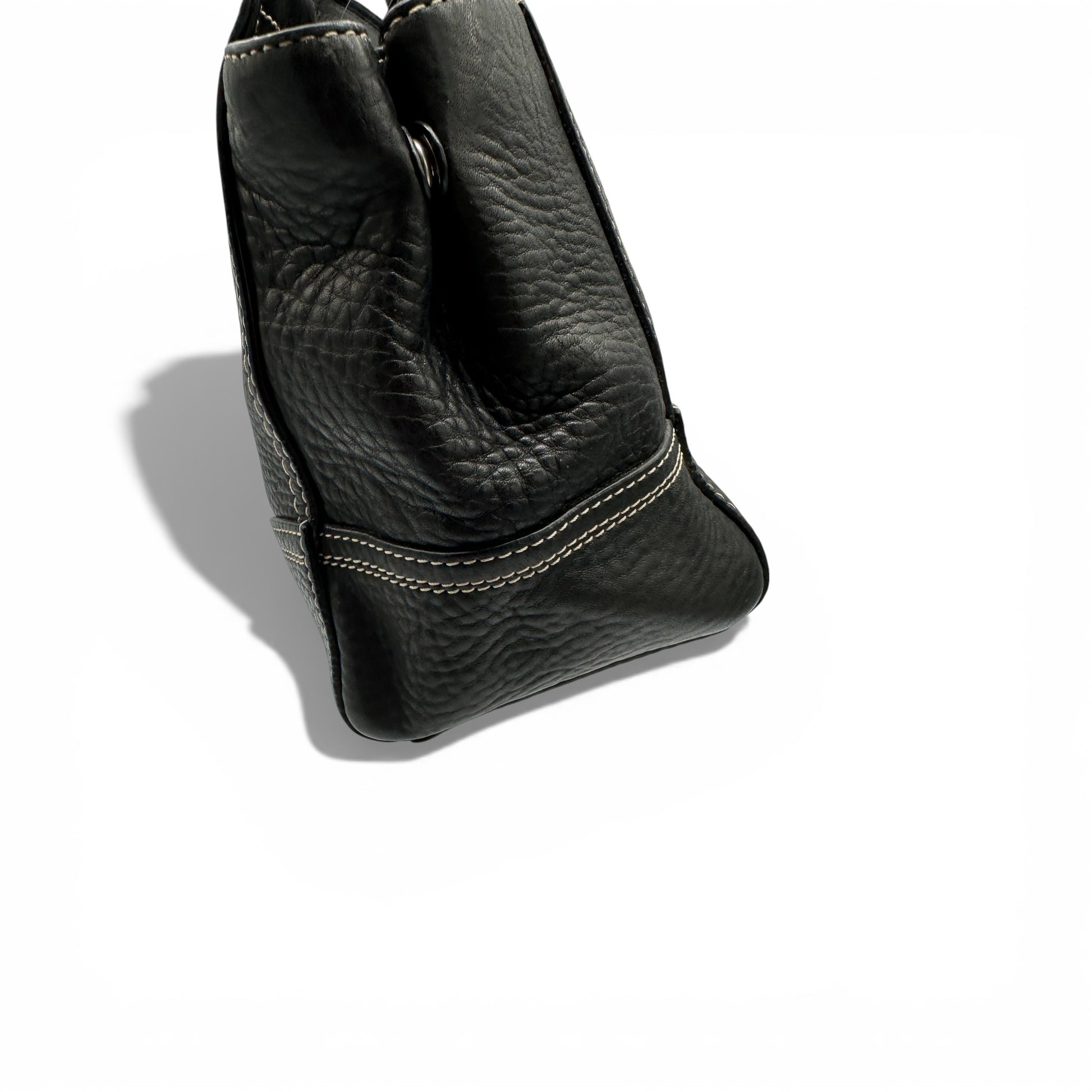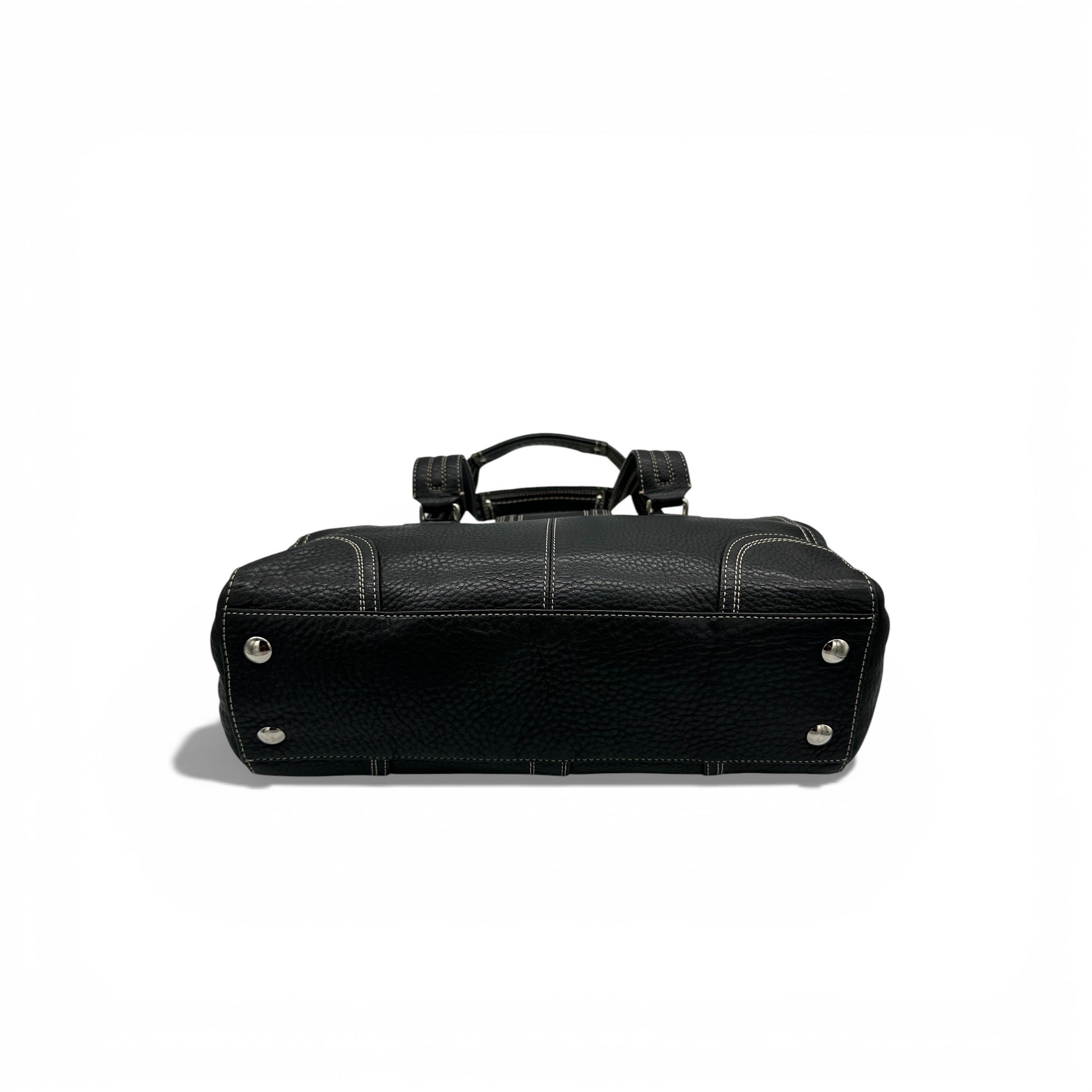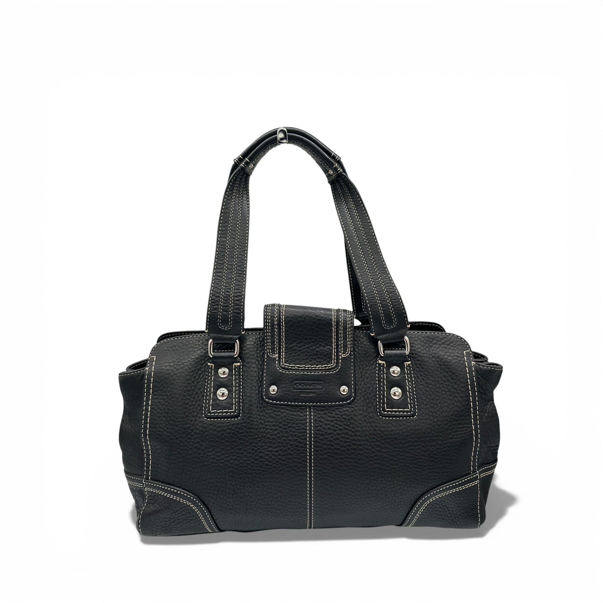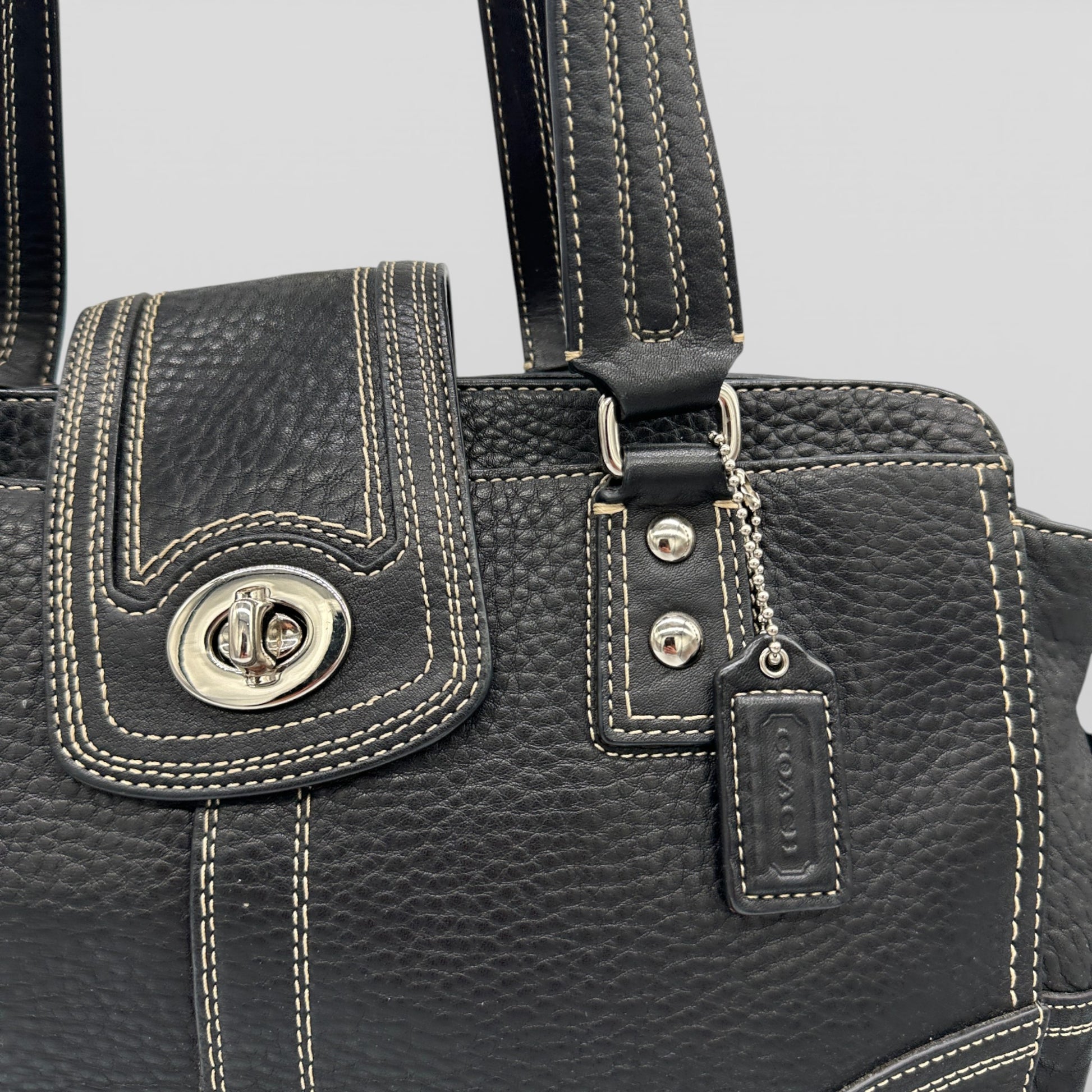 Vintage Coach F13961 Hampton Carryall Shoulder Bag. In black pebbled cowhide leather with silver turnlock closure and white stitching detailing. A Y2K piece from 2009.