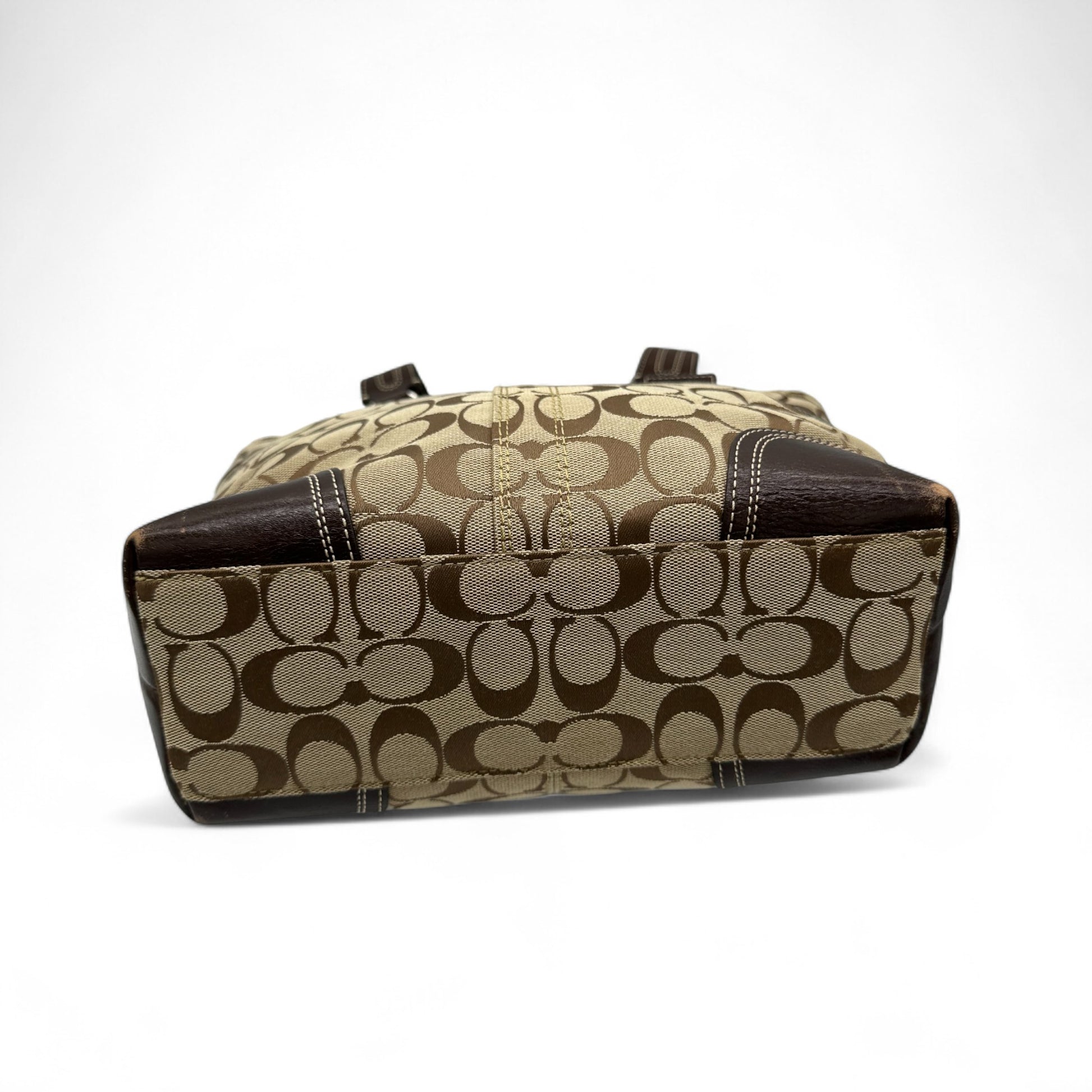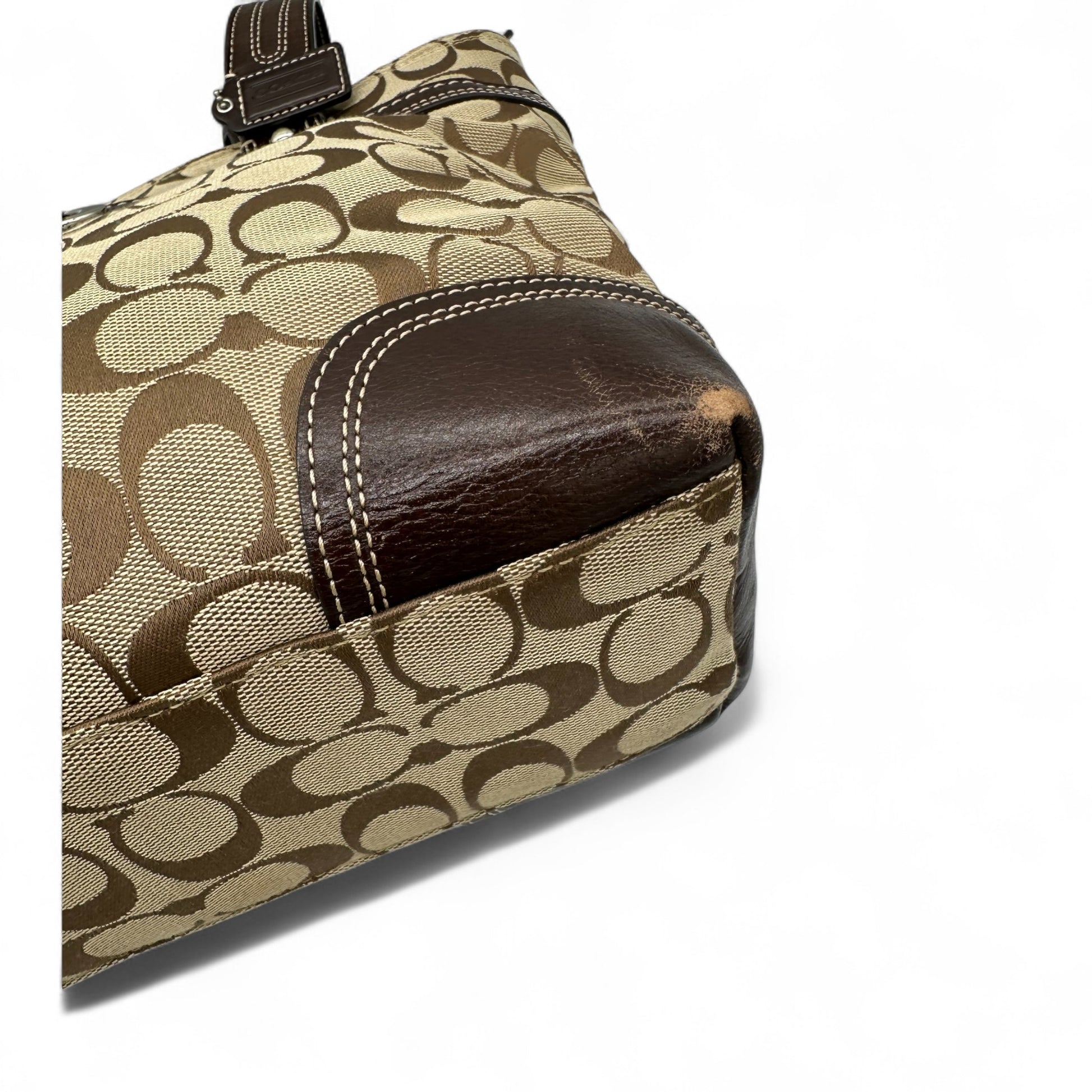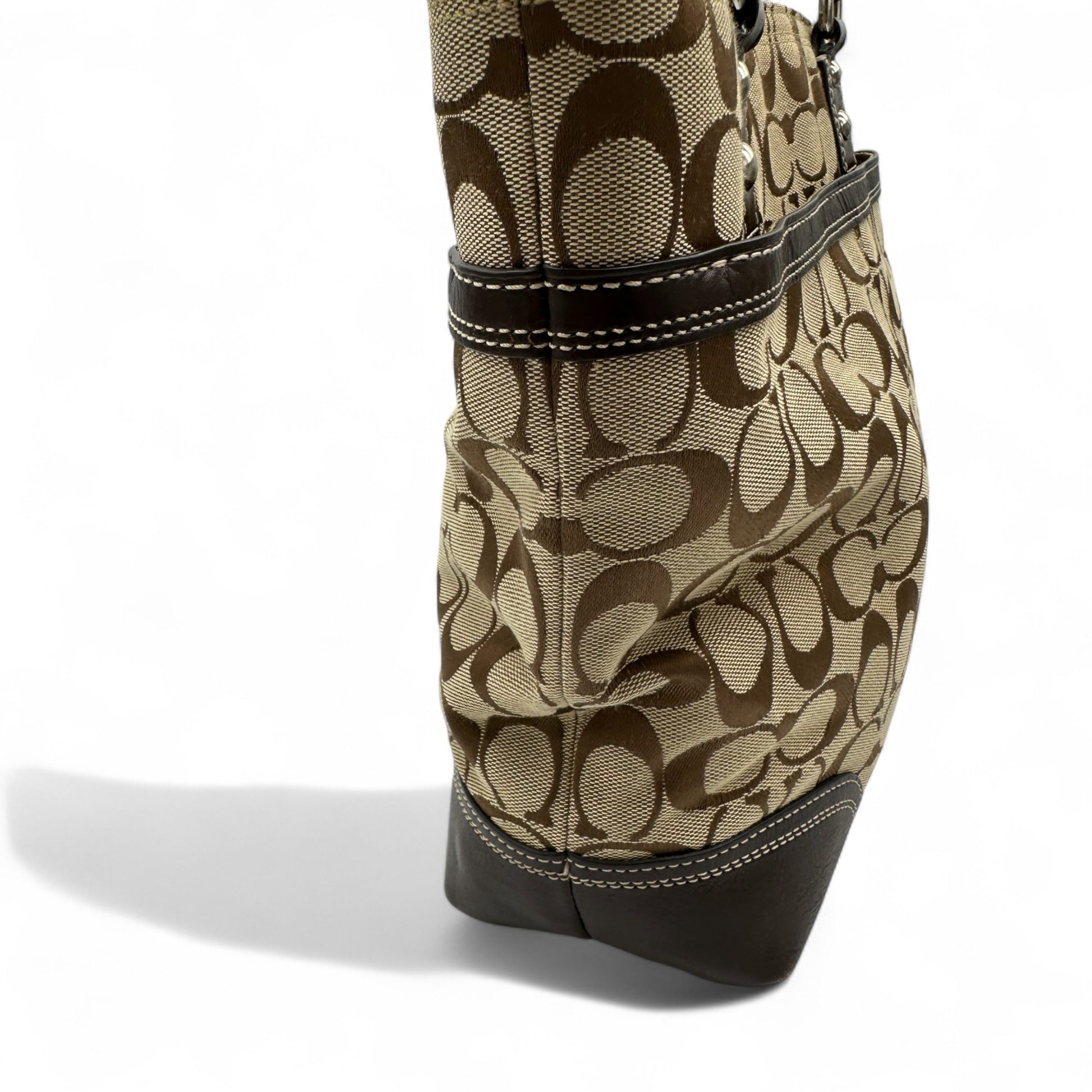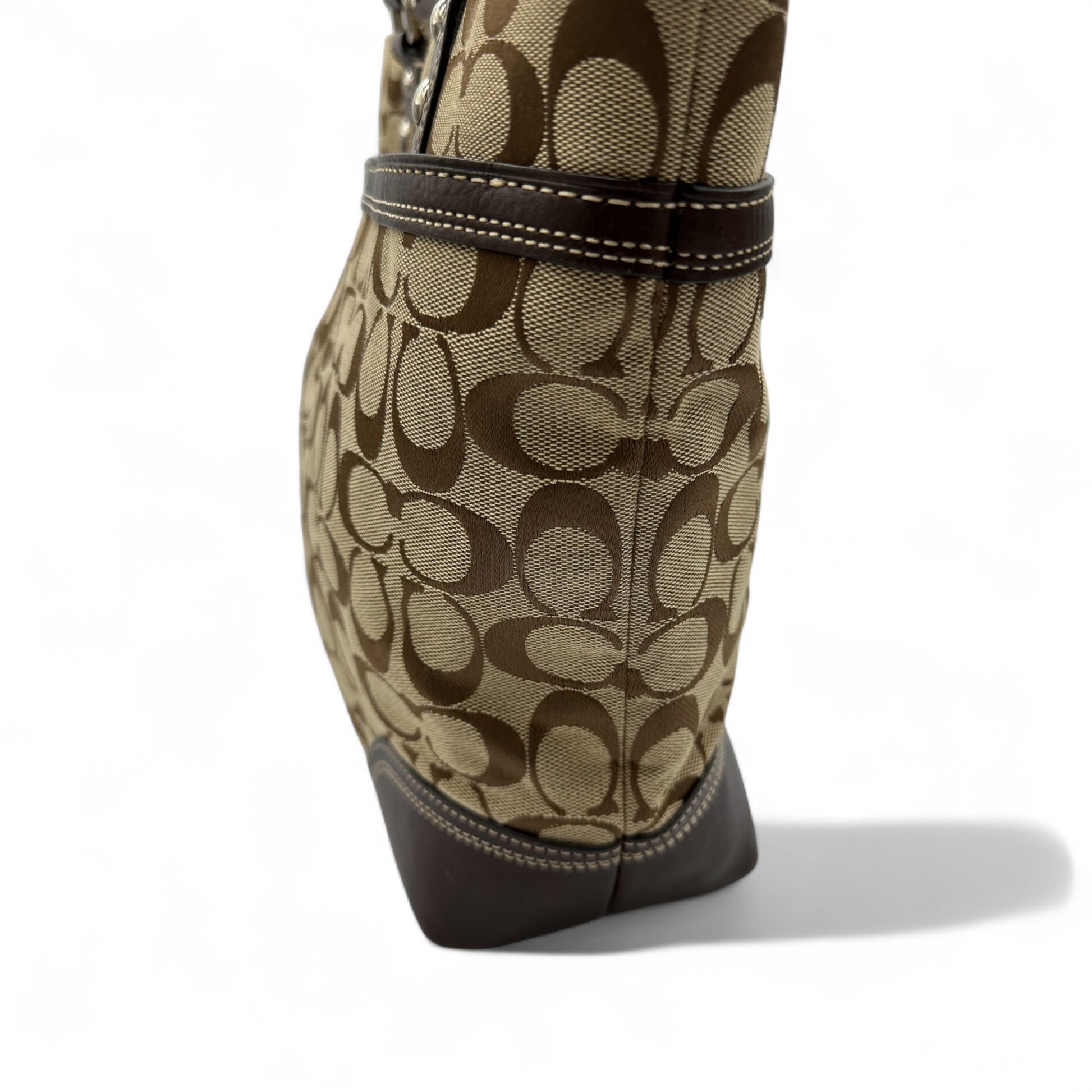 Model and style: Vintage Coach Hamptons F13973 Turnlock Tote Shoulder Bag. In brown and beige signature monogram, trimmed with brown leather and silver Turnlock hardware.