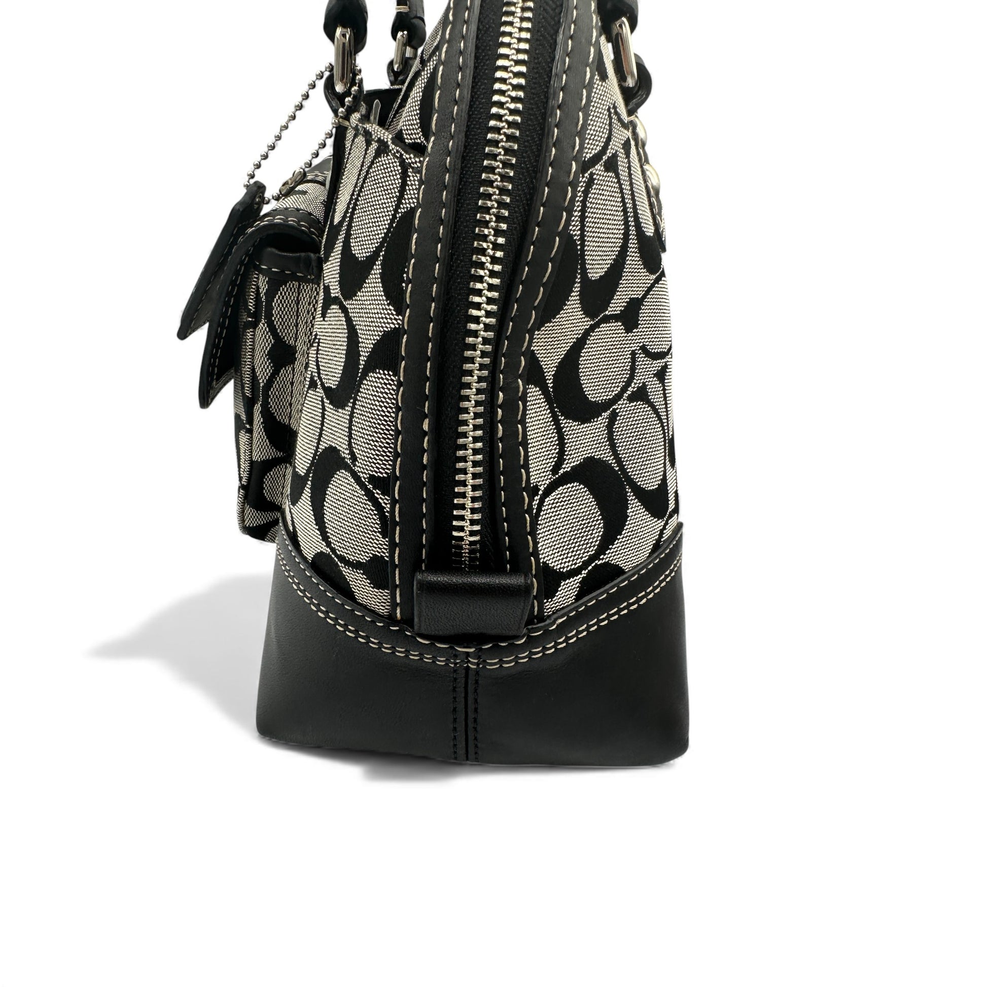 Vintage Coach F13977 Miranda Turnlock Handbag in black and grey signature monogram with black leather trim and silver turnlock, Y2K piece from 2009.