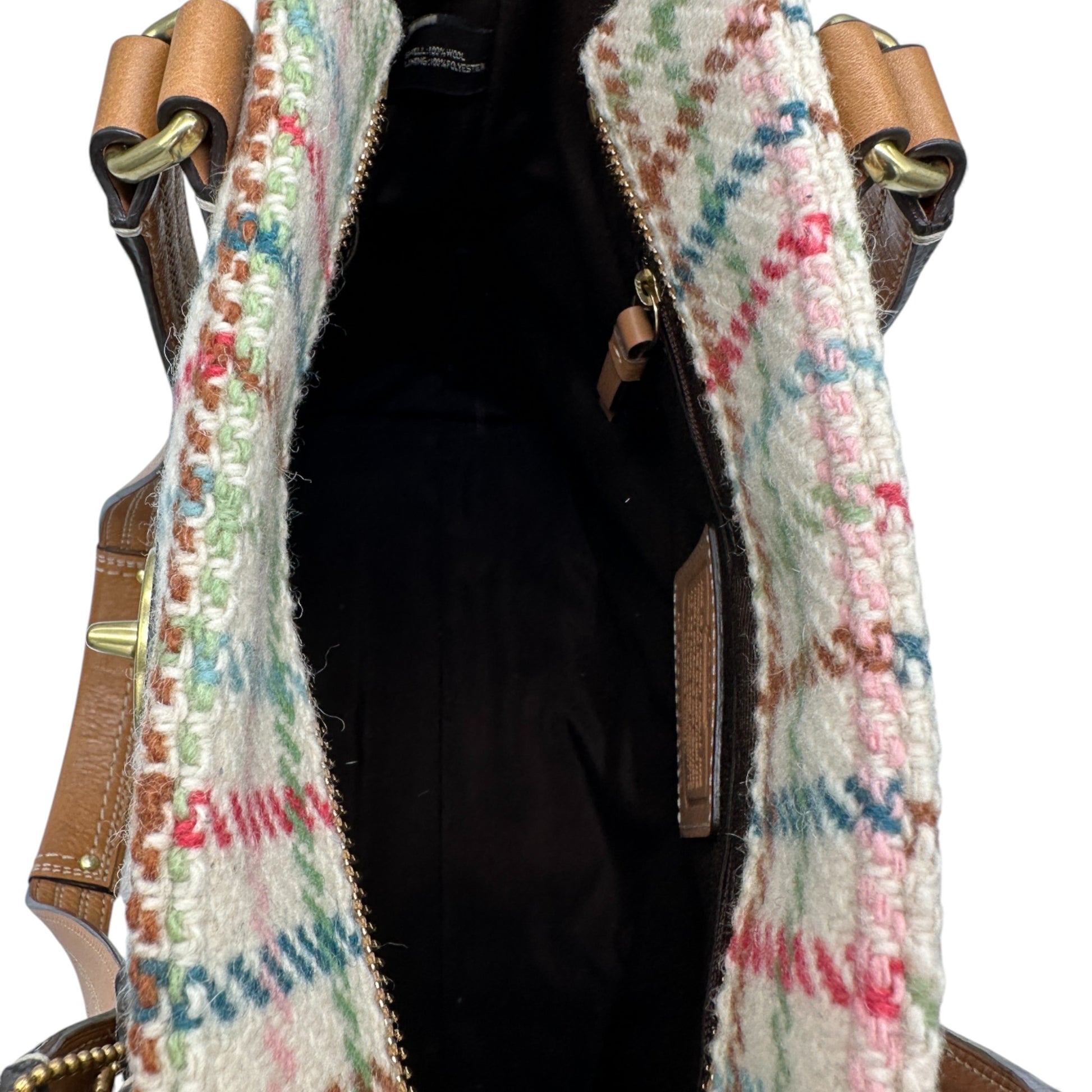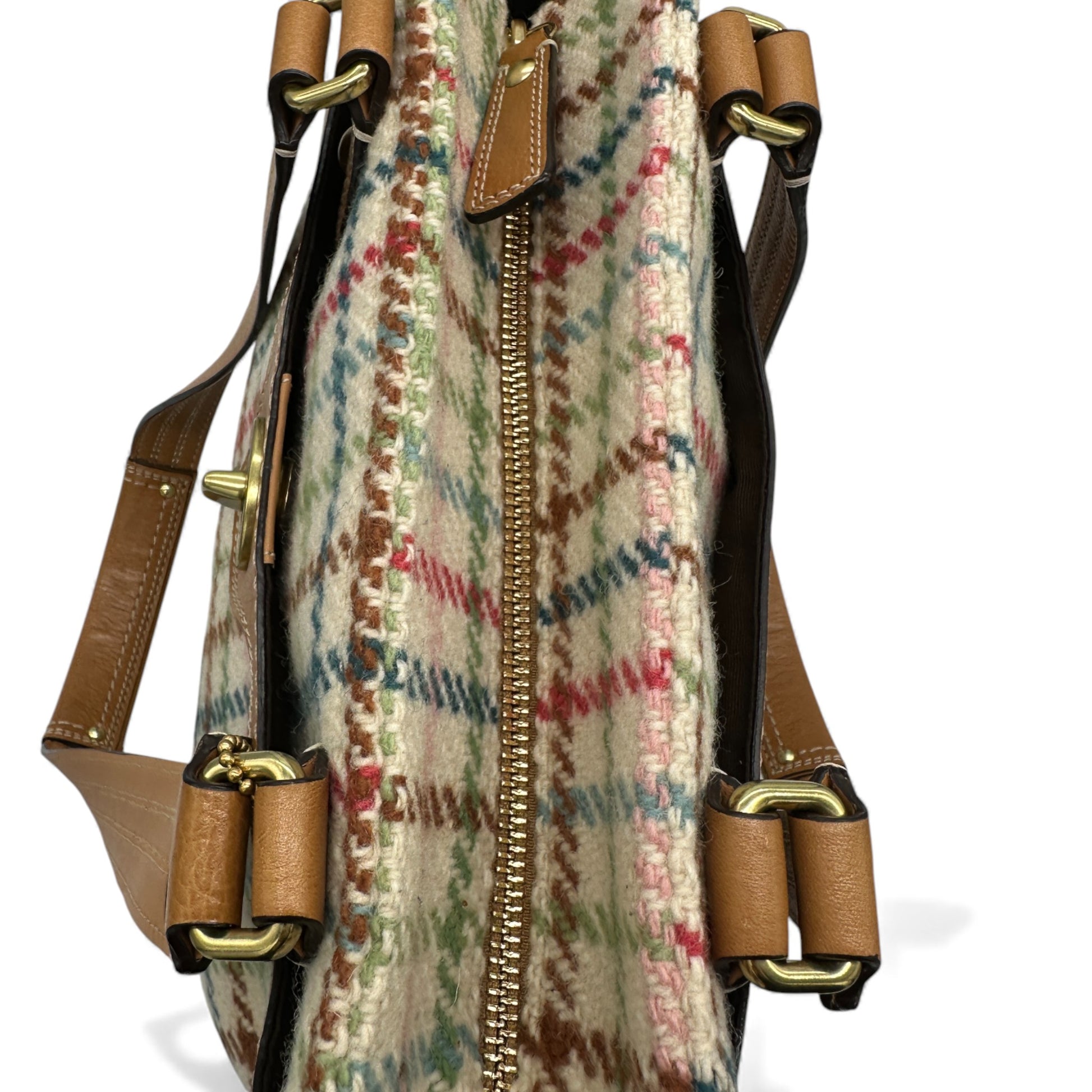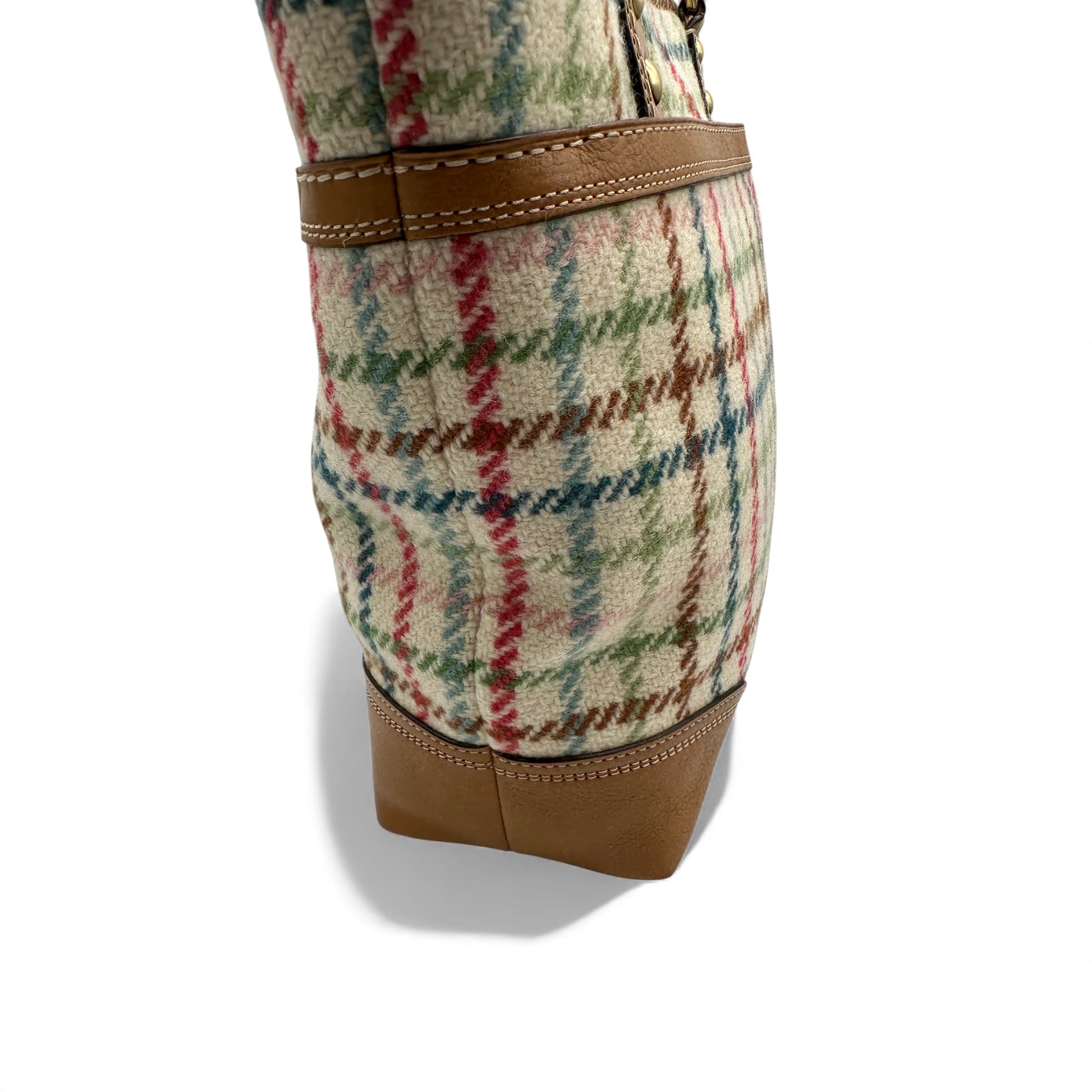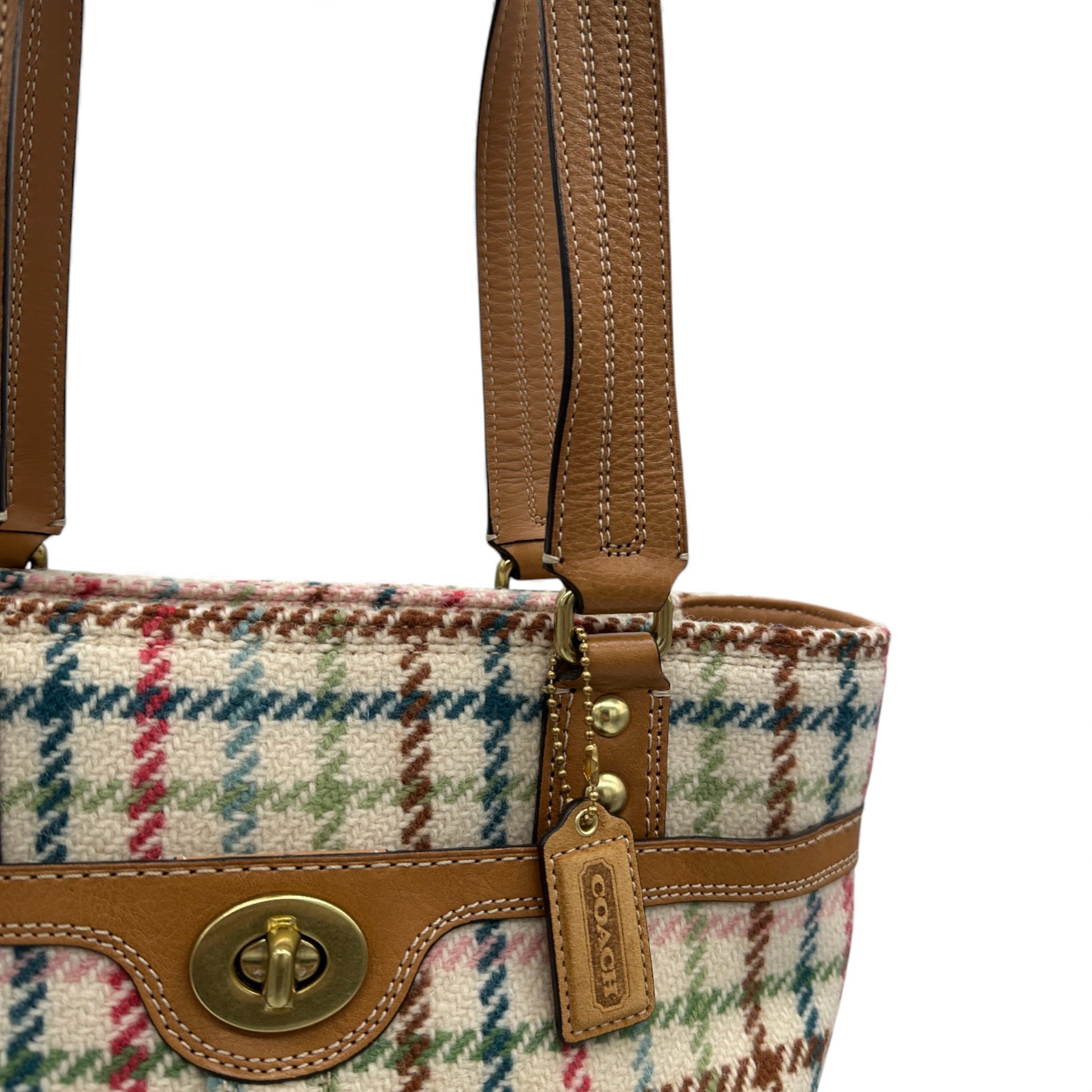 Vintage Coach F13985 Hampton Tattersall Shoulder Bag In tattersall beige, grey and multicolour wool tweed, trimmed with tan leather and gold coloured turnlock hardware. A rare Y2K piece from 2009.