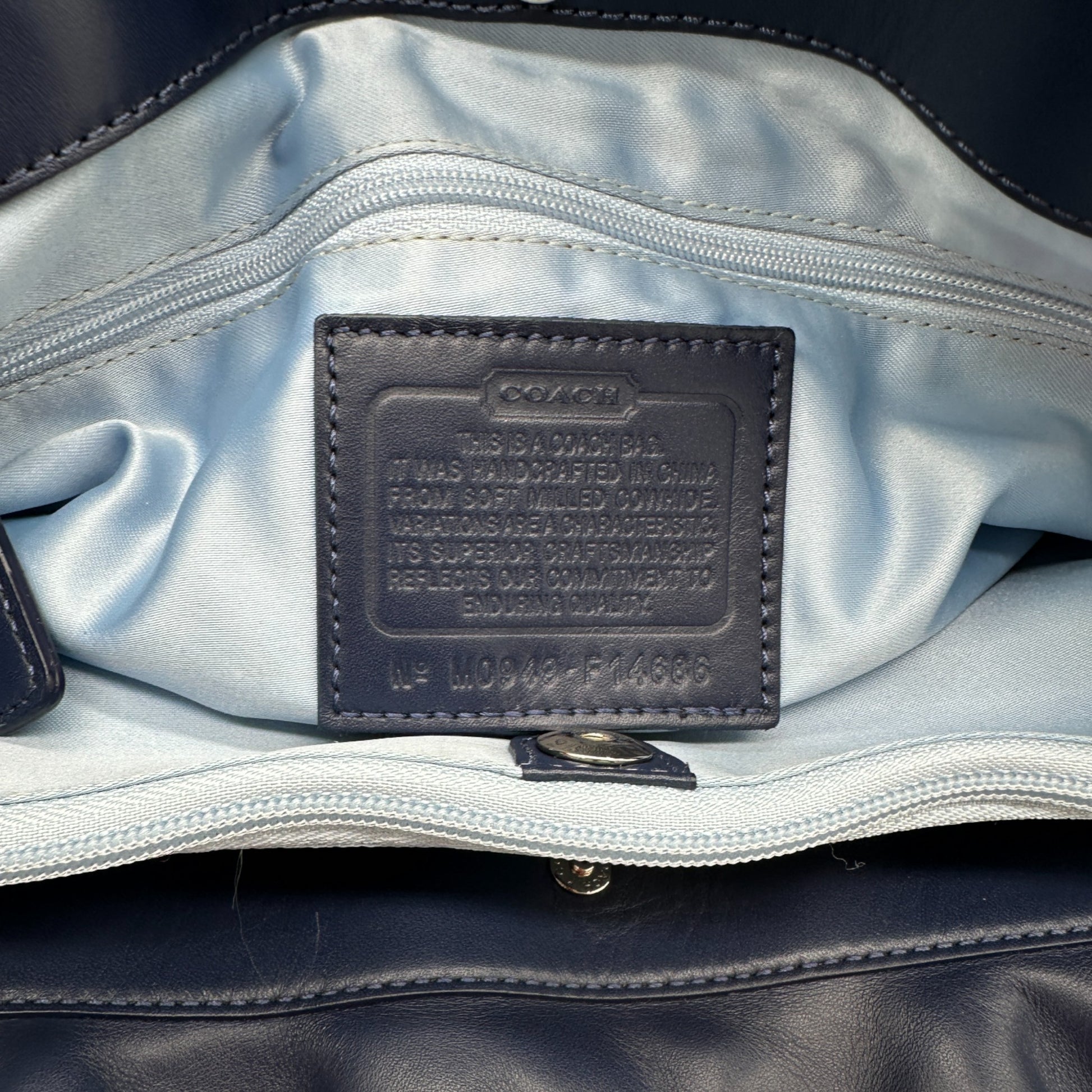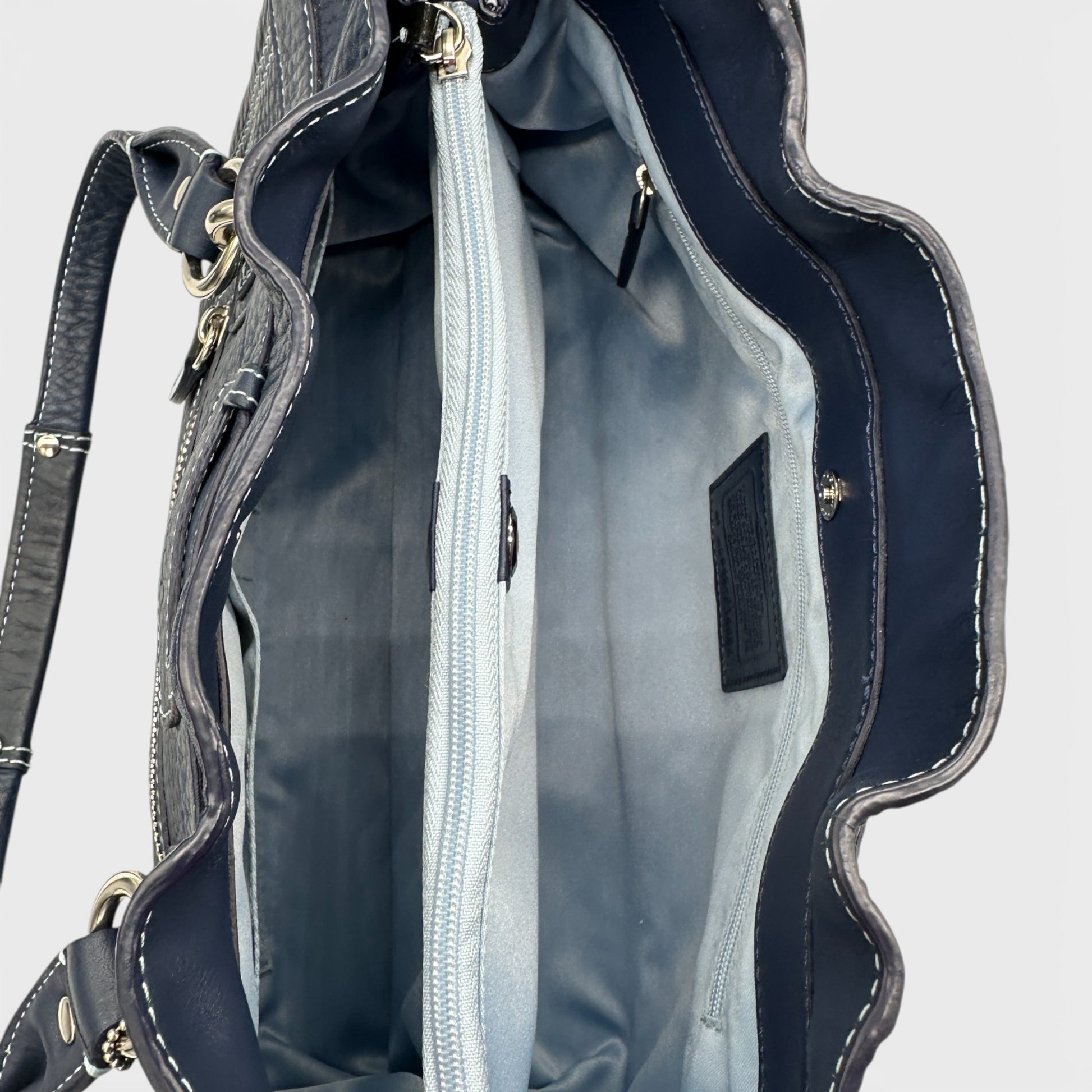 Vintage Coach F14686 Penelope Tote Shoulder Bag. In soft navy pebbled leather, with silver hardware. A large sized tote handbag, suited to carrying those daily essentials and books or a laptop. A Y2K piece from 2009.