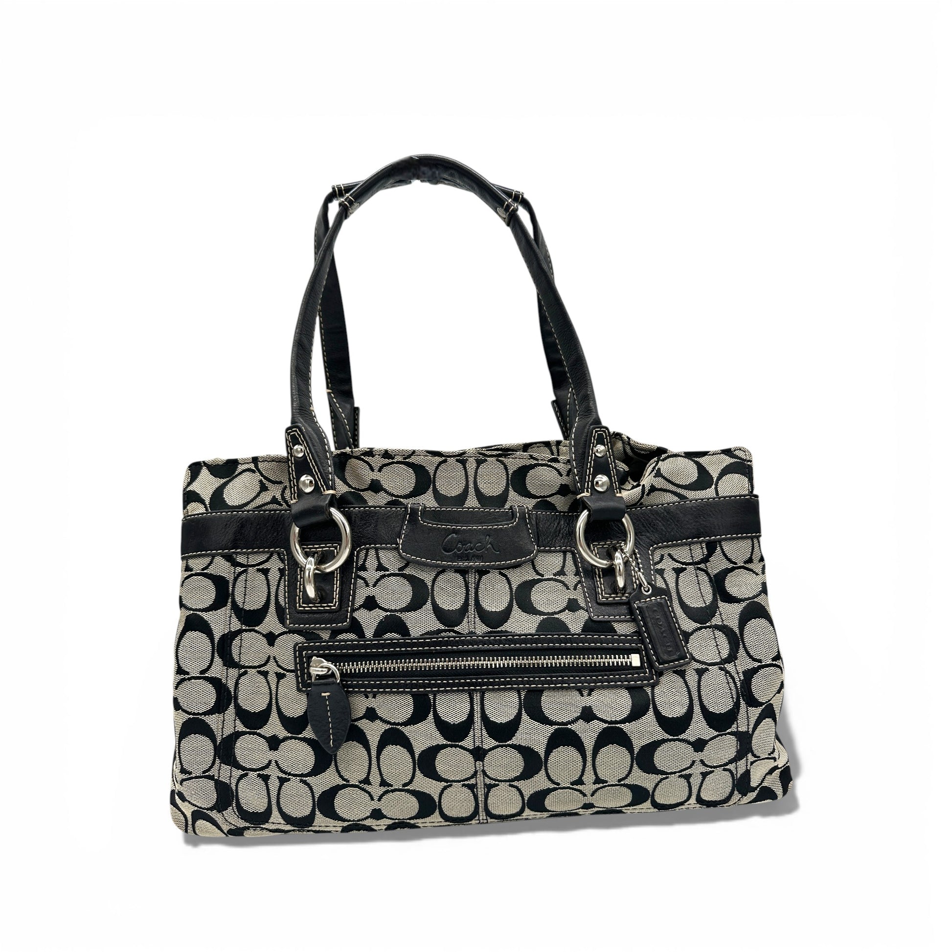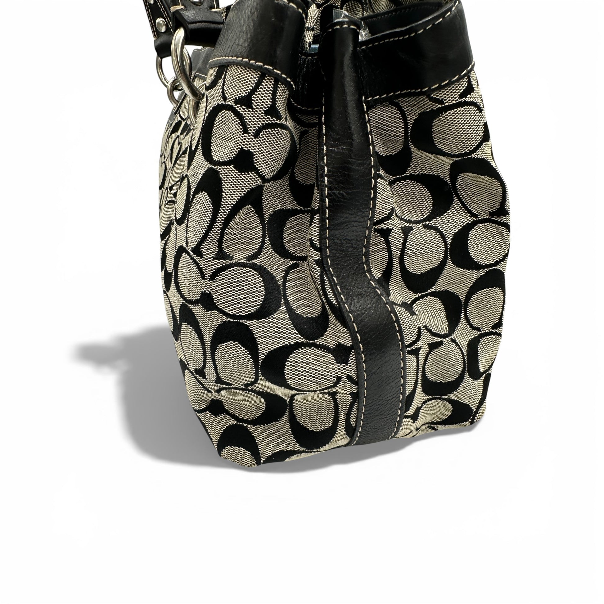 Vintage Coach F14692 Tote Shoulder Bag. In brown and beige signature monogram, trimmed with with black leather trim and silver-tone hardware. A Y2K piece from 2010.