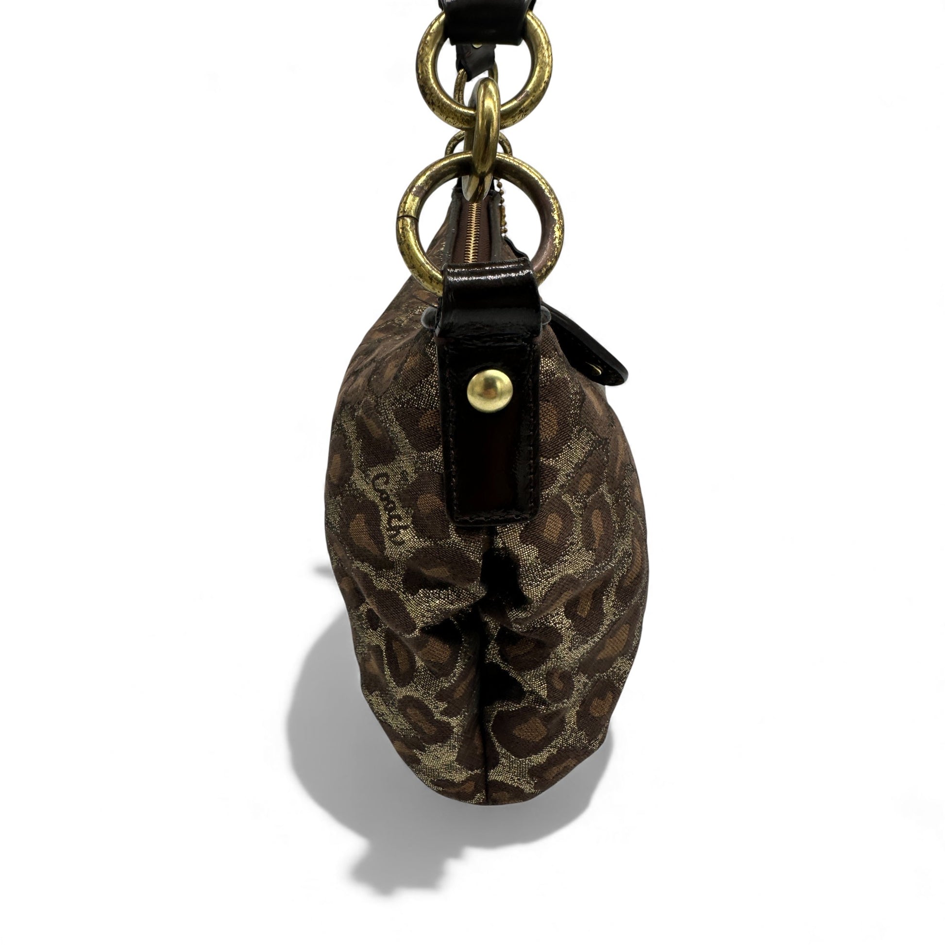Vintage Coach F15521 Leopard Print Shoulder Bag. A rare Y2K Coach bag from 2007, in leopard print, trimmed with brown patent leather and brass hardware. Original longer detachable strap is not included.