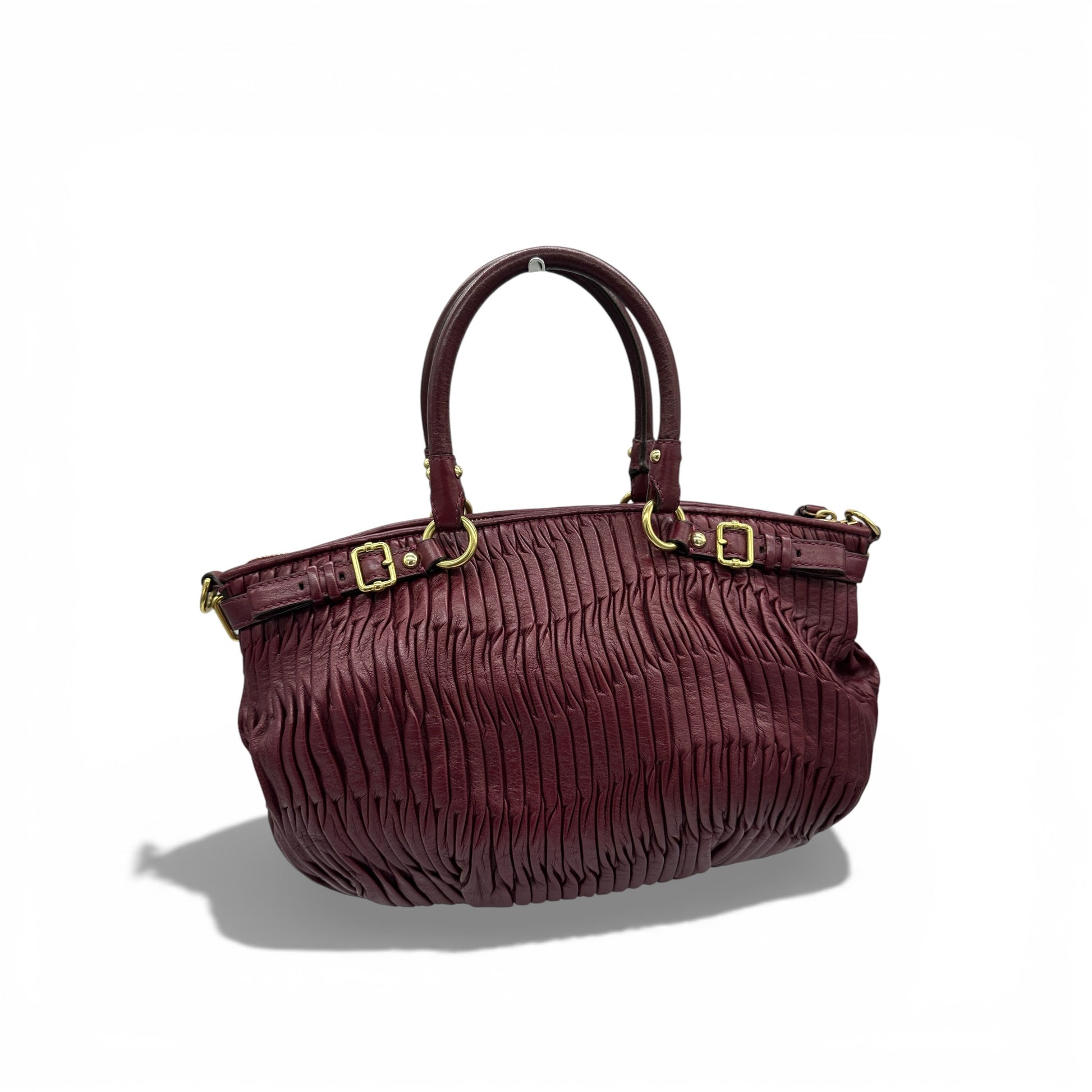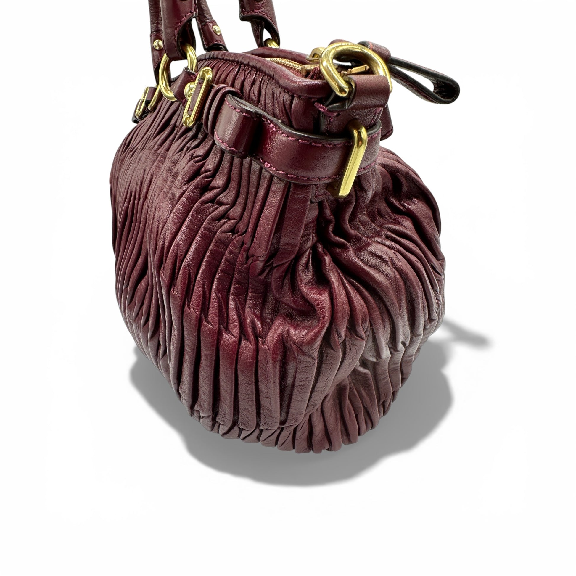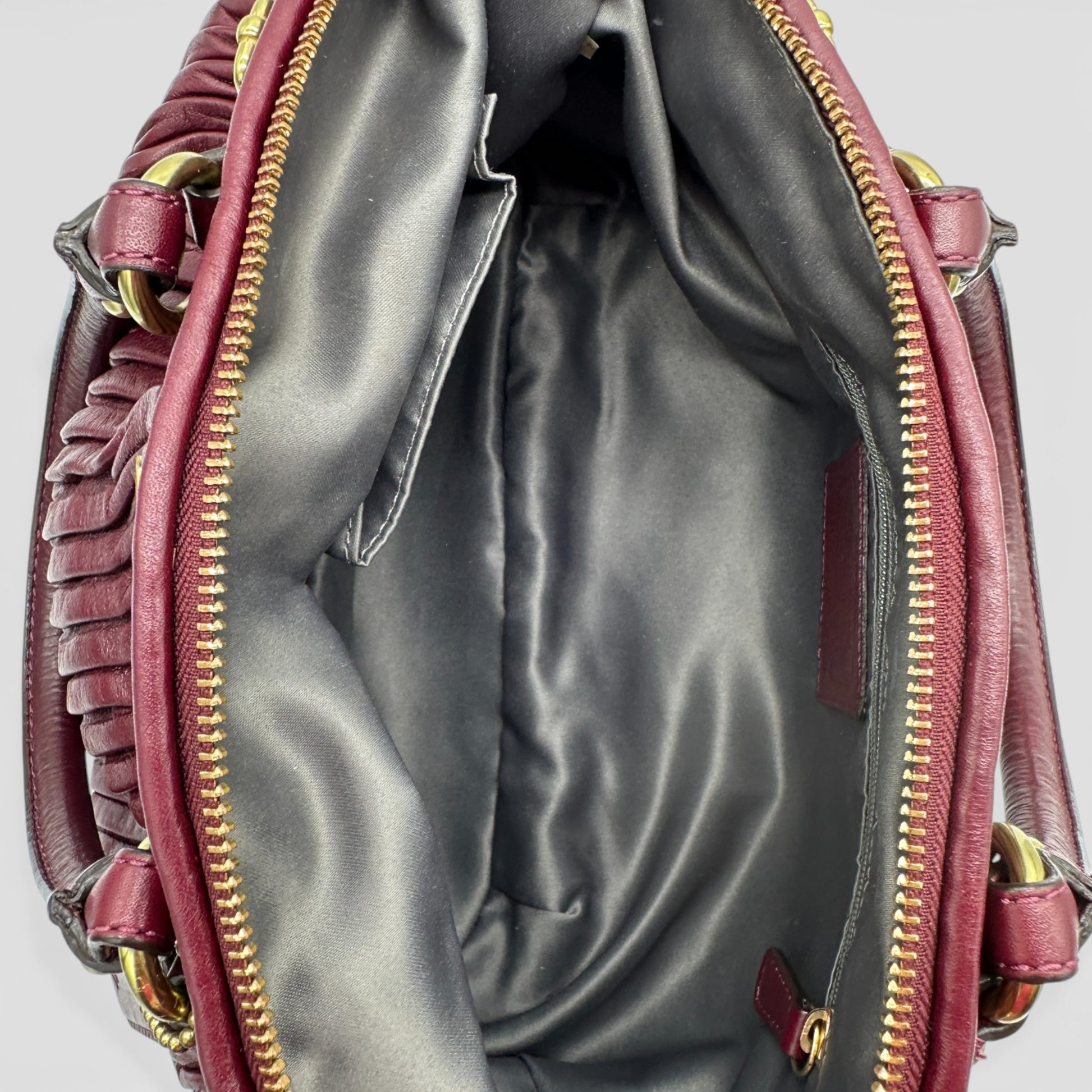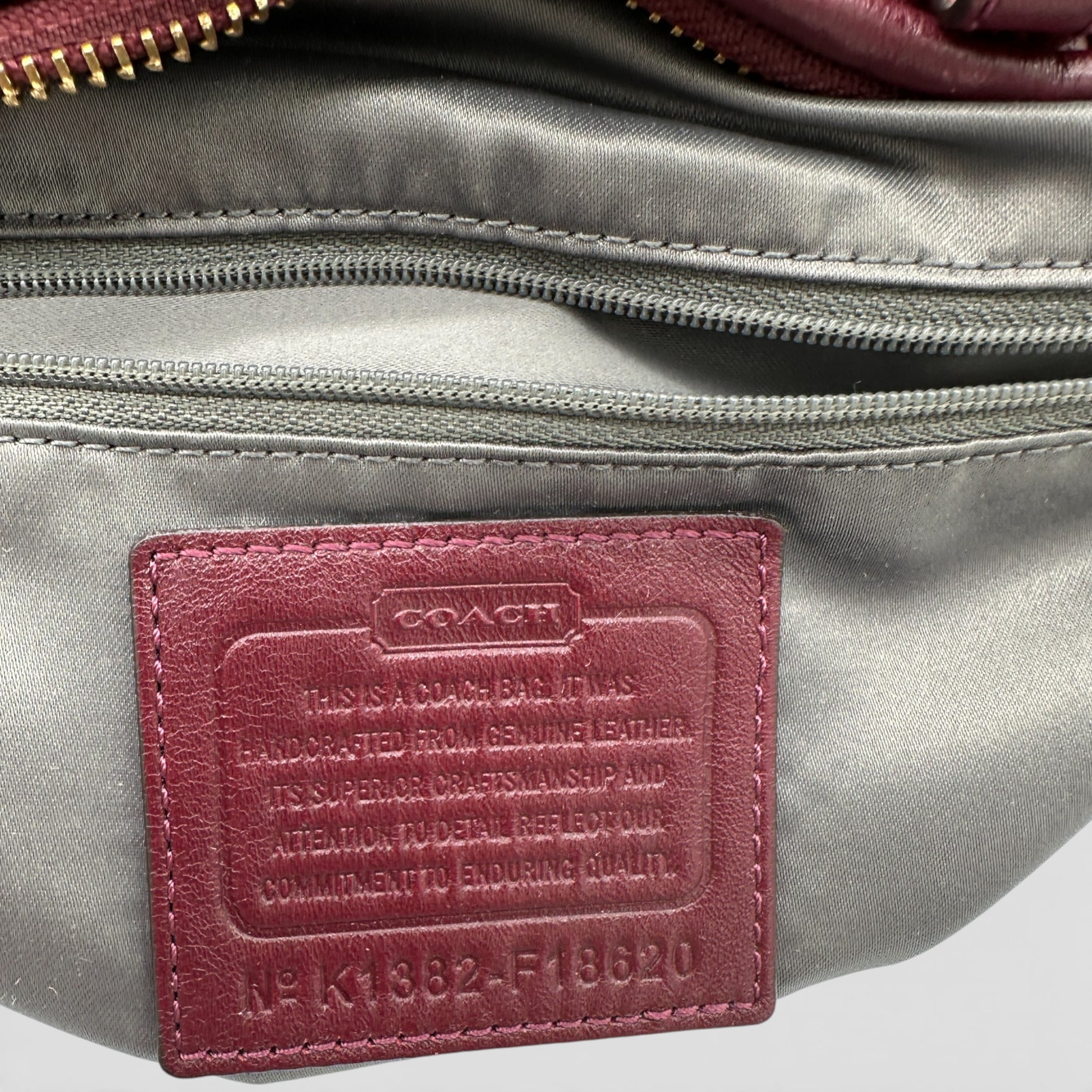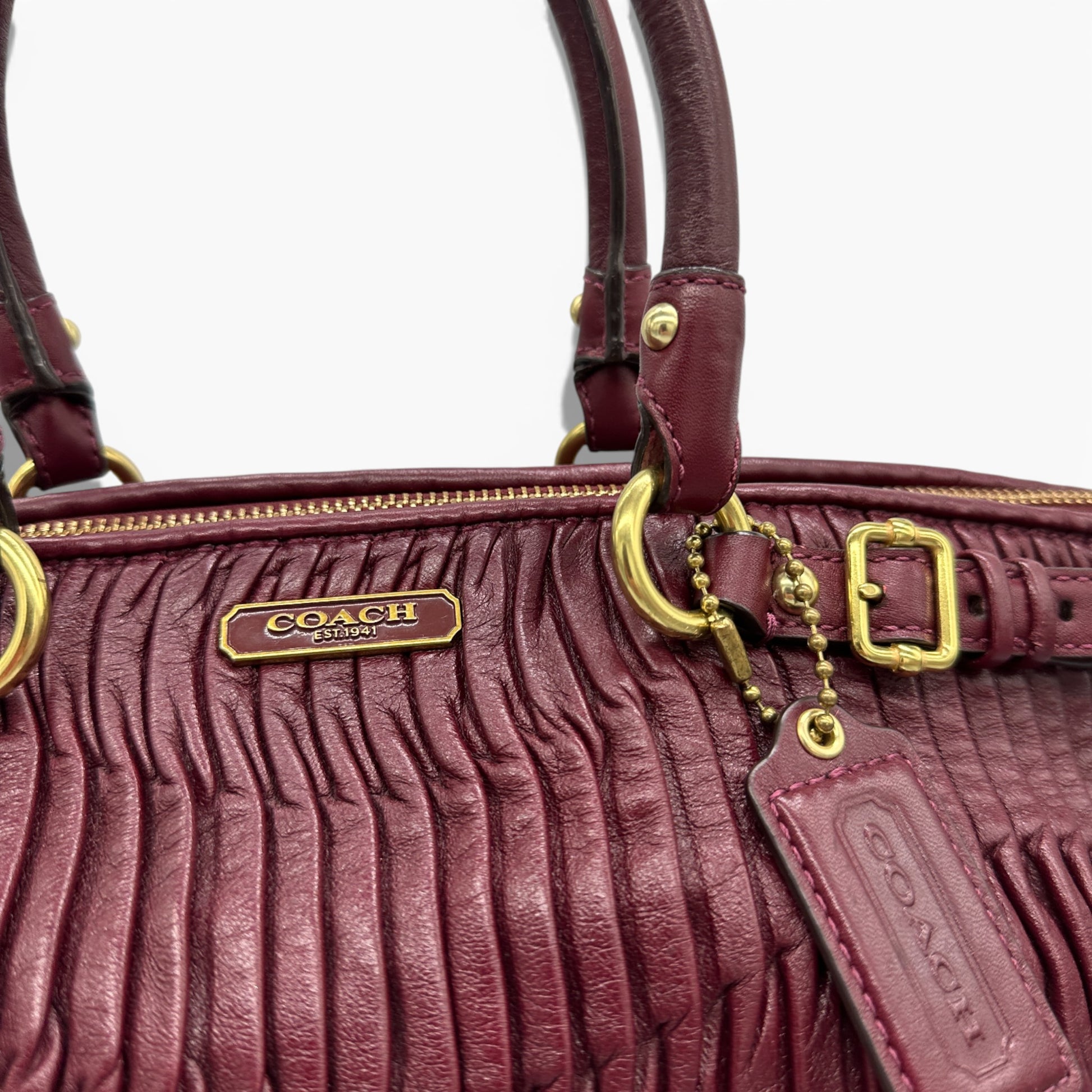Vintage Coach F18620 Madison Handbag, in gathered burgundy leather, with gold toned hardware. Made in 2013.