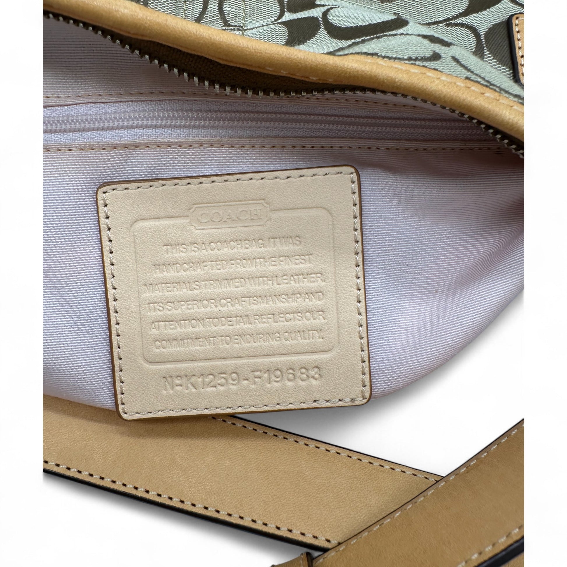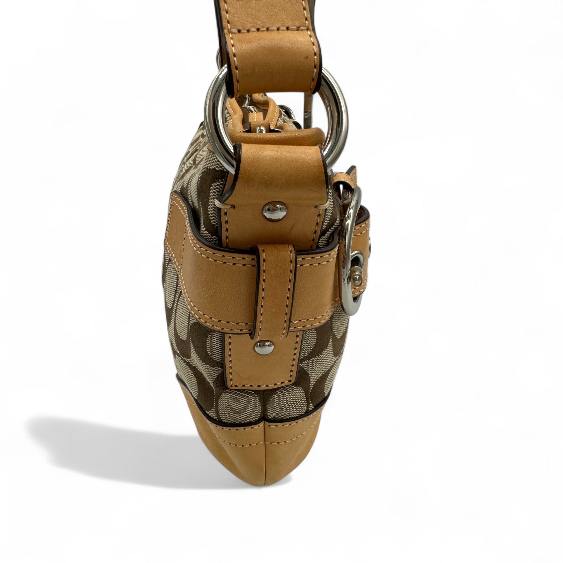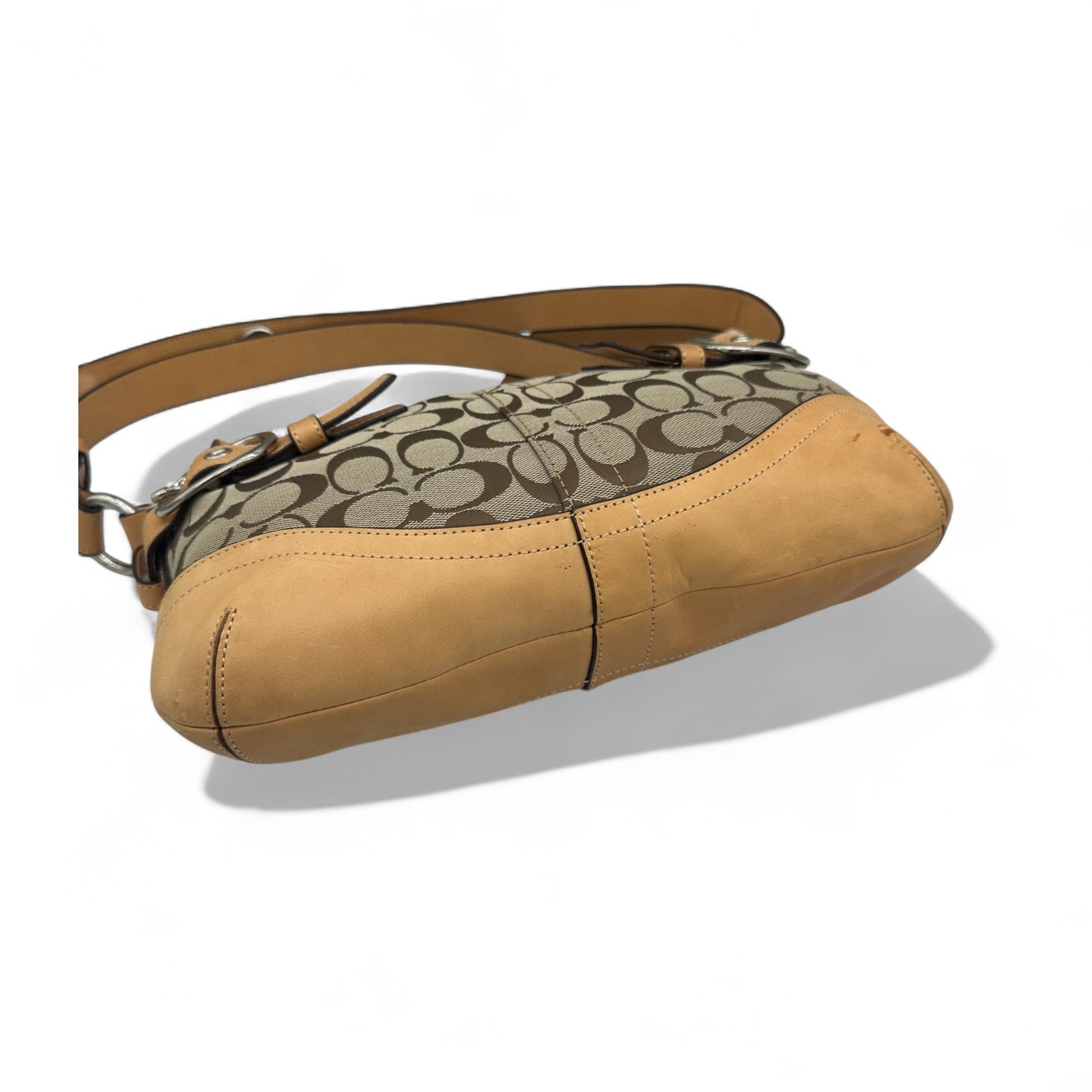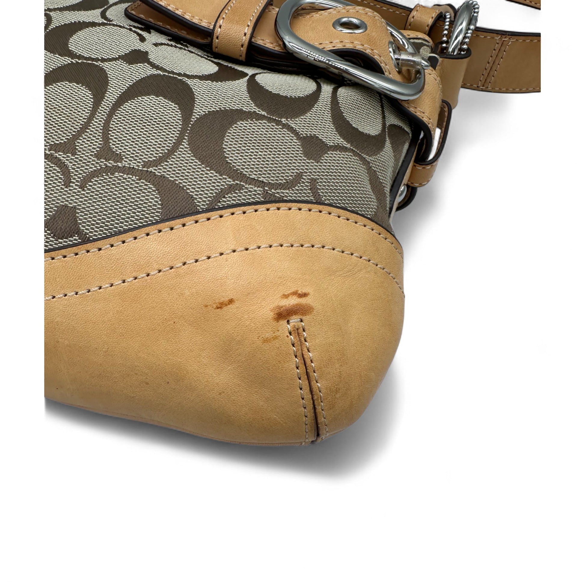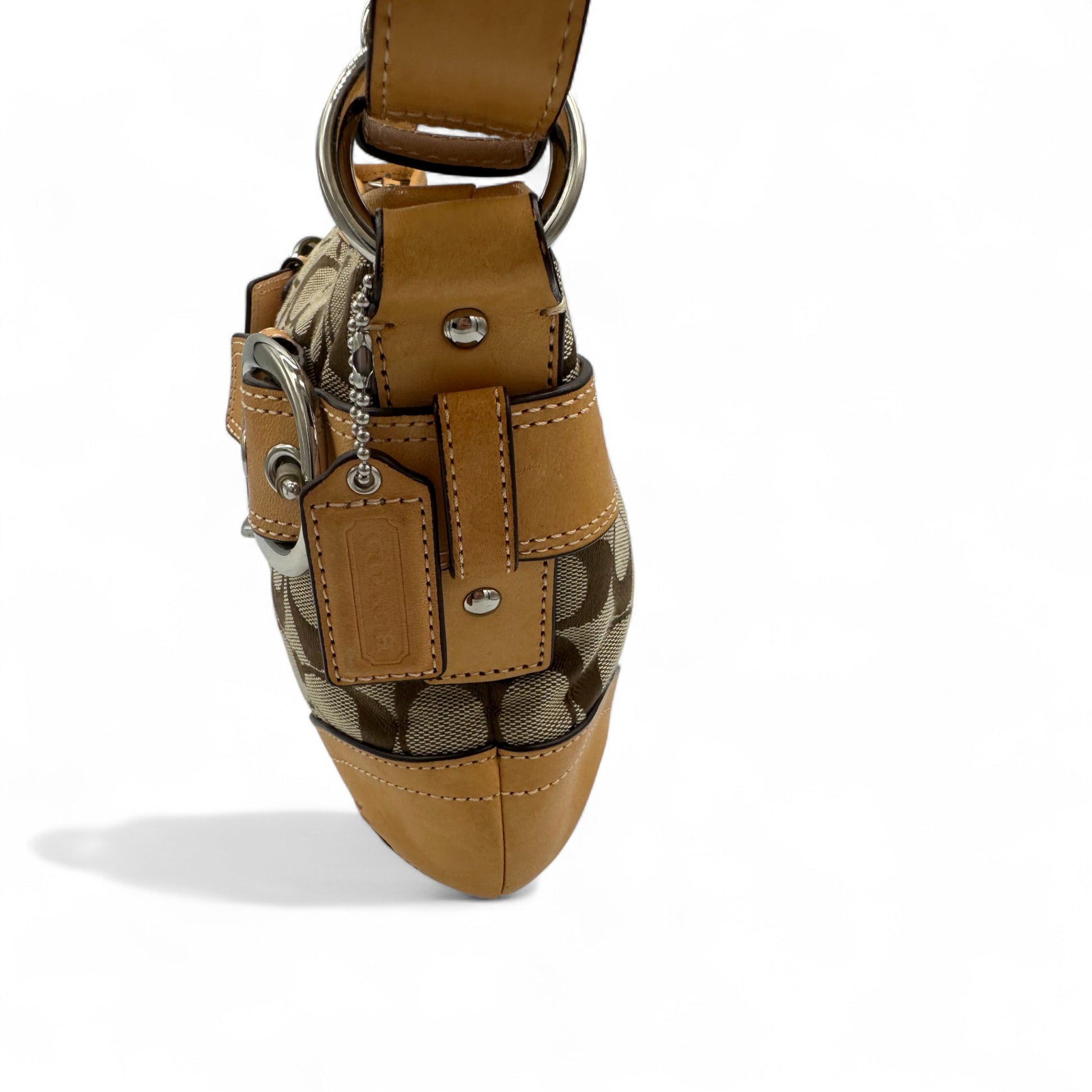 Model and style: Vintage Coach F19683 Double Buckle Shoulder Bag in signature monogram with tan leather trim and silver hardware.