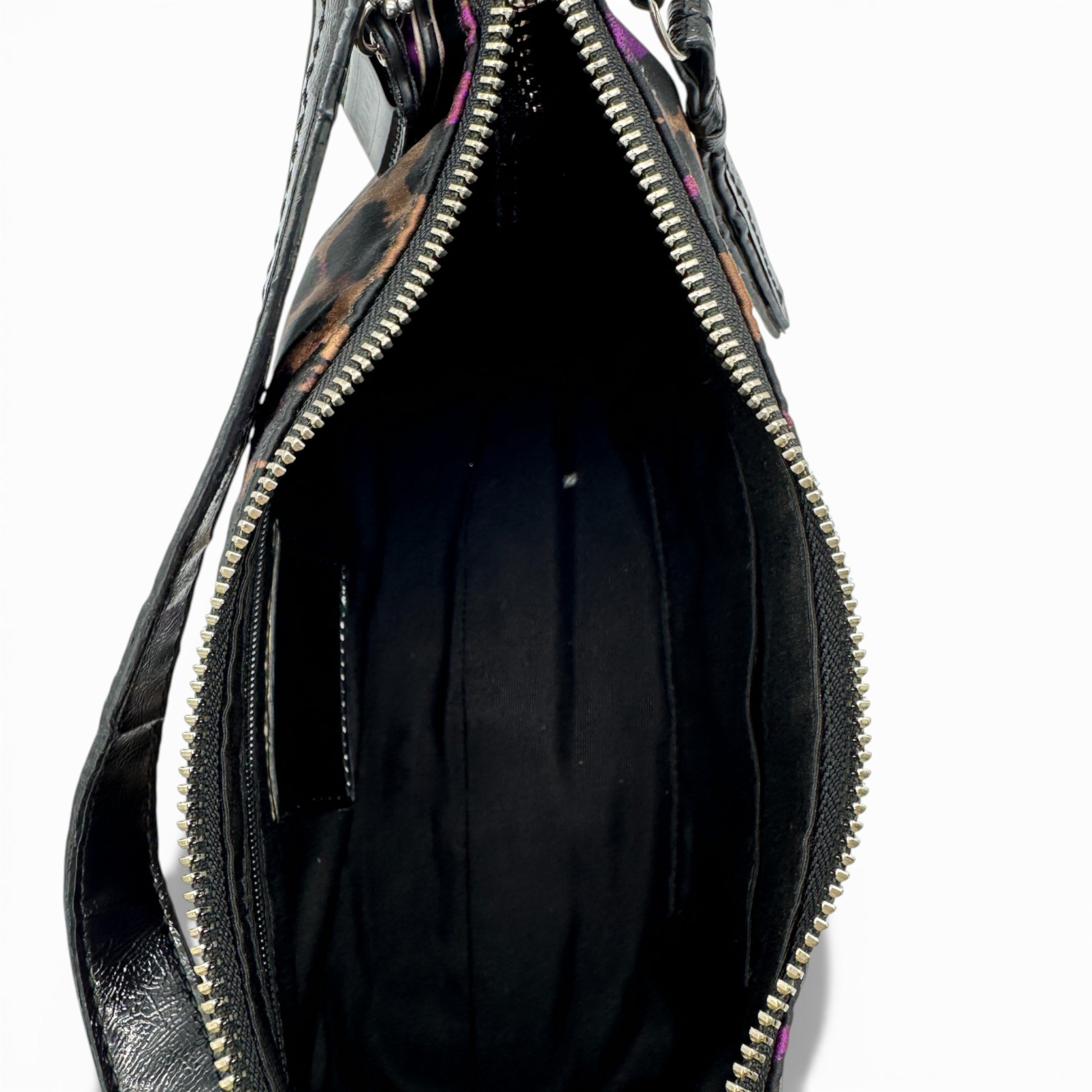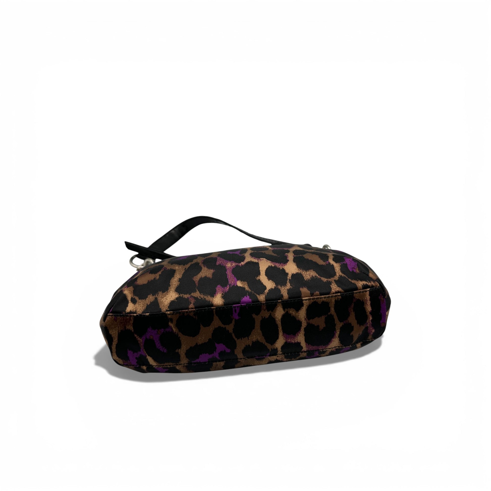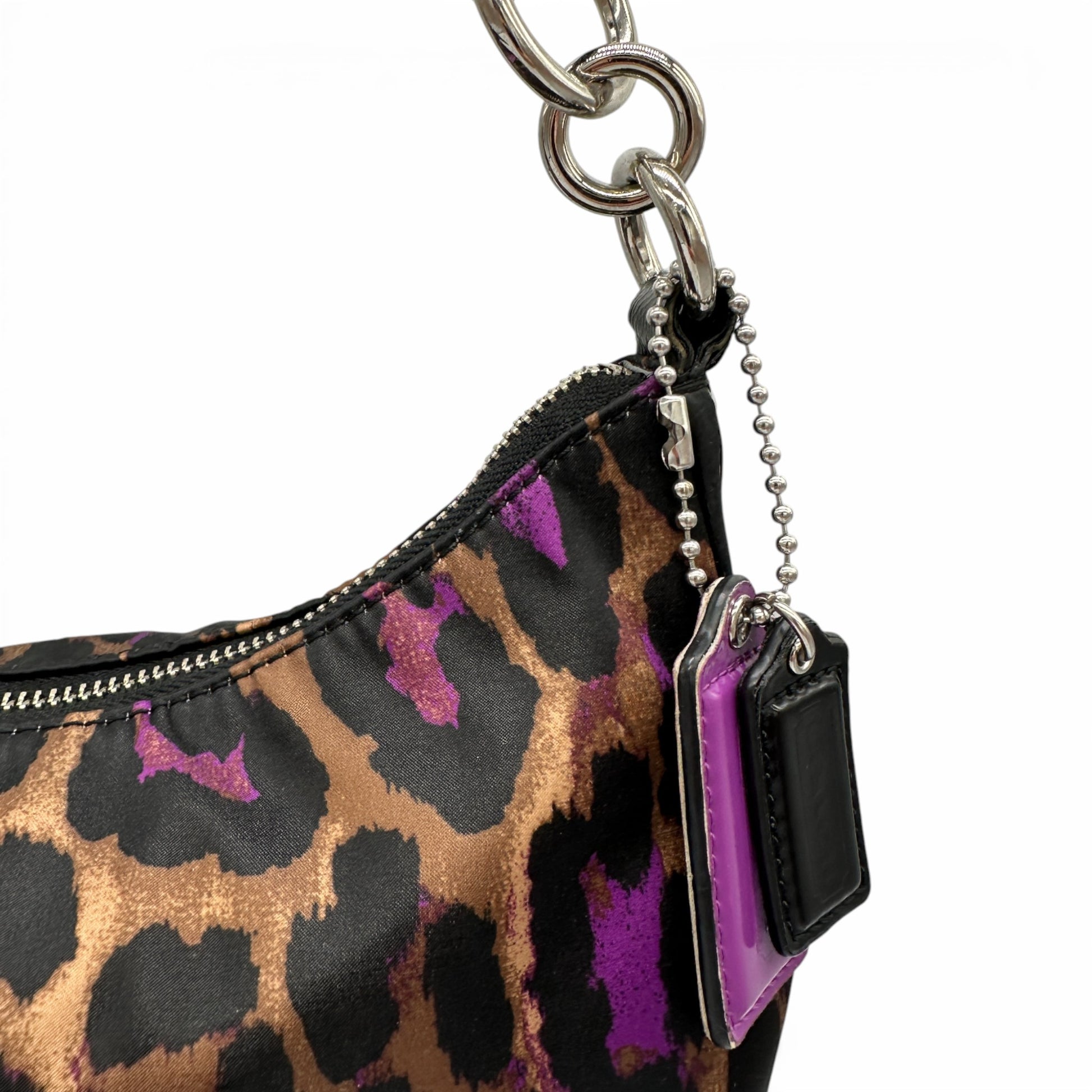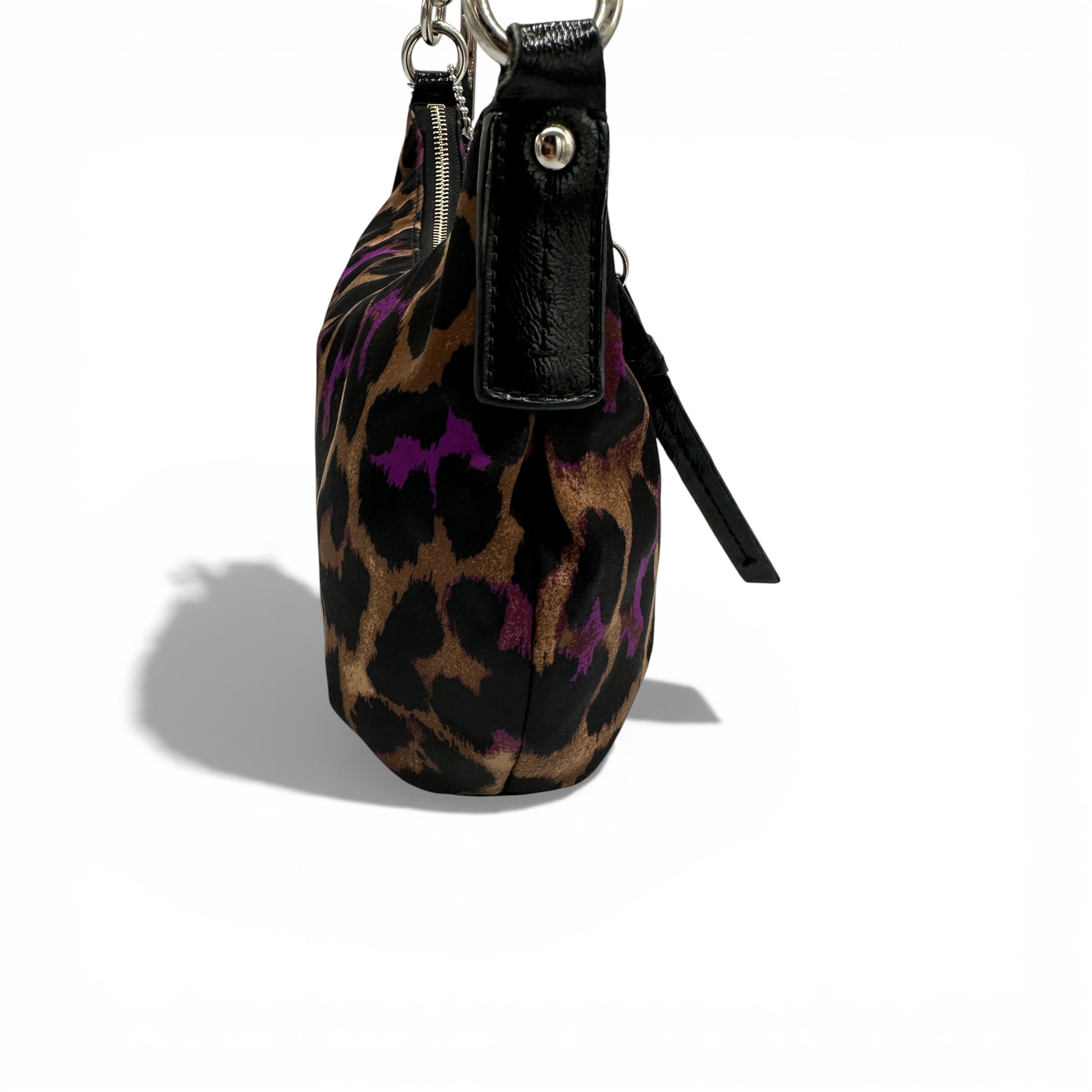 Vintage Coach F26032 Leopard Print Shoulder Bag A rare Coach bag from 2013, in black, purple and gold leopard print satin, trimmed with black patent leather and brass hardware.