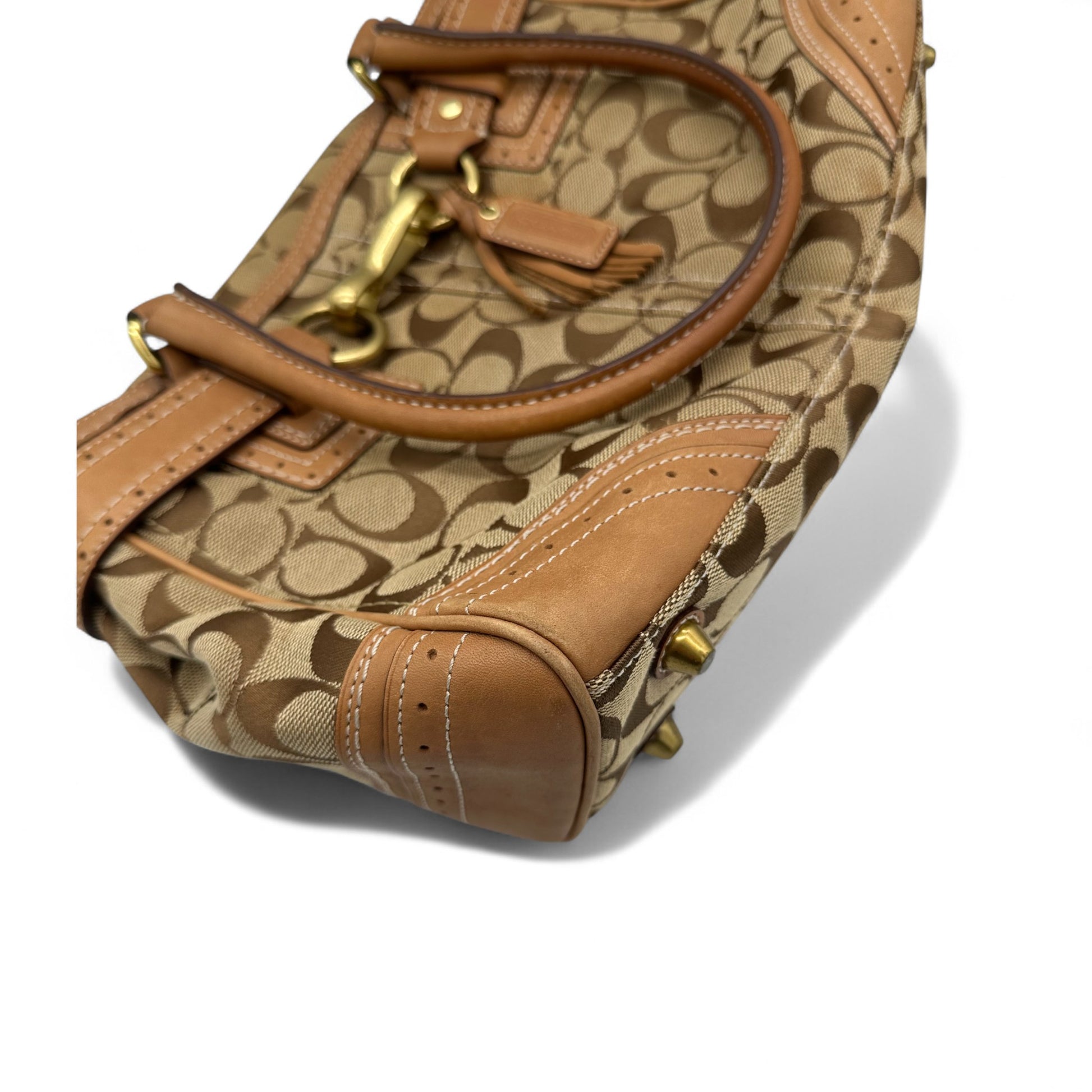 Model and style: Vintage Coach Hamptons 10577 Handbag. In brown and beige signature monogram, trimmed with brown leather. With brass horsebit clip hardware and leather tassel accent. Can be worn as a handbag or comfortably on the shoulder.