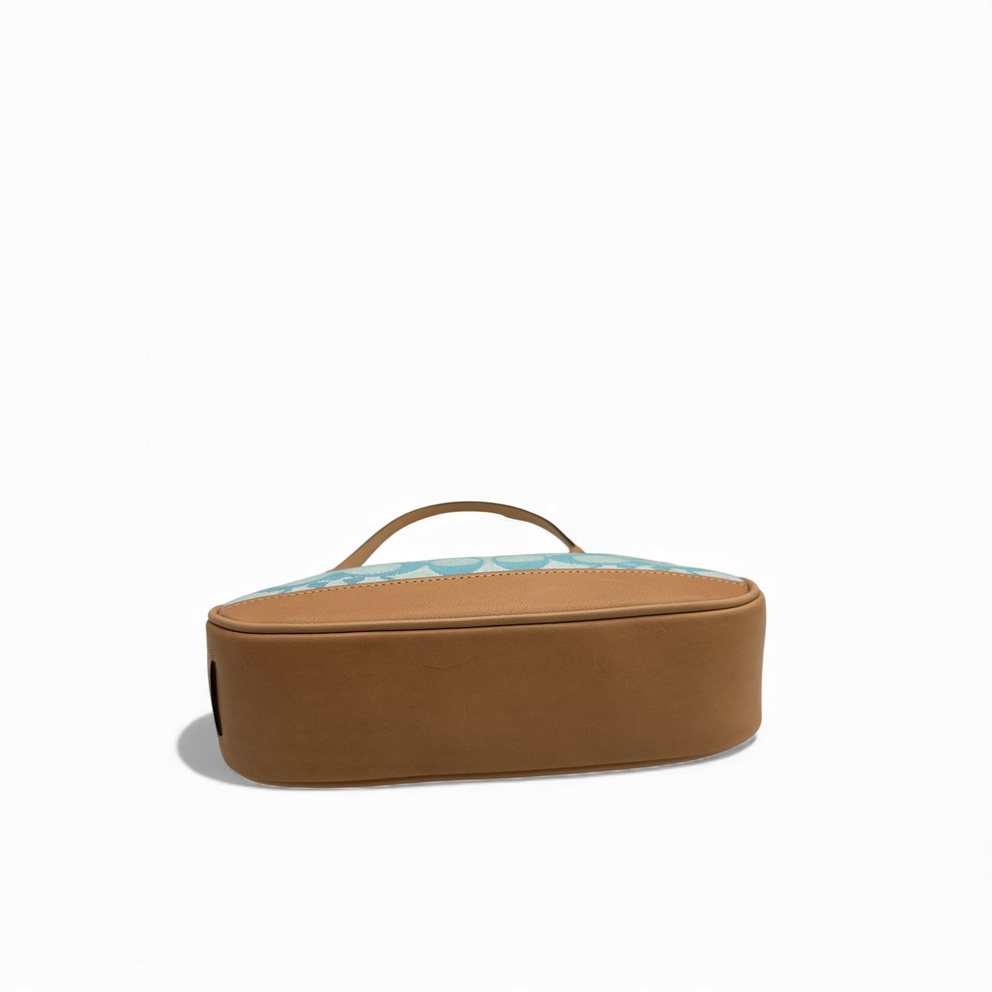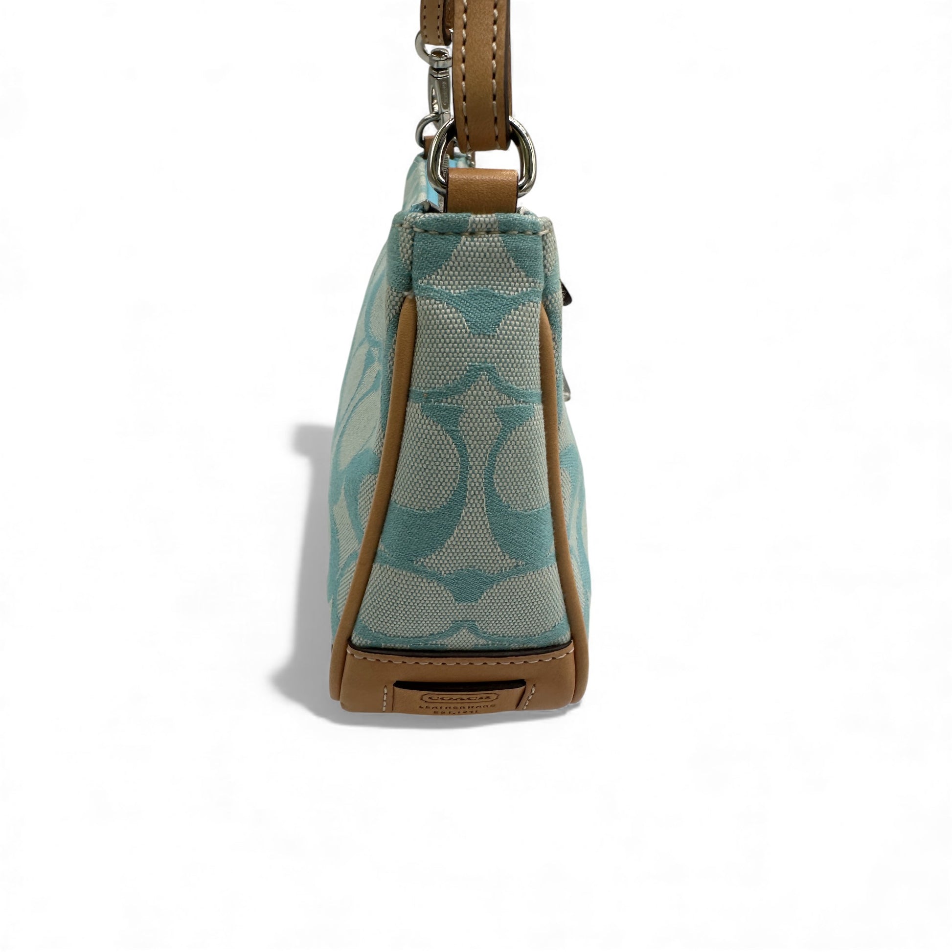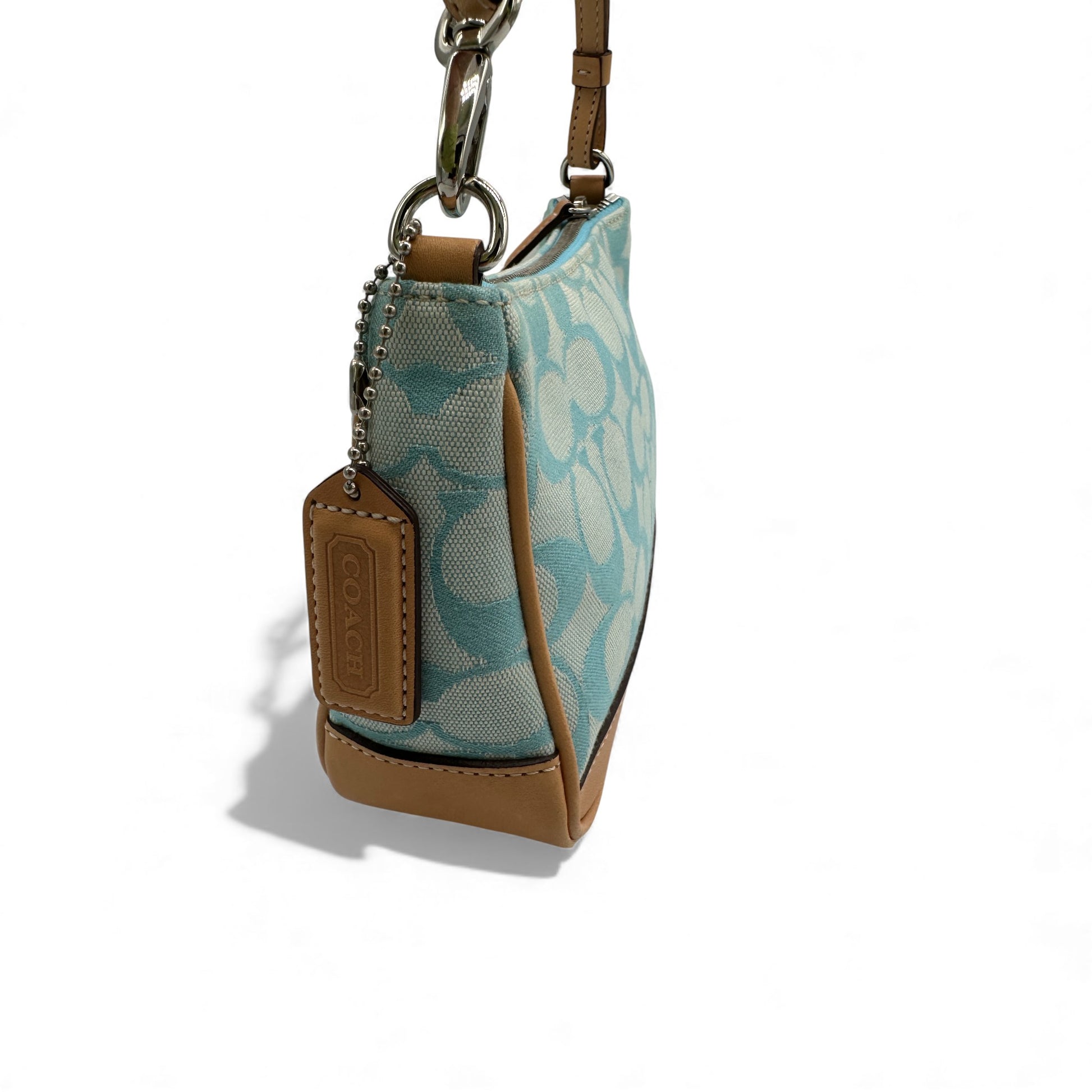 Vintage Coach Rare 6094 Demi Shoulder bag, in blue signature monogram, trimmed with tan leather. A Y2K piece from 2002.