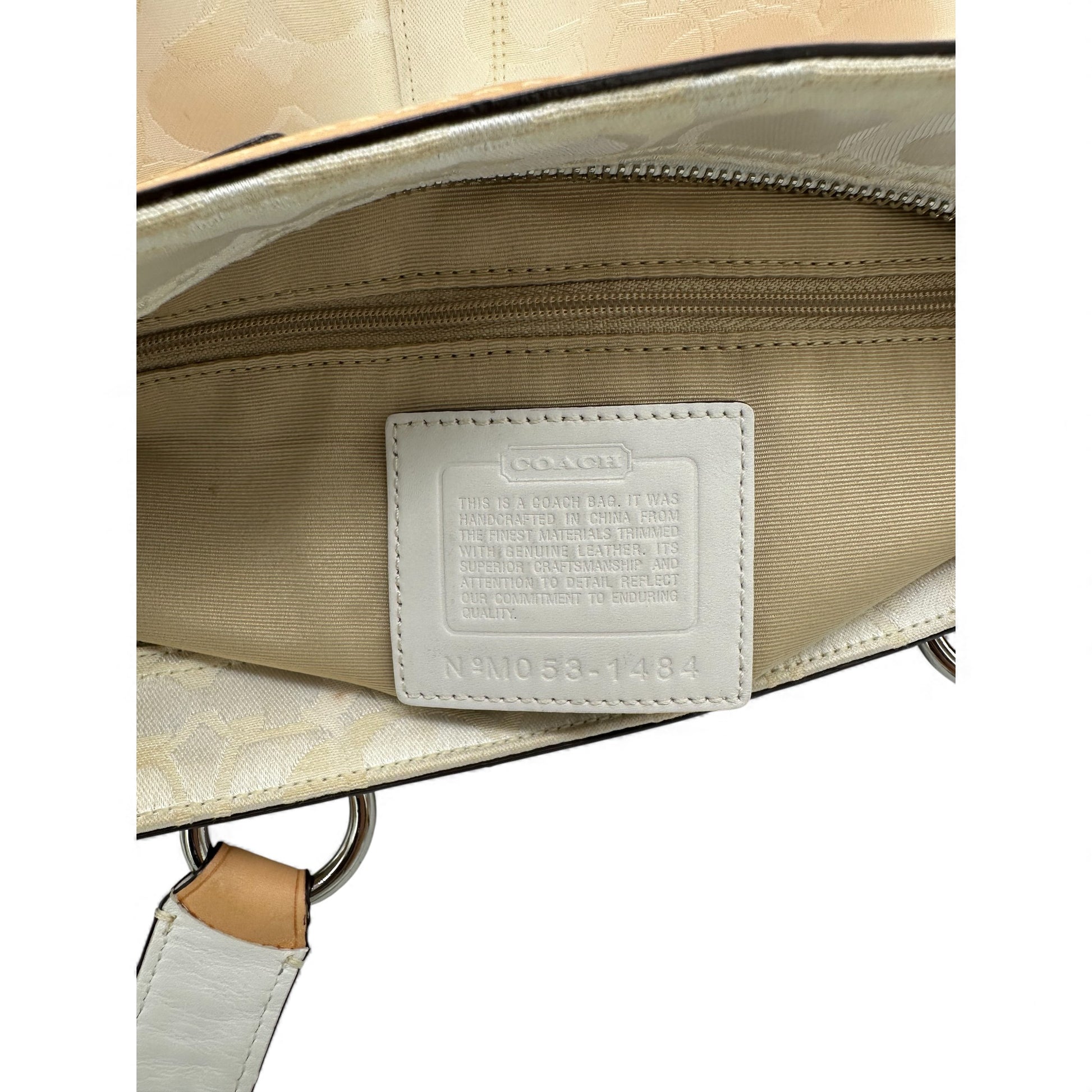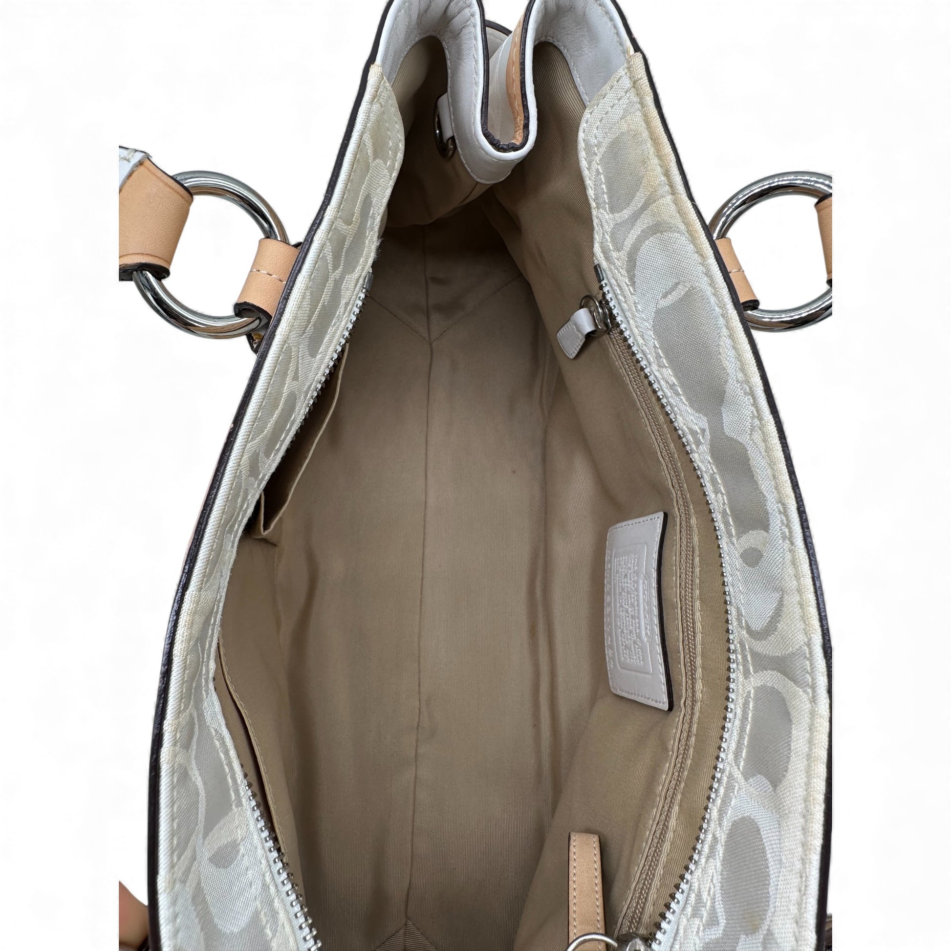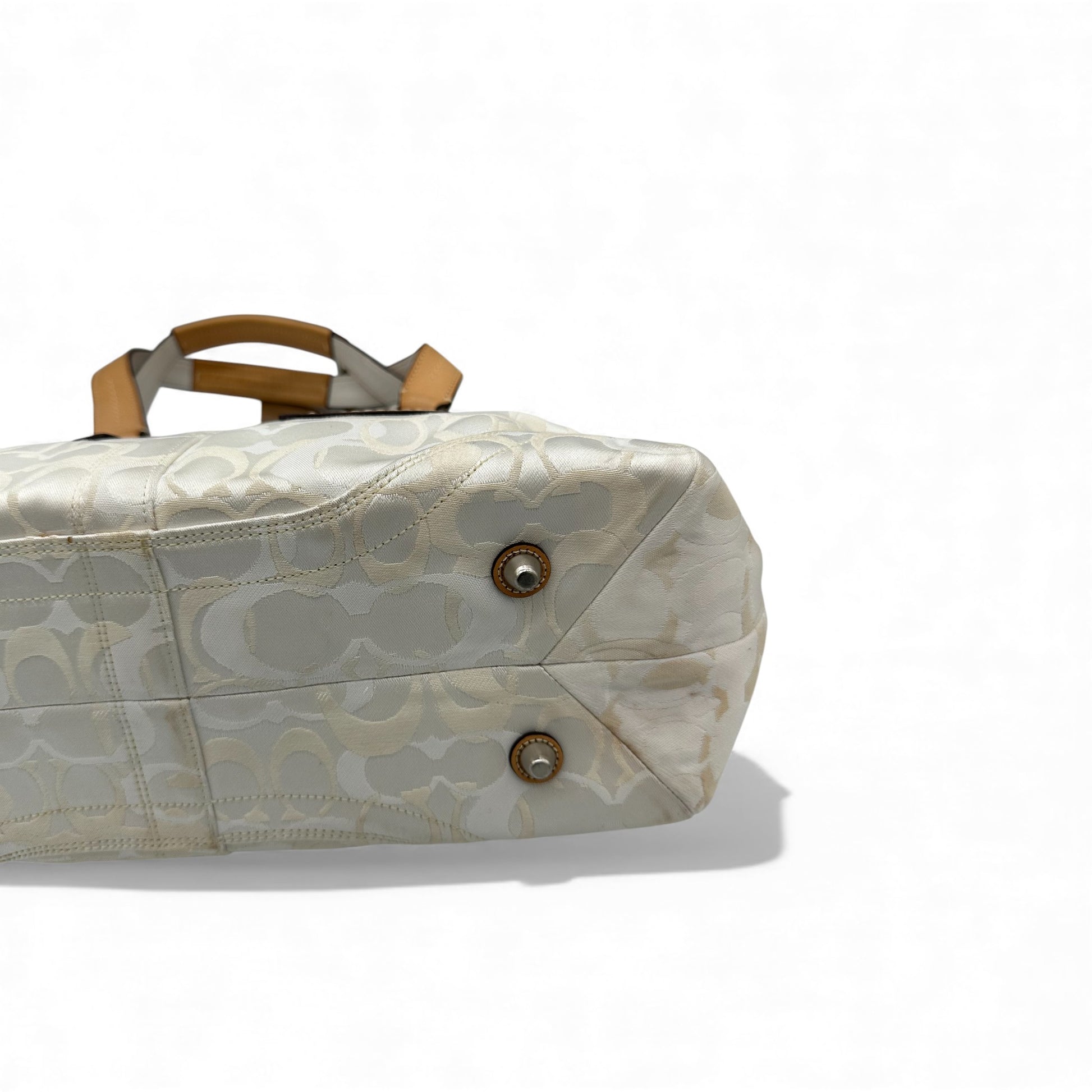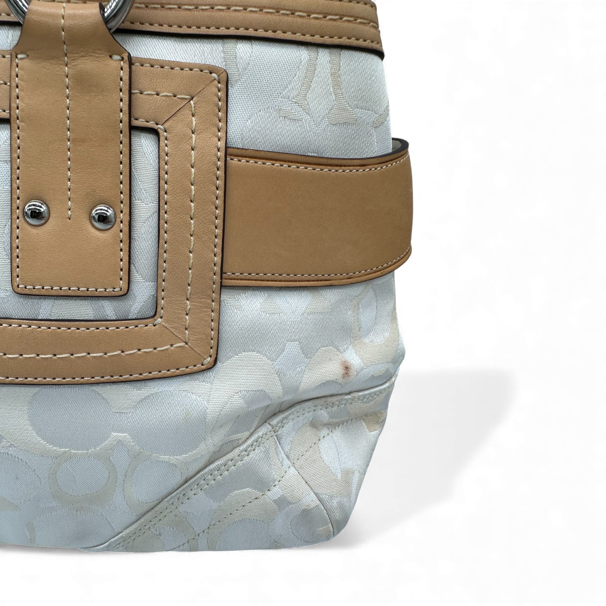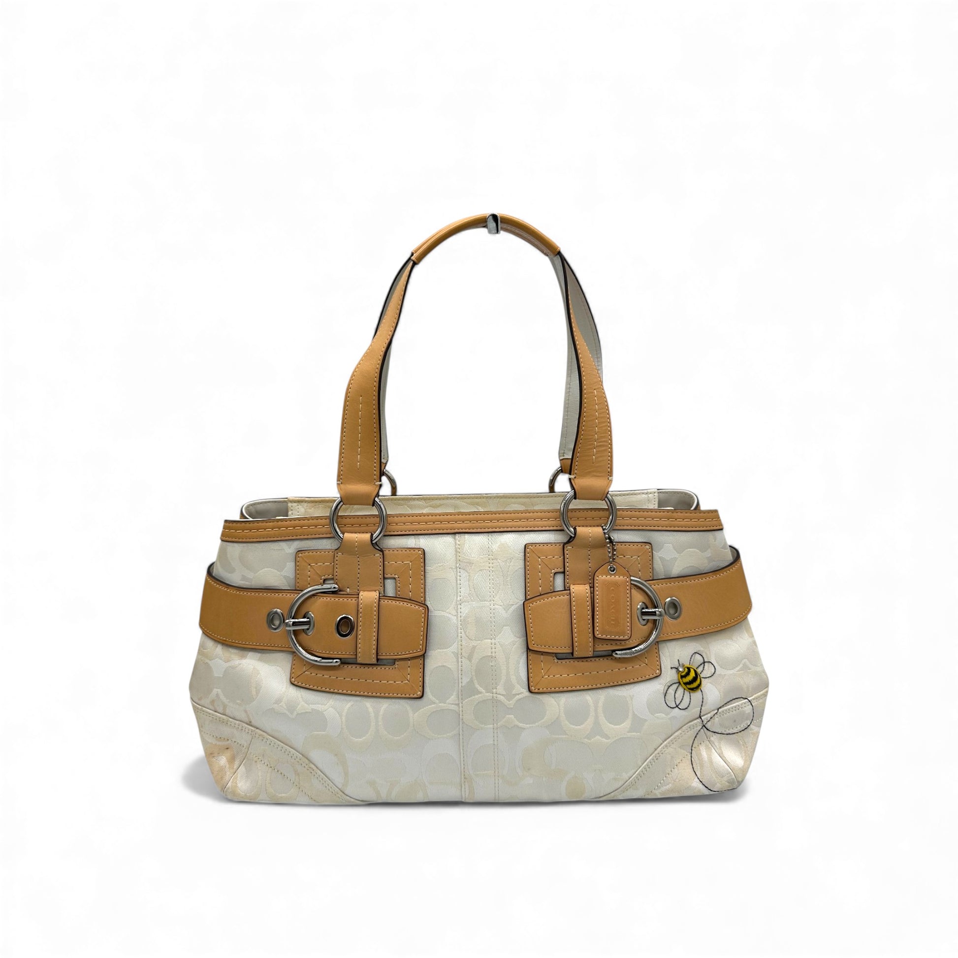 Model and style: Vintage Coach Soho 1484 Shoulder Bag. This large tote bag comes in white and cream signature monogram, with tan braided leather trim and silver Soho buckle hardware, a rare sought after style from the limited edition Bumble Bee collection. A Y2K piece from 2005.