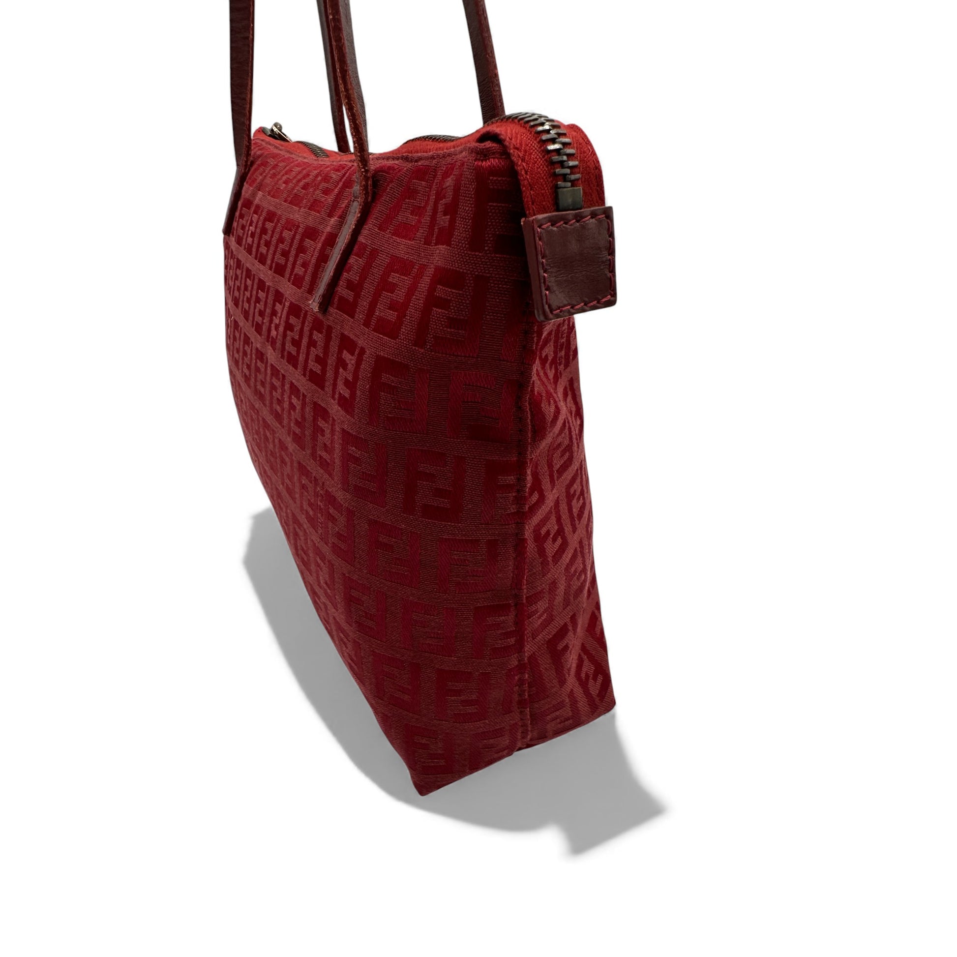 Vintage Fendi Zucchino Tote style Shoulder Bag. In red FF Zucchino monogram canvas with silver chrome hardware. Trimmed with red leather shoulder strap.
