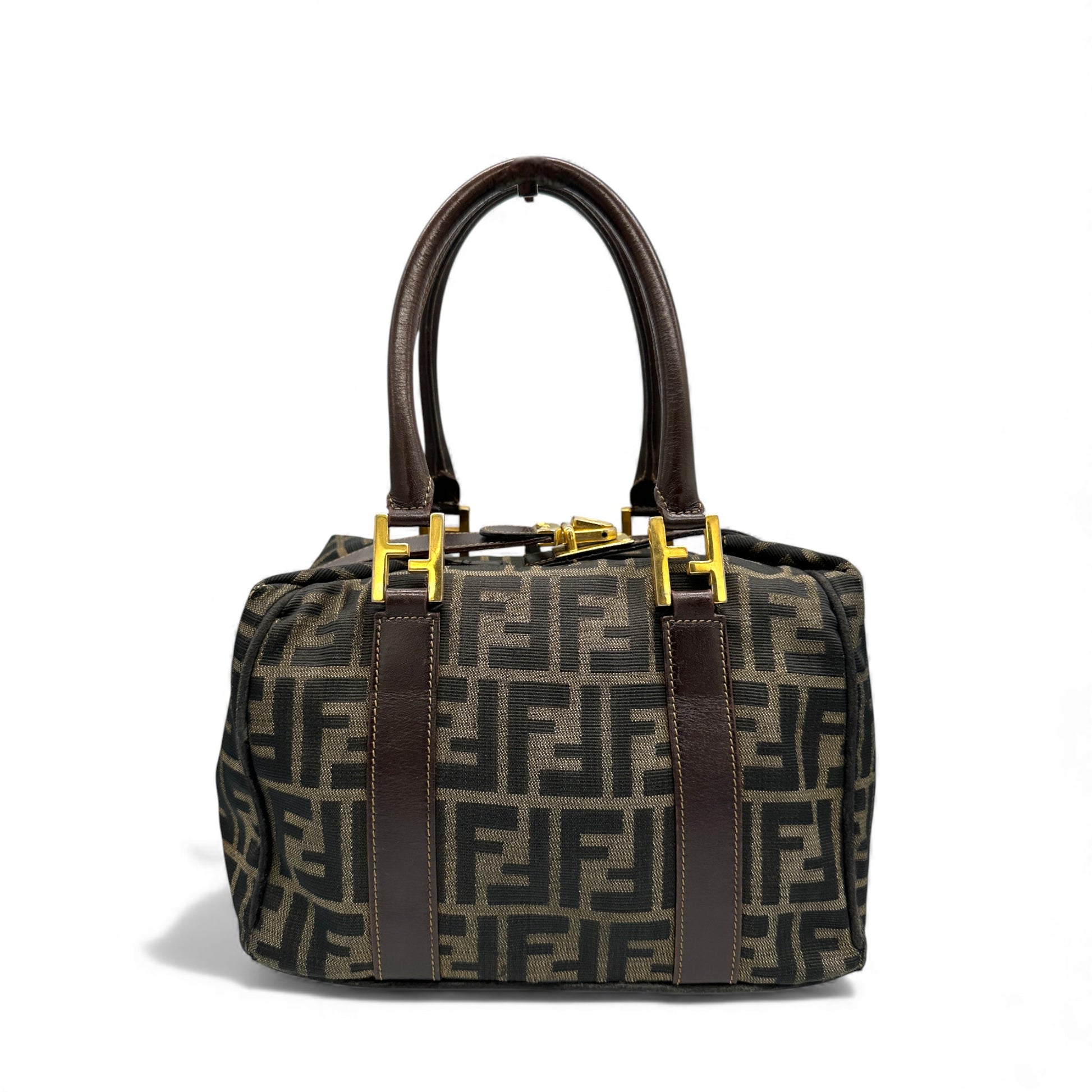 Vintage Fendi Zucca Canvas Mini Boston Bag. In brown Zucca FF monogram, with zip and button fasten closure. Trimmed with dark brown rolled double top handles and gold-tone hardware.