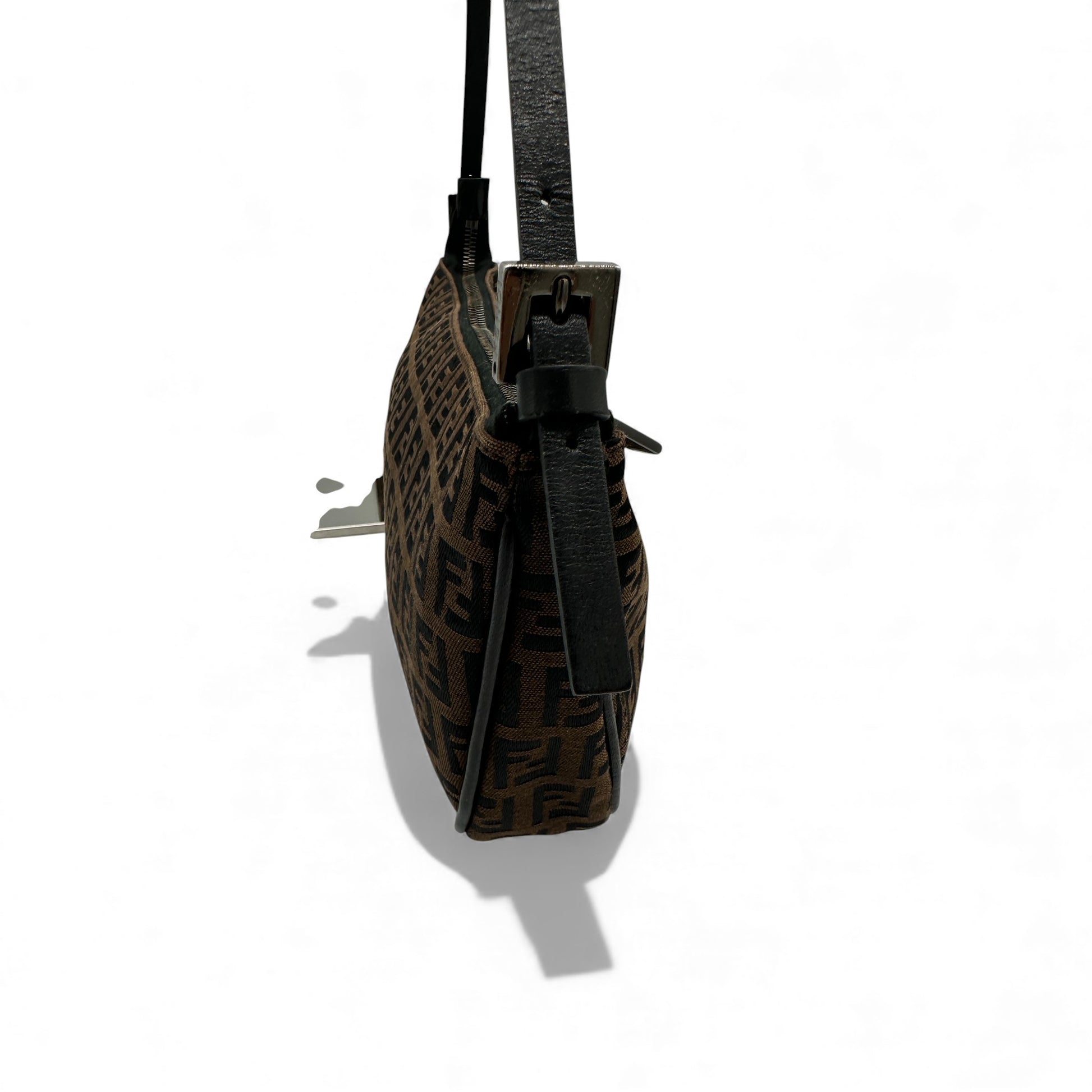 Vintage Fendi Zucchino Baguette Shoulder Bag. In brown and black Zucchino monogram with zip closure, with silver-tone chrome Fendi hardware detailing. Trimmed with brown leather adjustable strap, this Fendi bag fits perfectly on the shoulder.