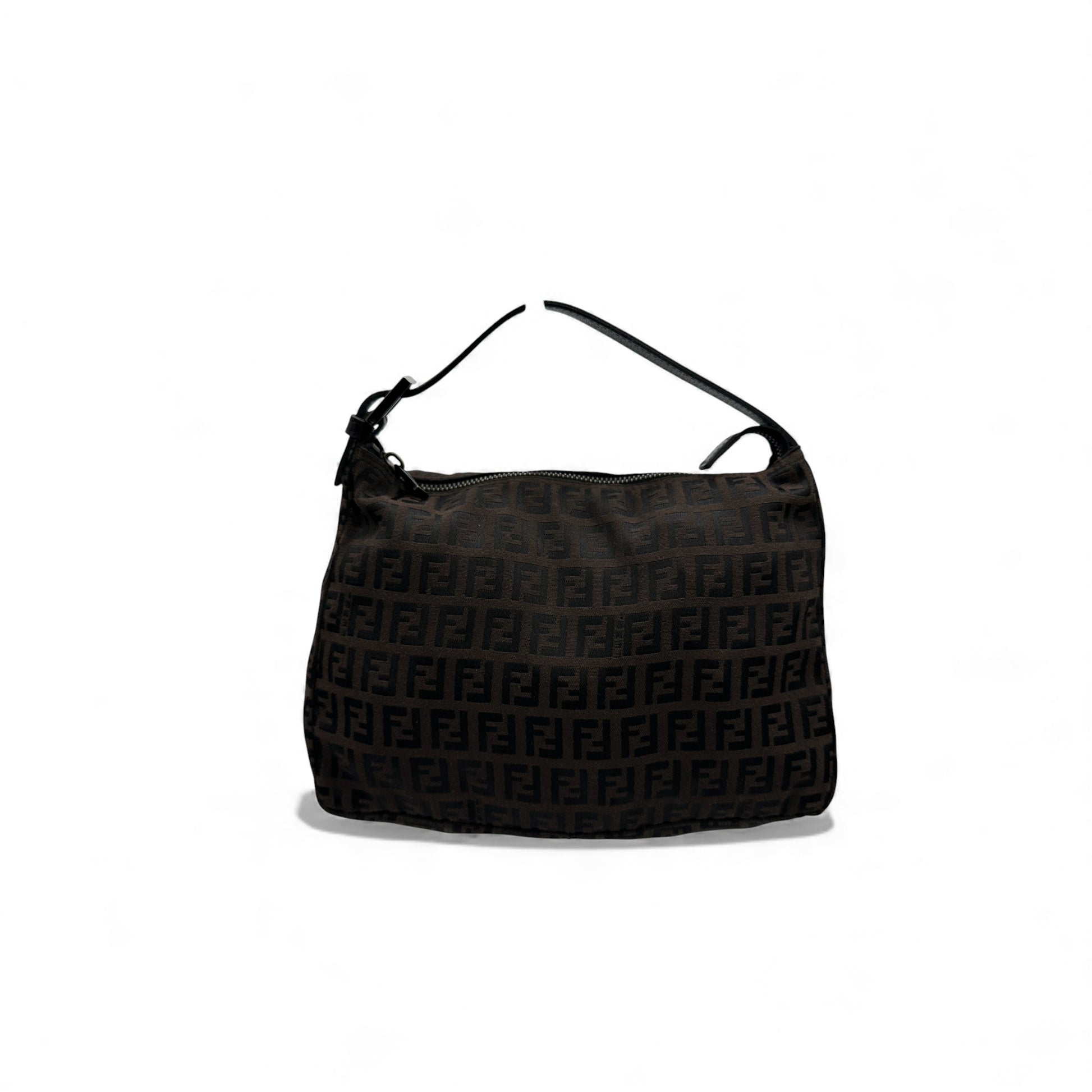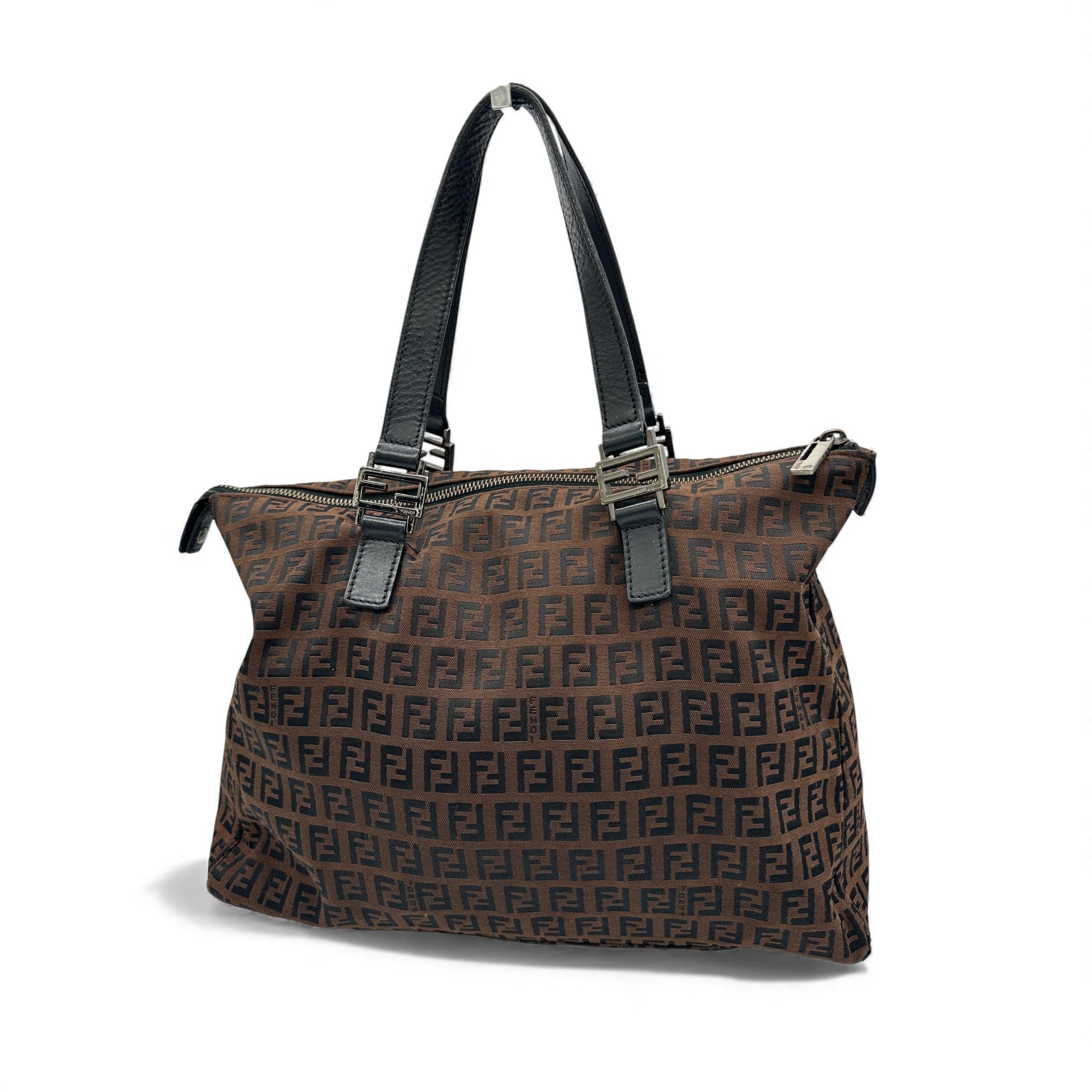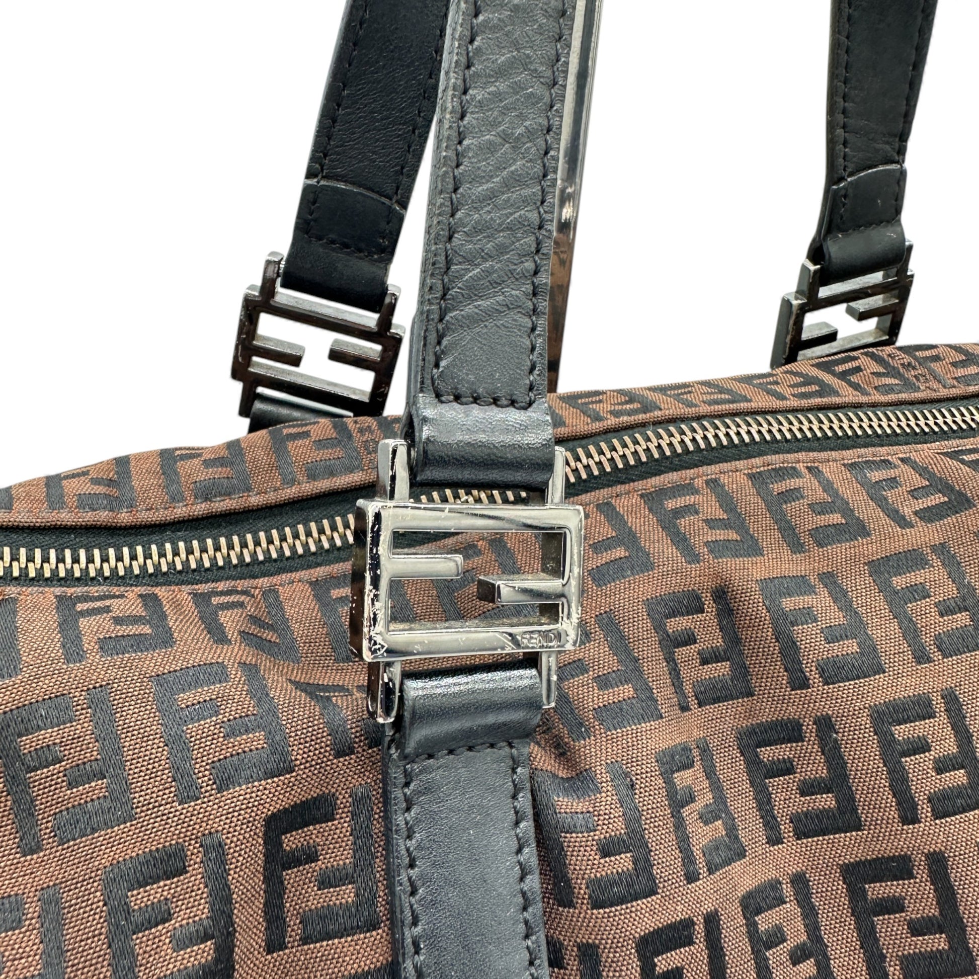 Vintage Fendi Zucchino Canvas Tote Handbag. In brown and black Fendi Zucchino monogram, trimmed with black leather and silver Fendi hardware detailing.