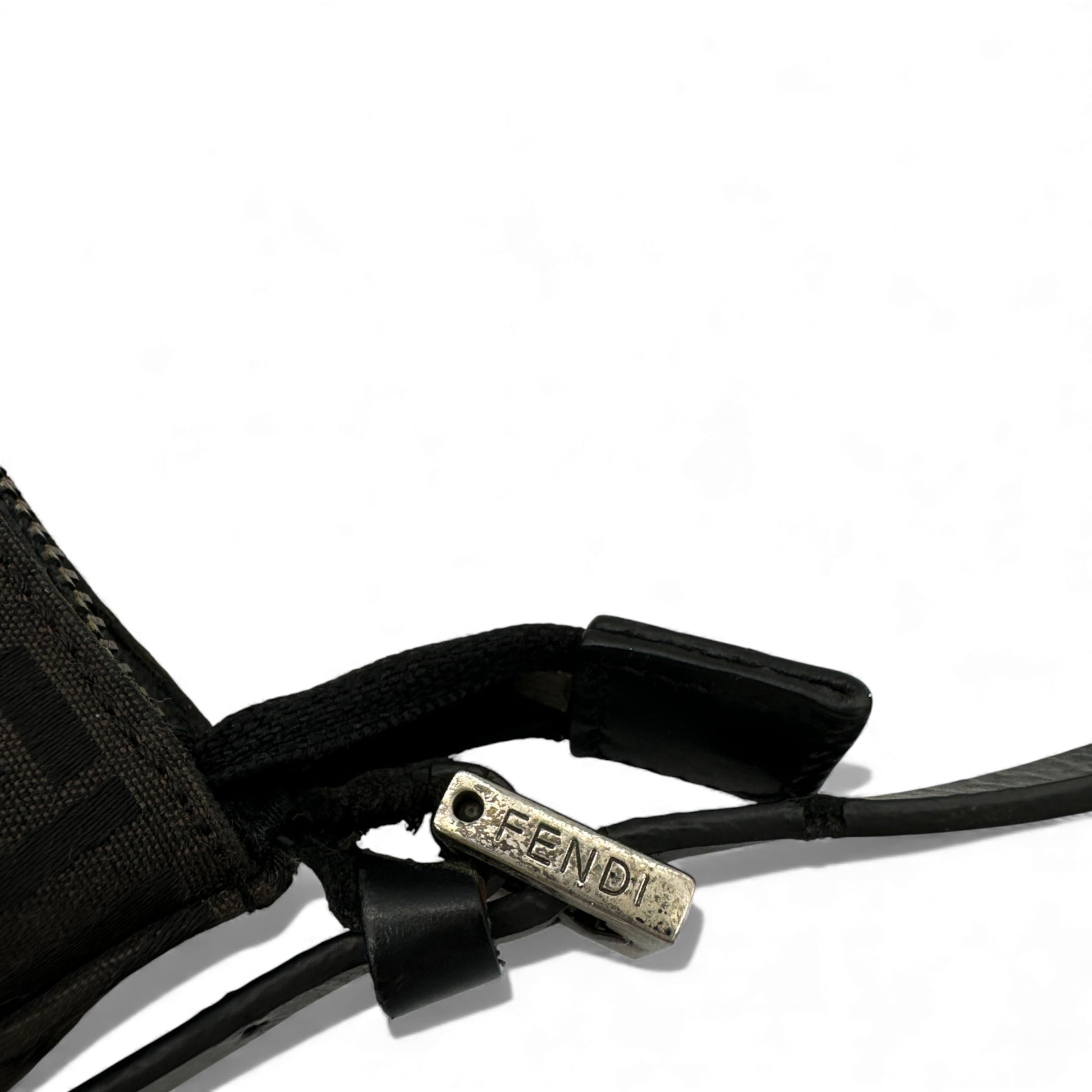 Vintage Fendi Baguette Zucchino pochette Shoulder Bag. In brown and black Zucchino monogram with zip closure, with silver Fendi buckle detailing. Trimmed with brown leather adjustable strap, this Fendi bag fits perfectly on the shoulder.