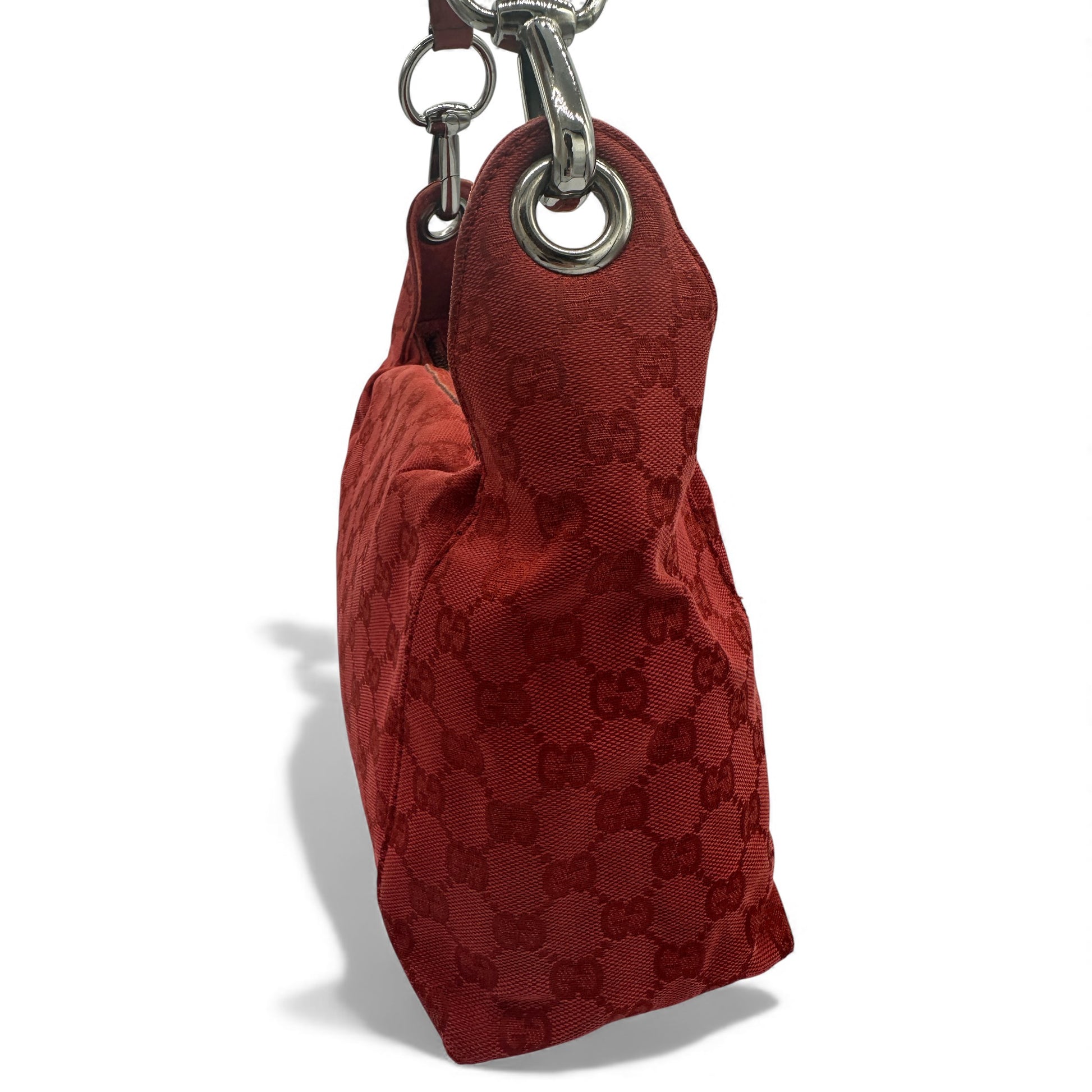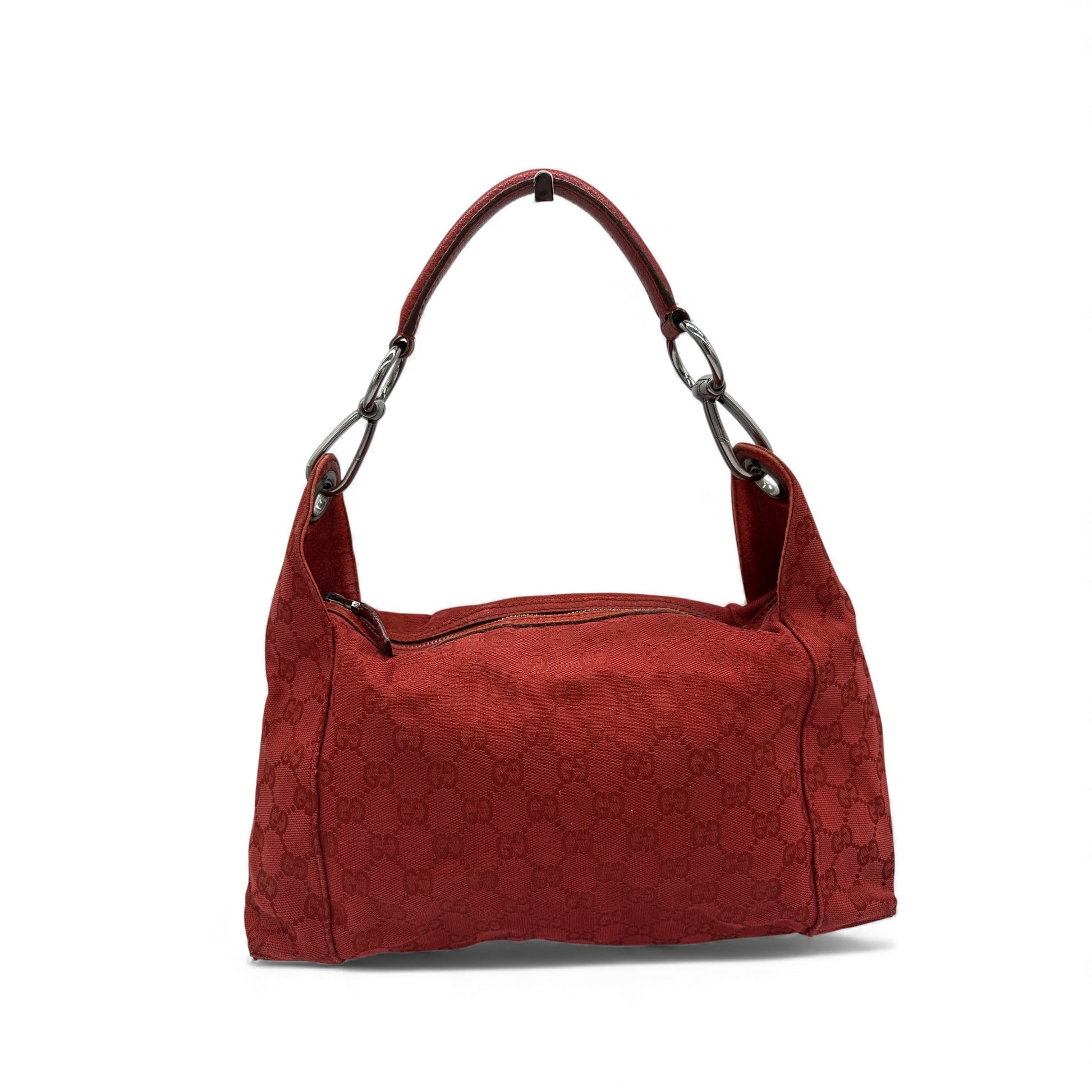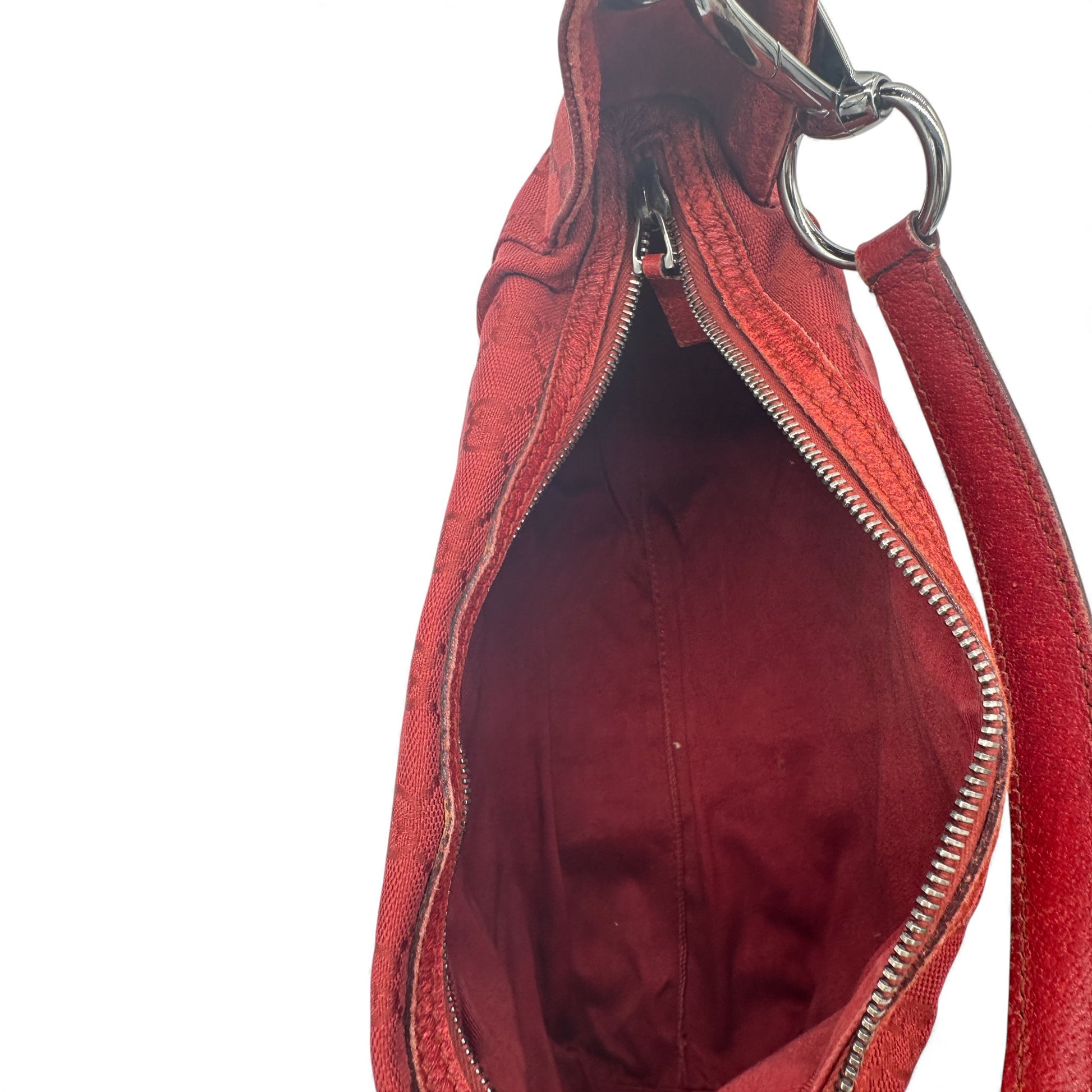 Vintage Gucci 113023 GG Canvas Shoulder Hobo Bag in Burgundy red GG monogram with silver hardware & zip closure. The leather strap can be used either as a handbag or shoulder bag.