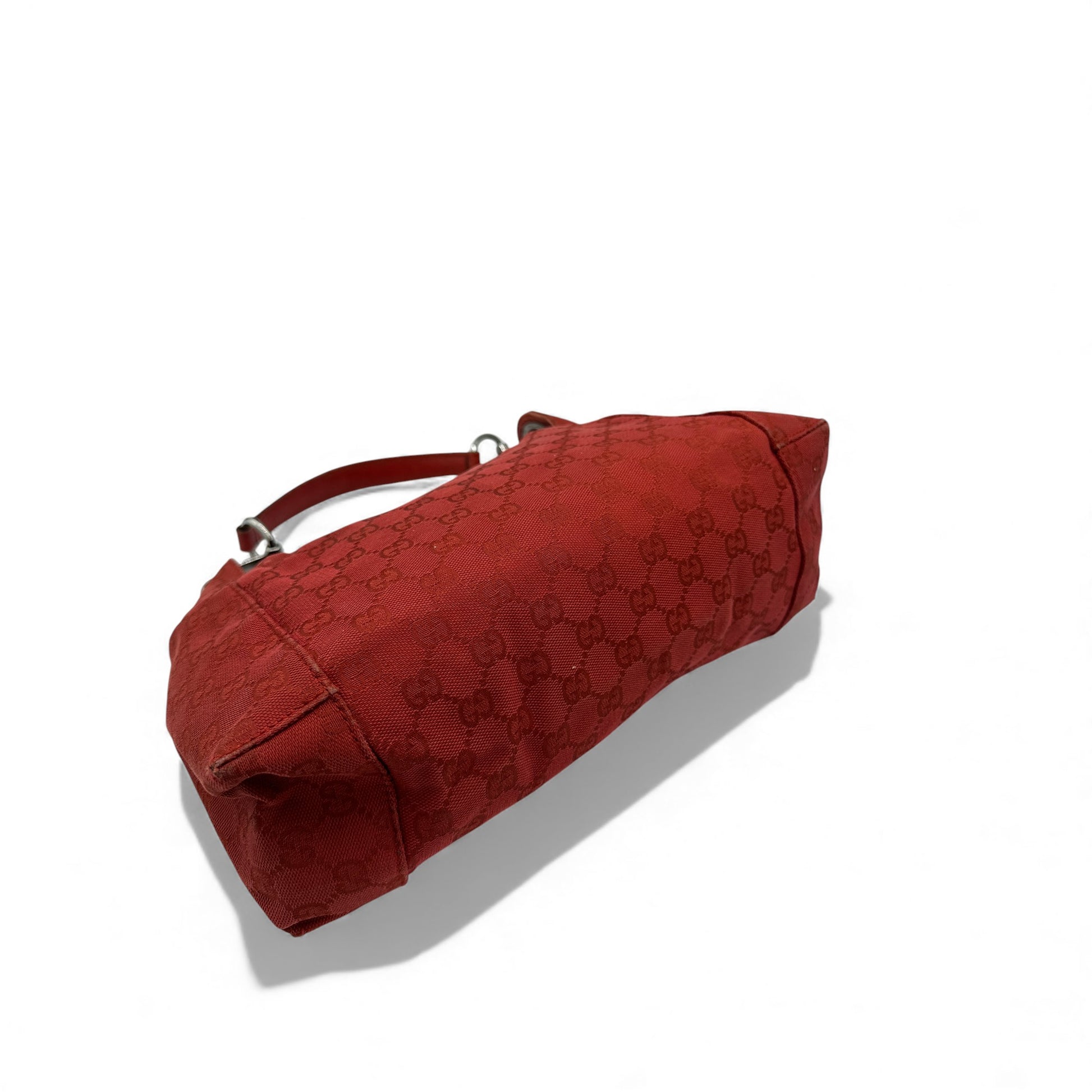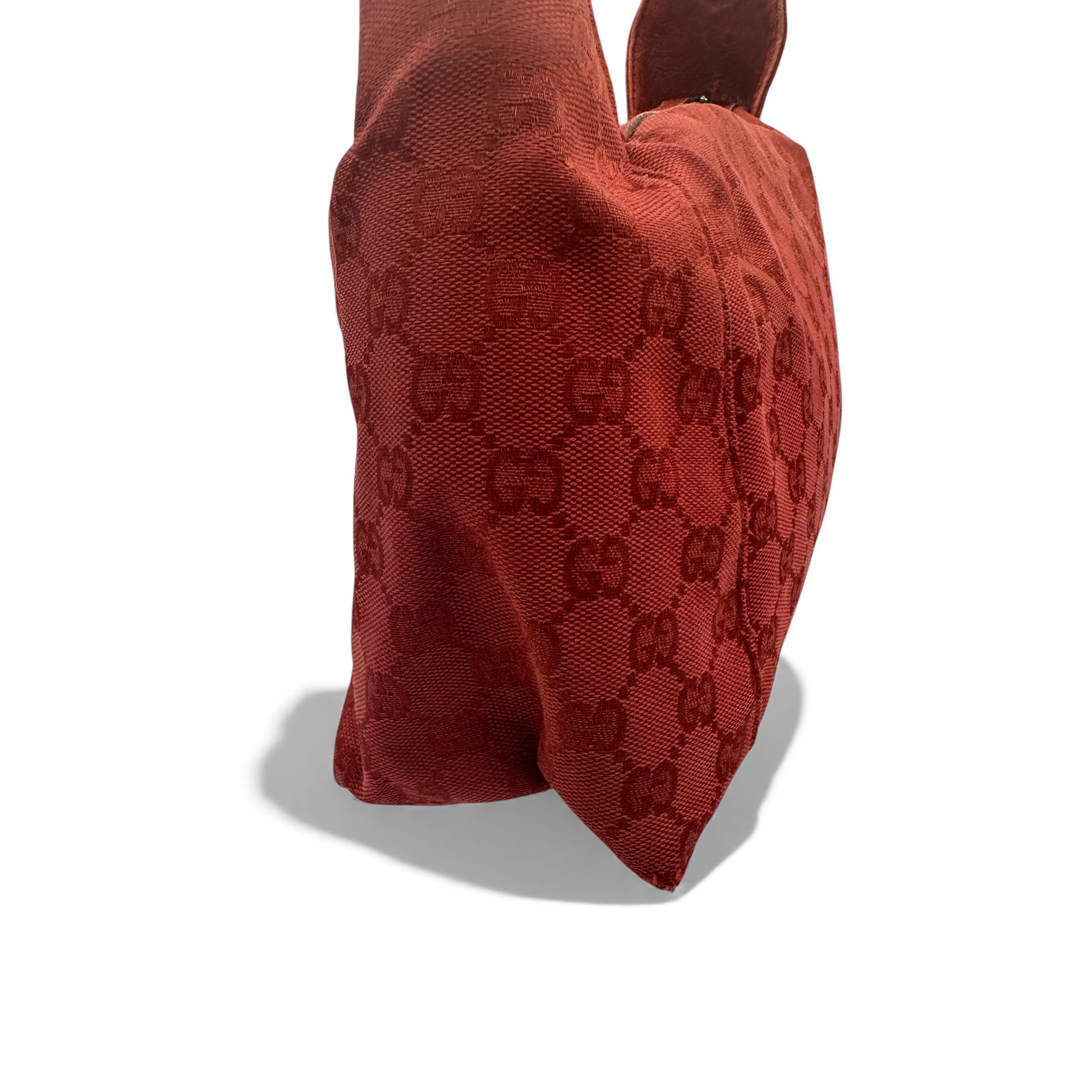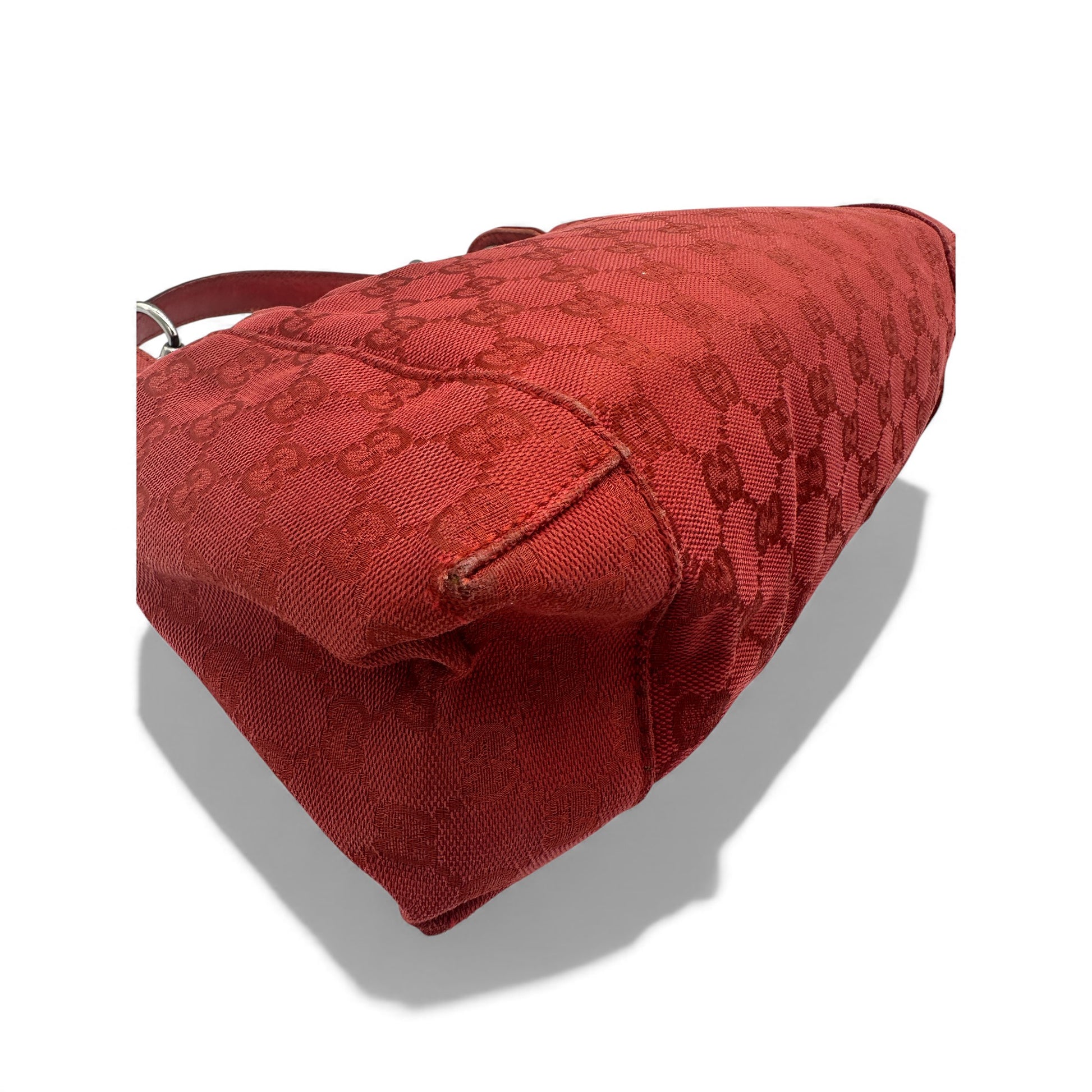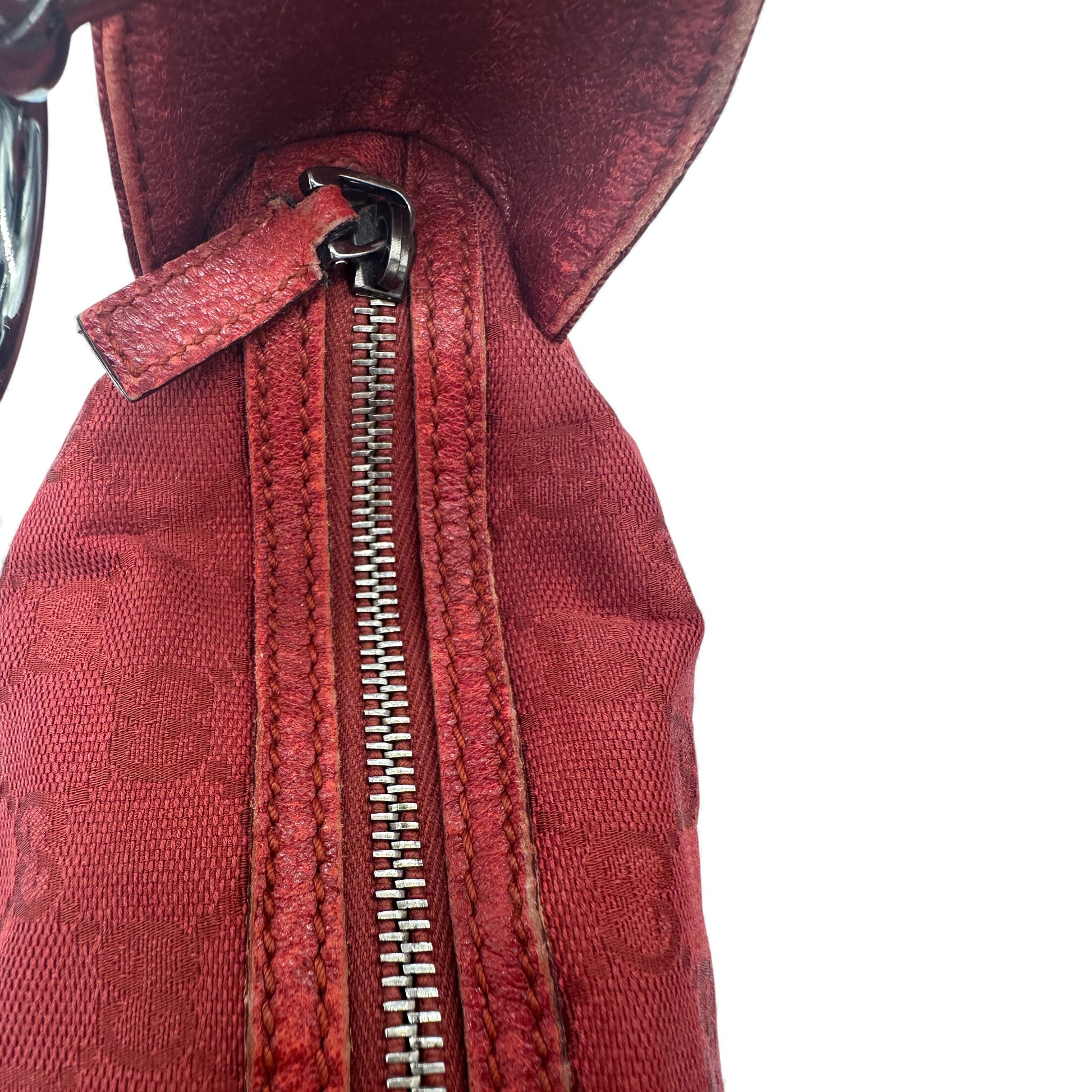 Vintage Gucci 113023 GG Canvas Shoulder Hobo Bag in Burgundy red GG monogram with silver hardware & zip closure. The leather strap can be used either as a handbag or shoulder bag.