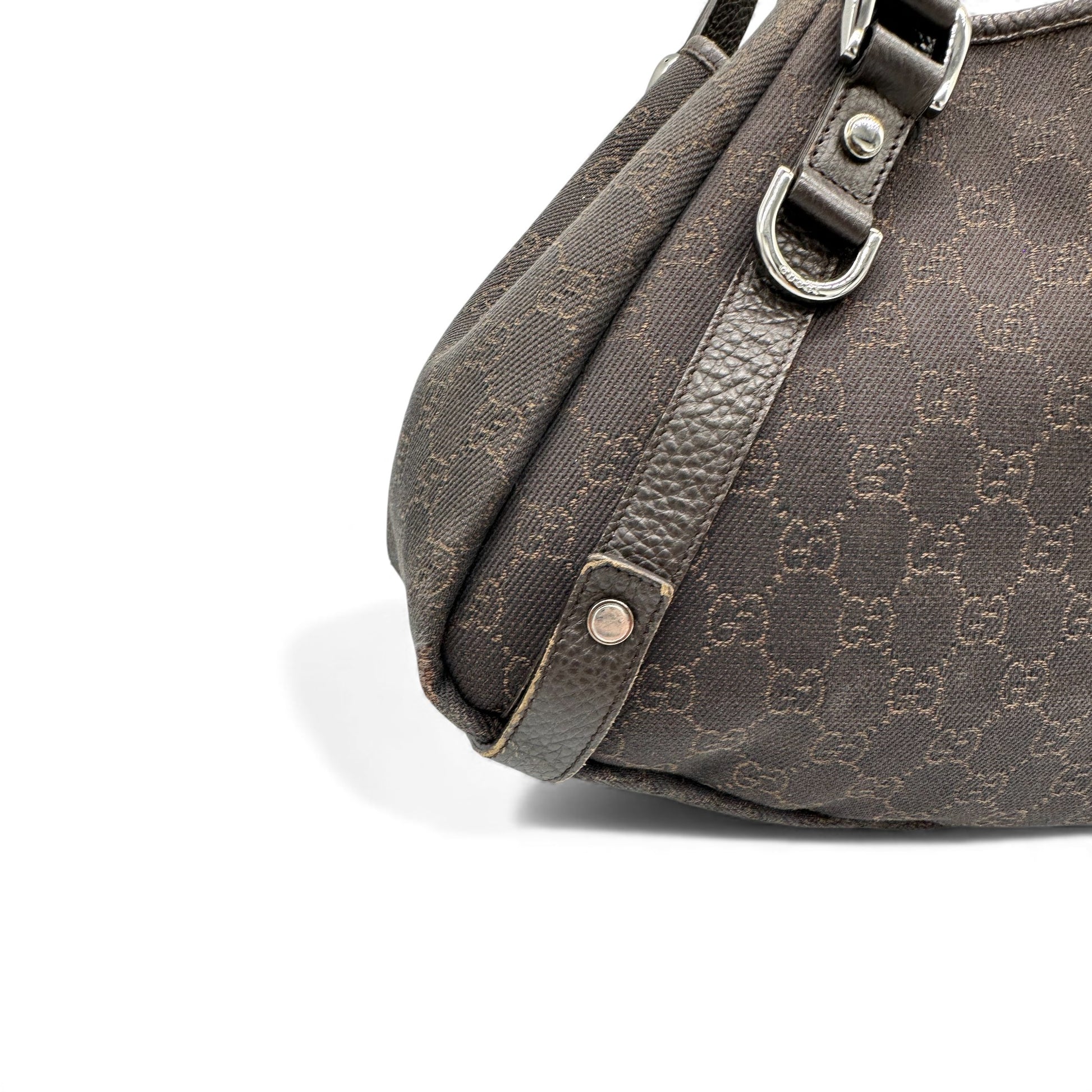 Model and style: Vintage Gucci Abbey 293578 Tote Shoulder Bag. In Chocolate Brown GG monogram, trimmed with brown leather and silver D-ring hardware. A large Gucci silhouette, with a strapped button closure.